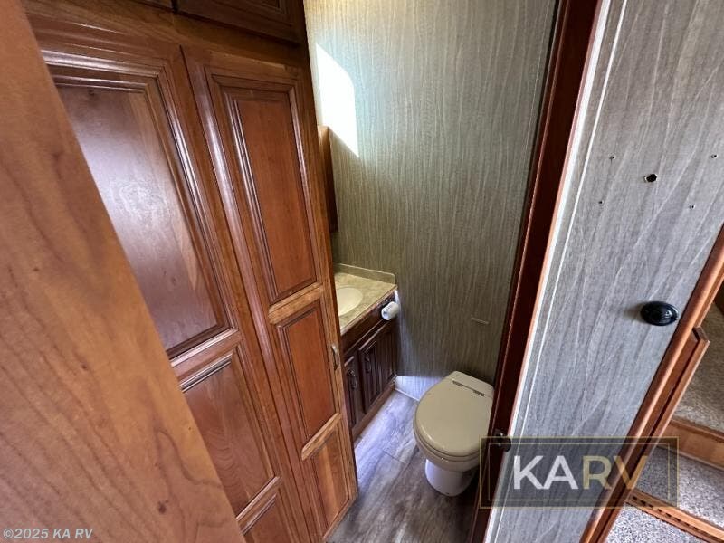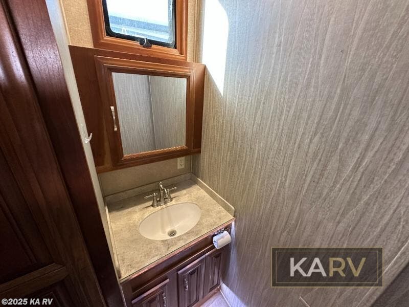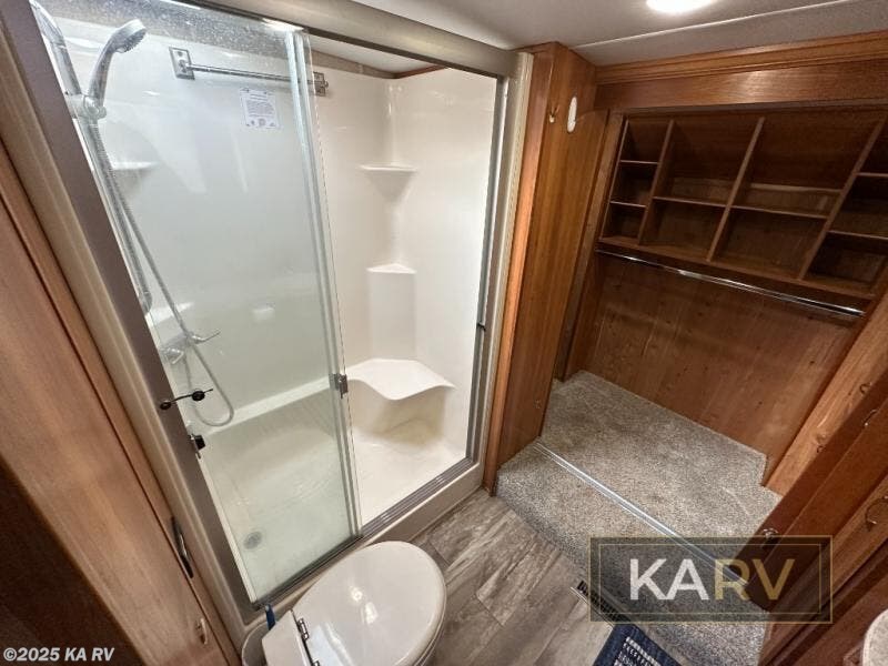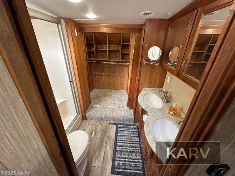 Head up the steps to the right and find a sliding door to the front master suite with king bed slide, vanity with drawers, and 32" TV plus overhead storage. A second sliding door leads into the master bath which features a tub/shower with skylight, toilet, and dual sinks with medicine cabinet above. Step up to a walk-in wardrobe with storage, and more.