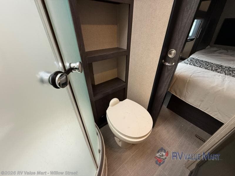 From the bedroom you can enter into the bathroom from the private entrance door. Inside the bathroom you will find a sink, medicine cabinet, toilet, and angle shower. The bathroom also has another entrance/exit door which takes you into the main living area of the trailer.