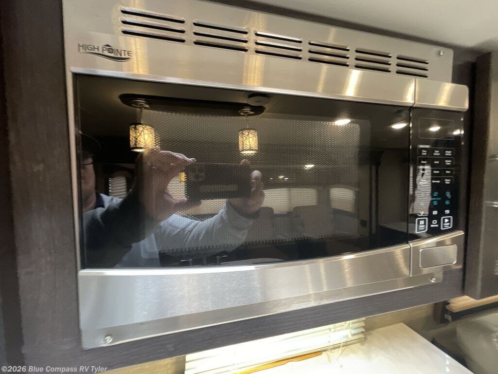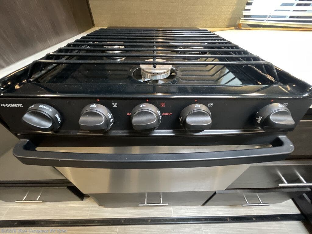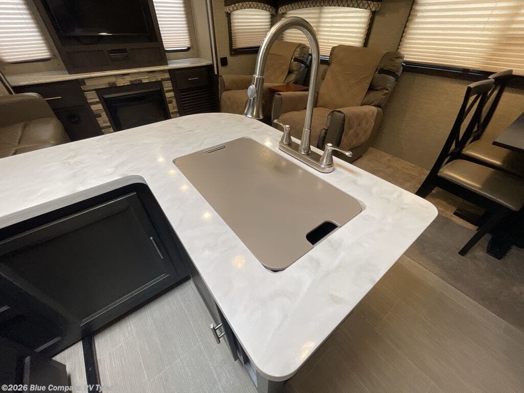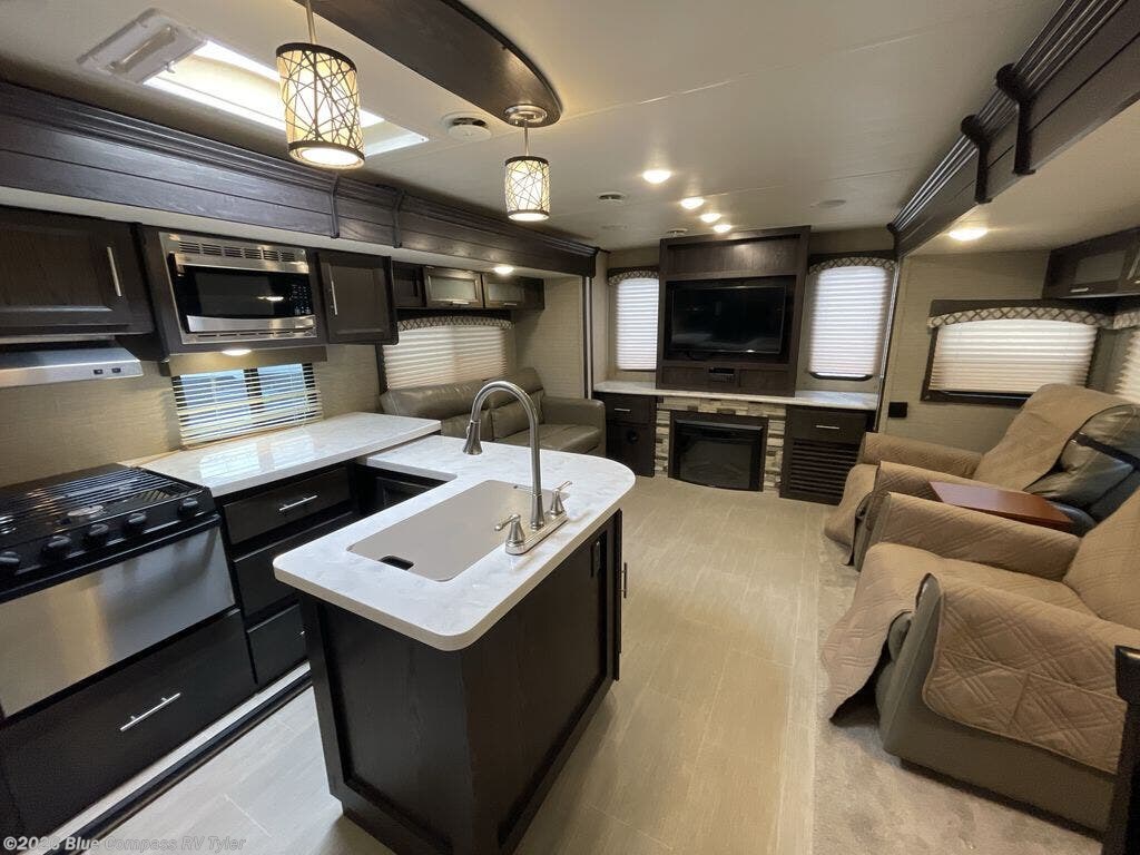 Enjoy cooking meals and preparing snacks in this Kodiak kitchen which provides ample counter space with an L-shaped counter including double sink, microwave, three burner range, and a refrigerator that slide out with a standard sofa toward the rear. There are plenty of overhead storage cabinets for dishes and things also.