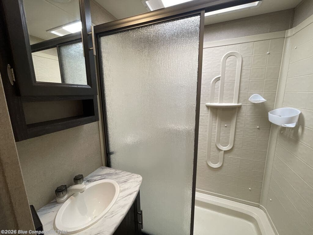 As you enter you will see a convenient bath straight ahead. The bath includes a shower with skylight, sink and toilet with overhead storage. To the right of the entry door there is a private bedroom with queen bed, two wardrobes, and an overhead storage cabinet.