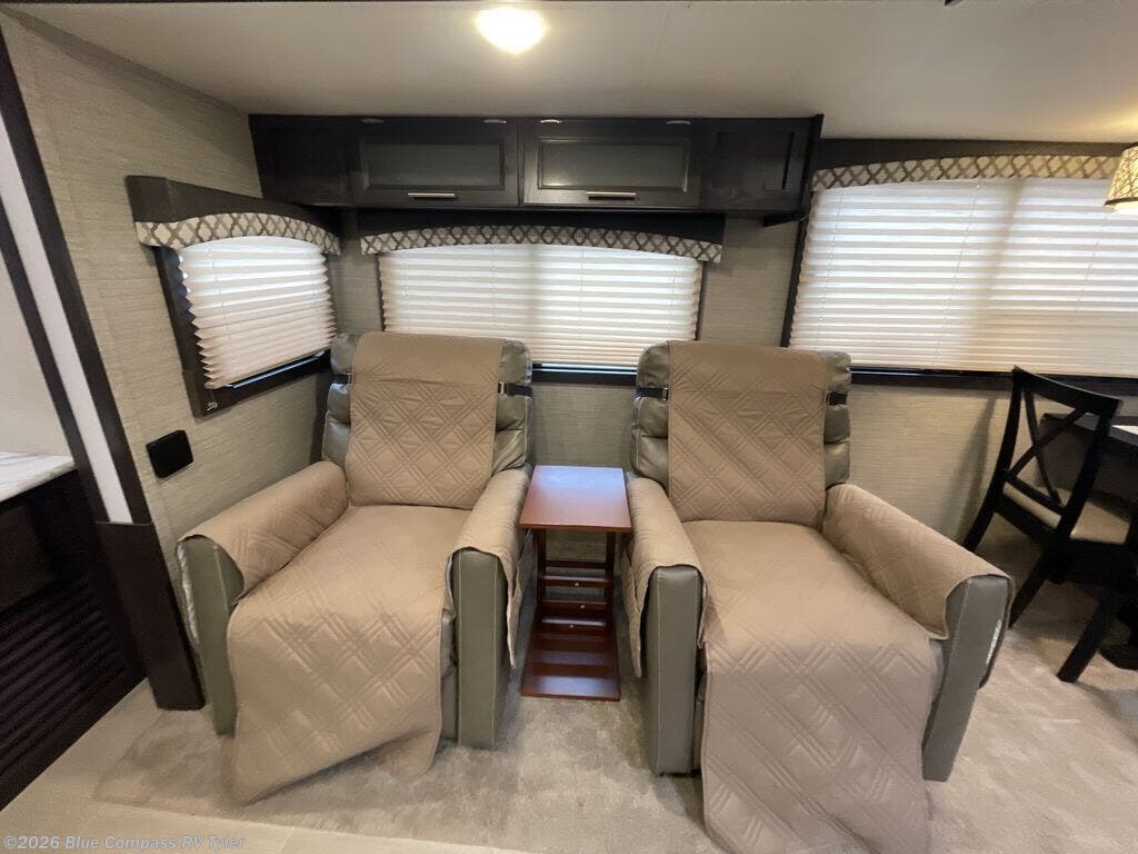 On the opposite side of the unit there is a 40" x 74" booth dinette and two lounge chairs with overhead storage.