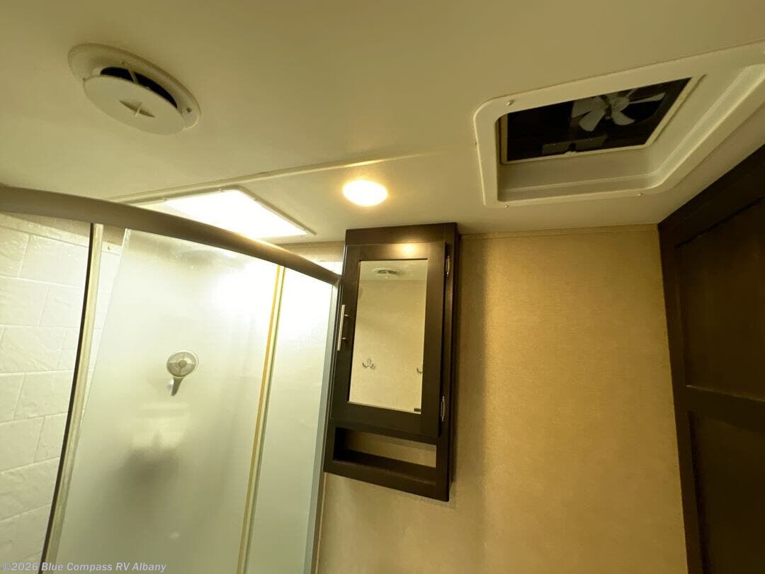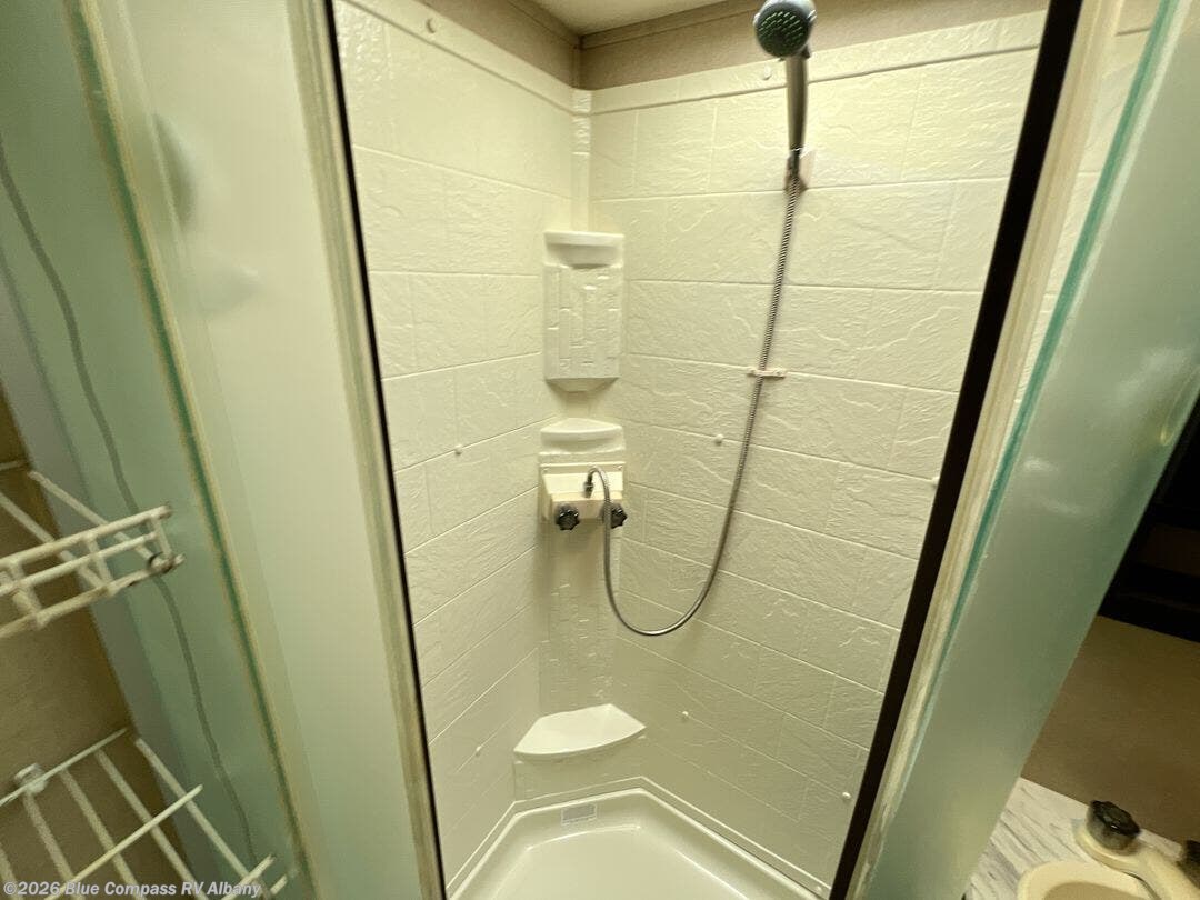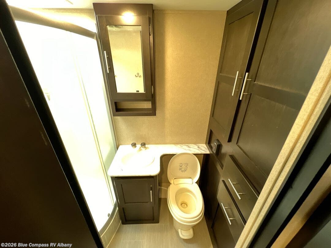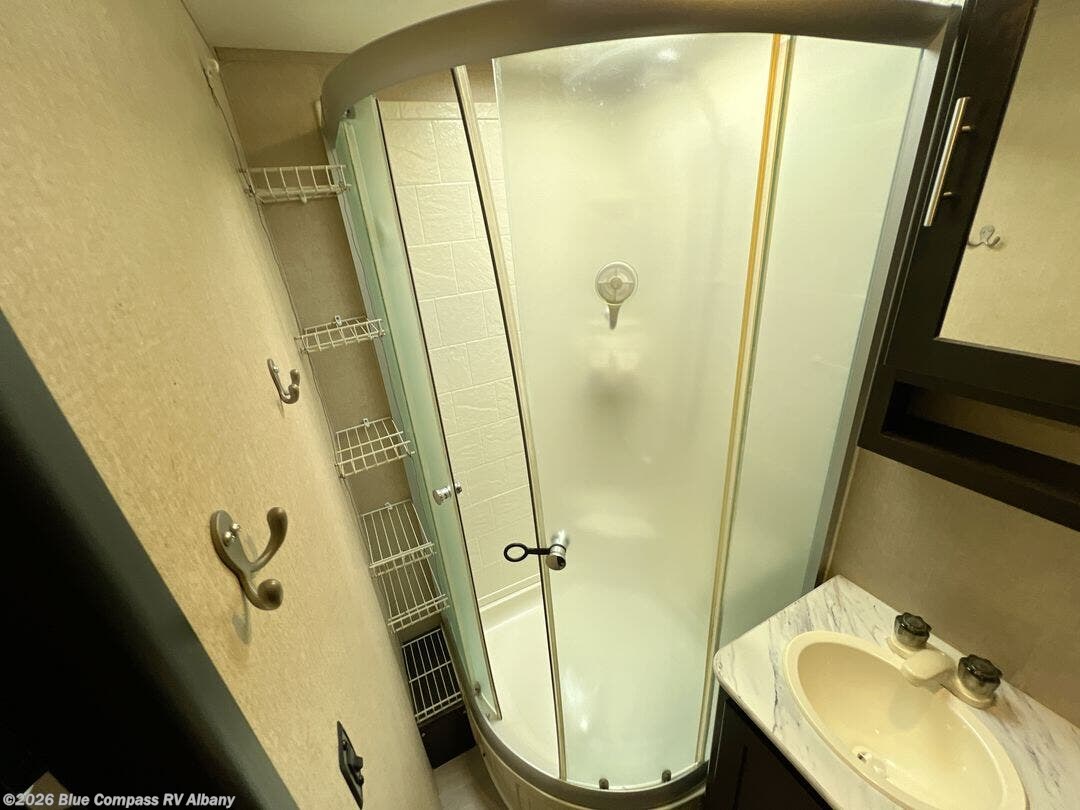 In the very rear there is a complete bath featuring a 34" angled shower, a vanity with sink, toilet, linen cabinet, and wardrobe.