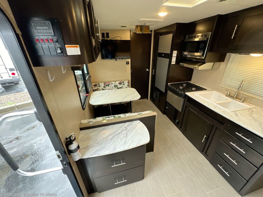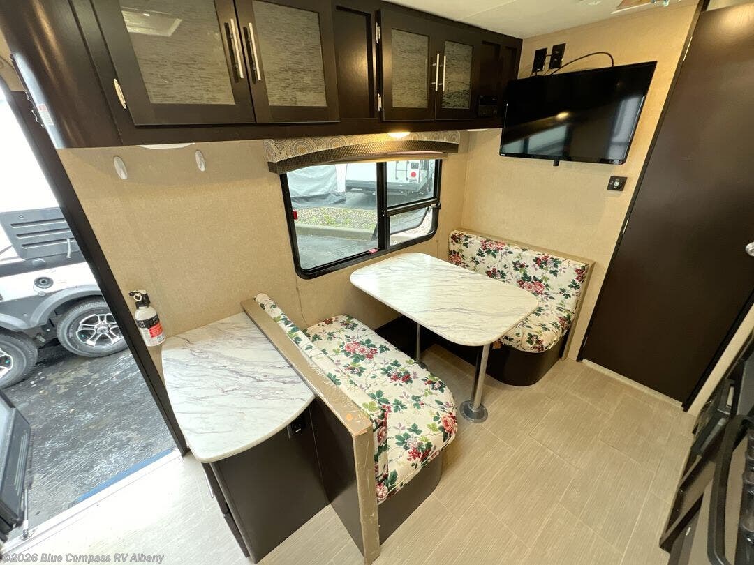 Enjoy dining at the booth dinette opposite the range, and to the left of the main entry door. There is additional storage space above to help keep things neatly tucked away and organized. The dinette can also easily be transformed into sleeping space for an extra camper if needed.