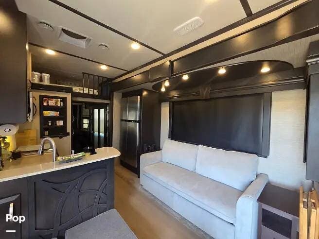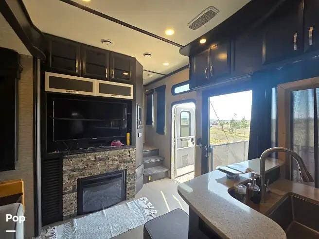 Inside, you'll find a beautifully finished interior with residential furnishings, solid-surface countertops, and LED lighting throughout. The main living area includes a queen sofa sleeper, a large entertainment center with a fireplace, and a gourmet kitchen complete with an island, convection microwave, and 18 cu. ft. residential refrigerator.
