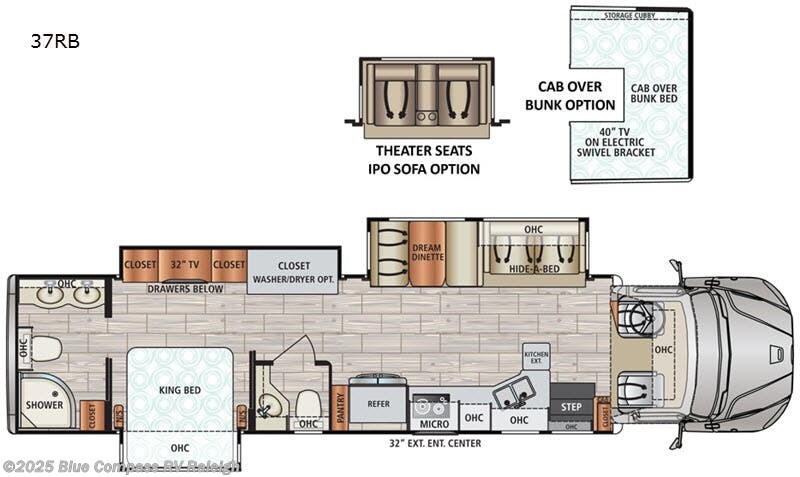 Been daydreaming about traveling the countryside but you don't want to leave any amenities at home. From a full kitchen with a 22 cu. ft. residential refrigerator and a gas range to a closet prepped for a washer and dryer if you add that option, there are several features you will love about this coach. The Dream dinette and hide-a-bed sofa slide out even offer extra sleeping space. Just imagine enjoying the great outdoors while watching the big game on the wall-mounted entertainment center with a 32" LED TV. You can get ready for bed in the rear master bath which includes his and her sinks, now that's luxury on wheels. And the half bath is handy when you invite overnight guests. There are many more features to see, and a few options you might like to add.