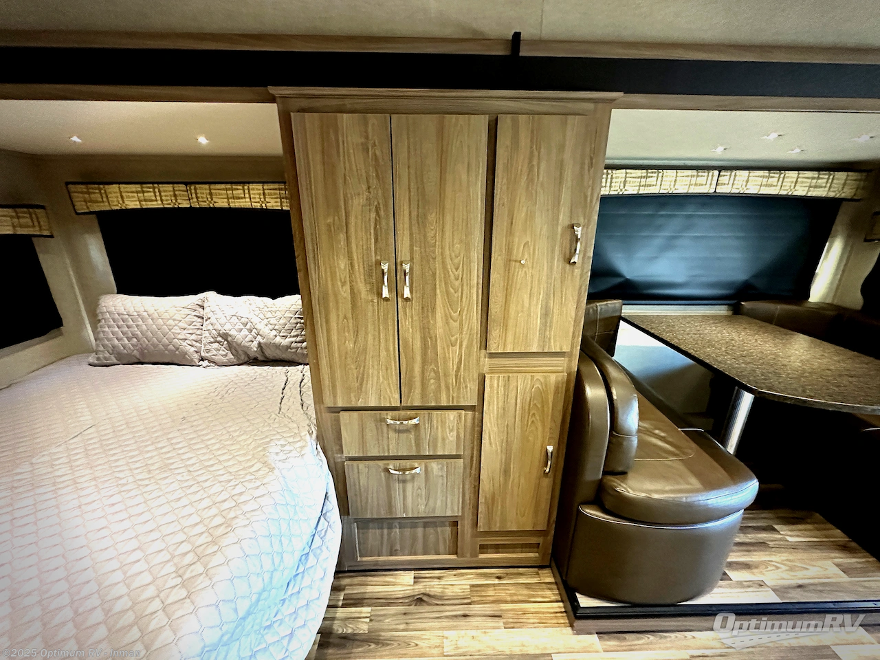 Step inside just behind the front passenger seat and find an overhead cabinet above the door. Above the cab you will find a 32" LED TV as well as overhead cabinets. There is a full wall slide out along the driver's side which creates a nice open feel inside. The slide contains a booth dinette, pantry, wardrobe, and queen size bed.