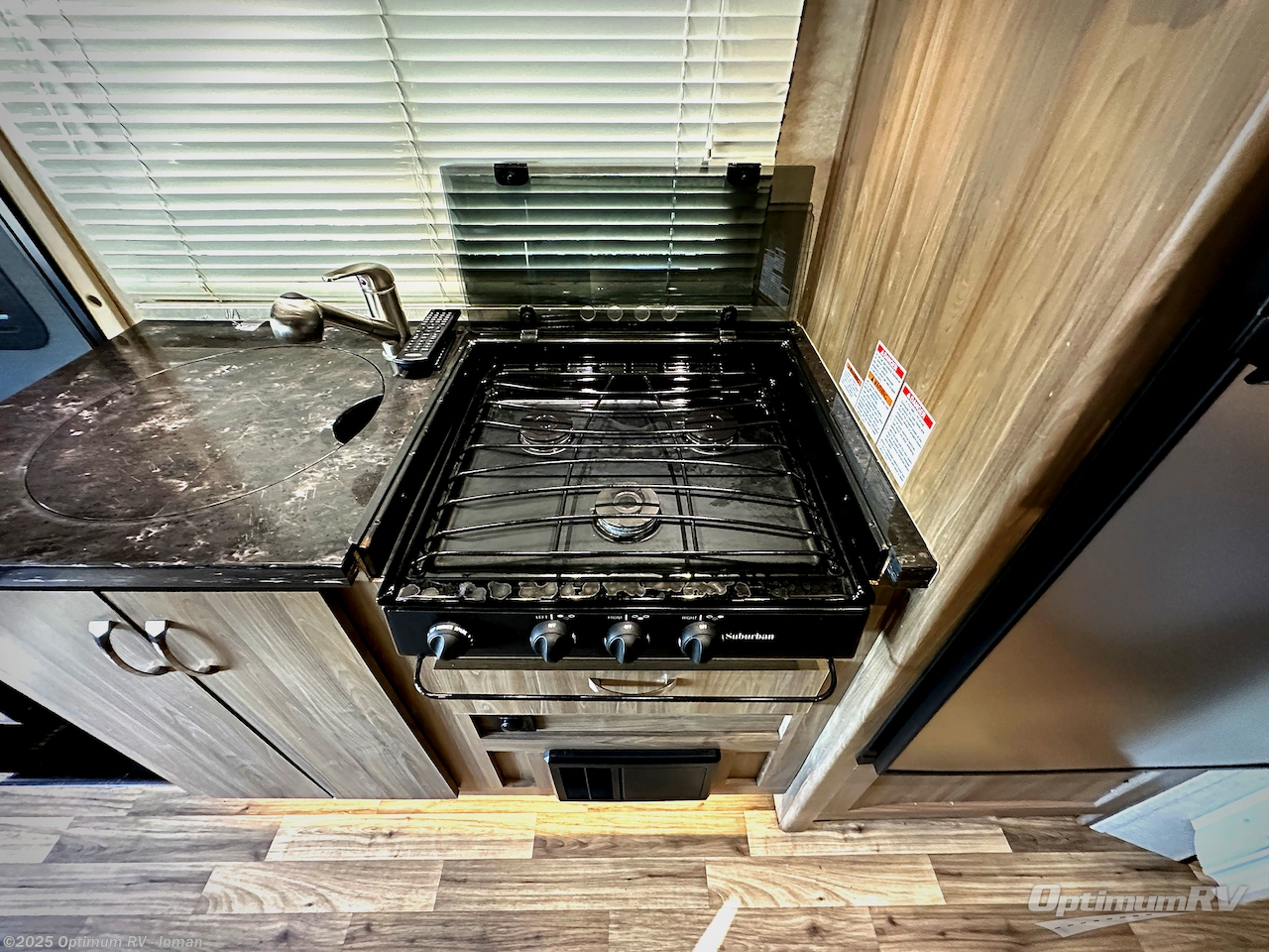 To the left of the main entry door you will find the kitchen appliances which include a round single bowl sink, a three burner range with overhead microwave oven, and a refrigerator. There is also overhead storage for dishes and things you might need. Here you can easily create great meals and snacks while on the move!