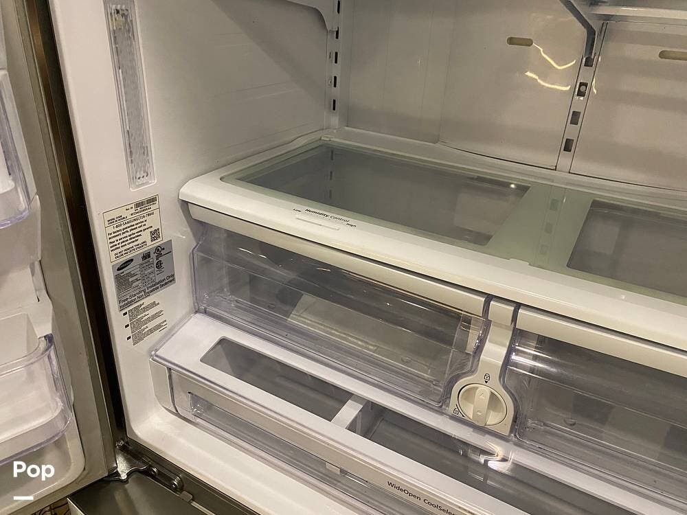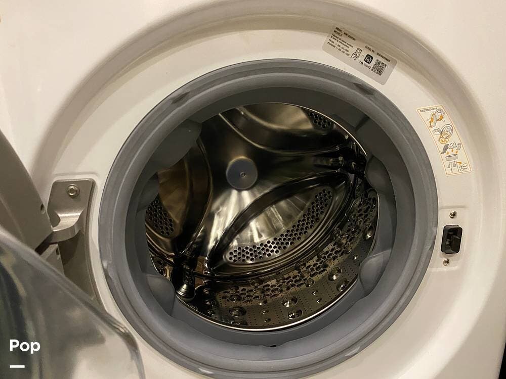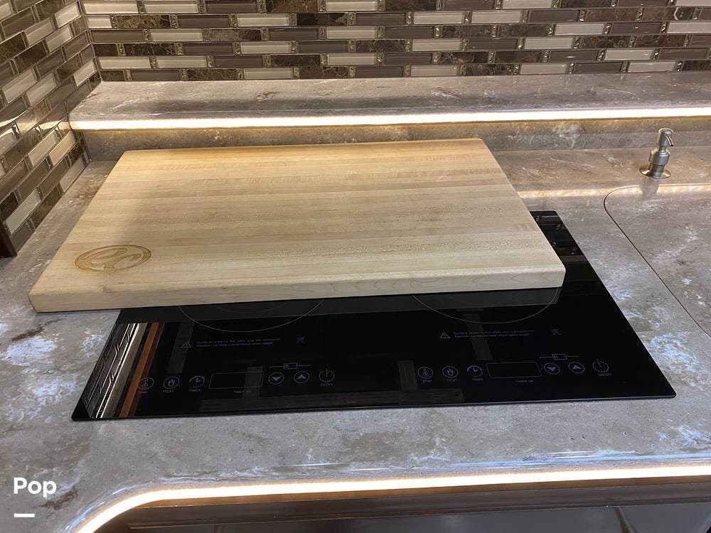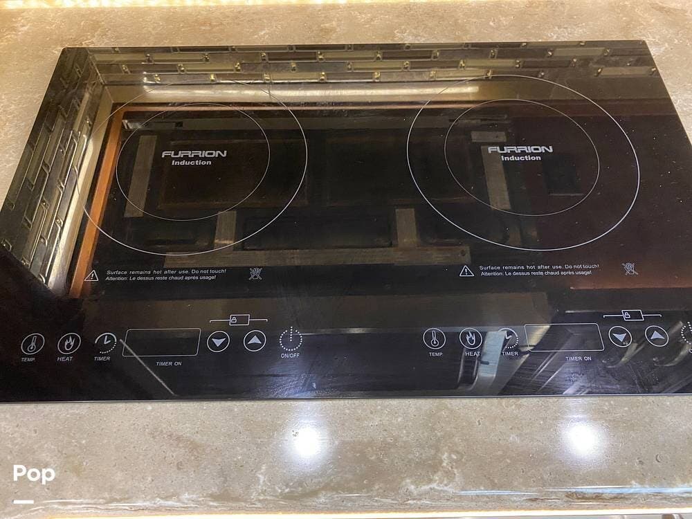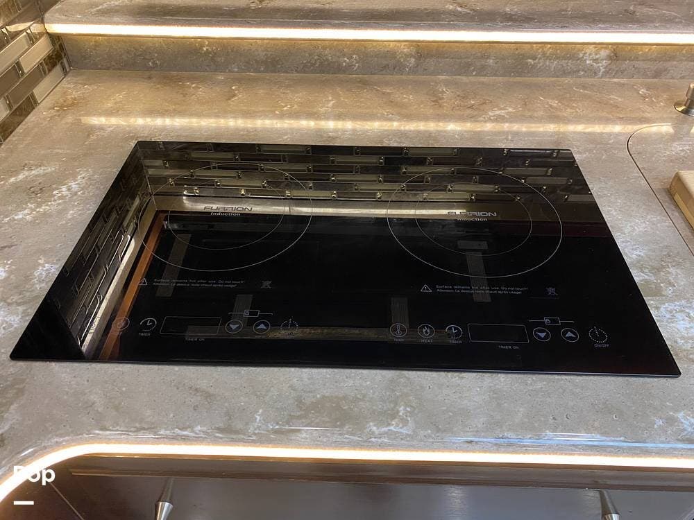 At the center, the kitchen offers a residential refrigerator, induction cooktop, convection microwave, dishwasher, and ample cabinetry, complemented by a free-standing dinette. A half bath is conveniently located off the main living space.