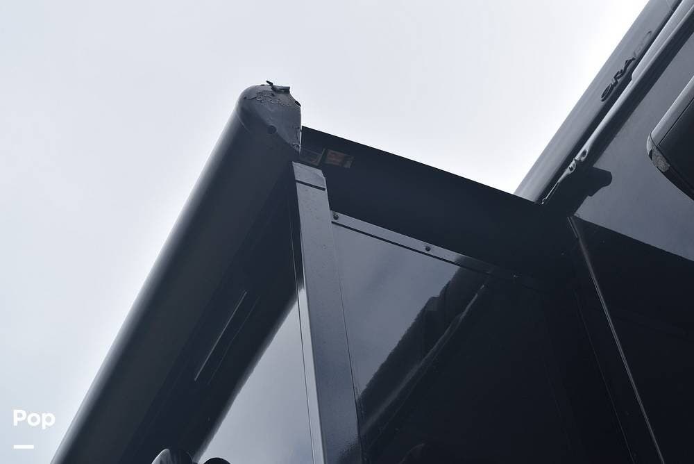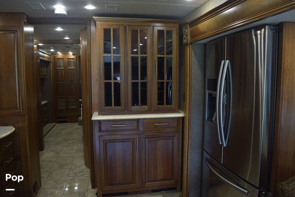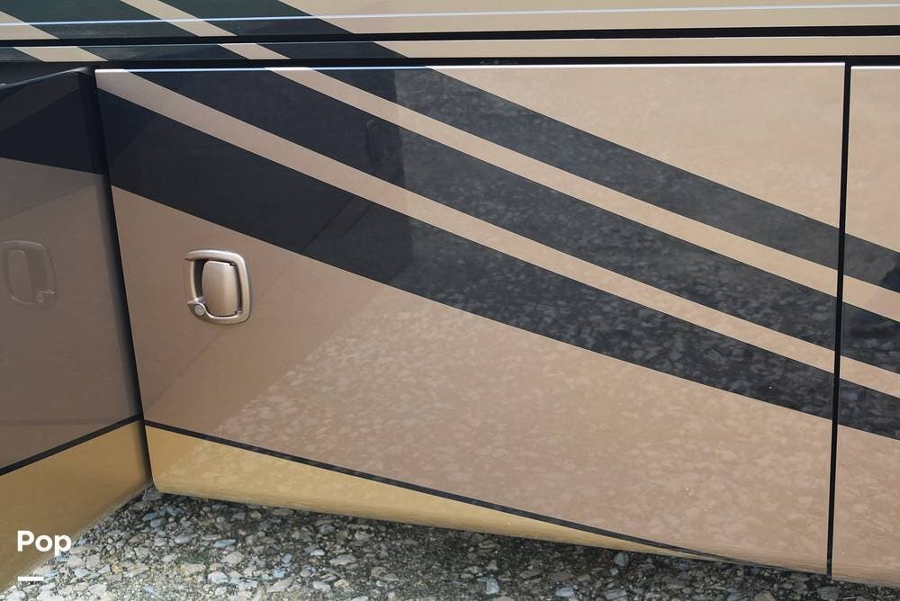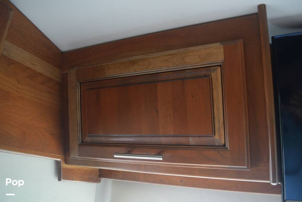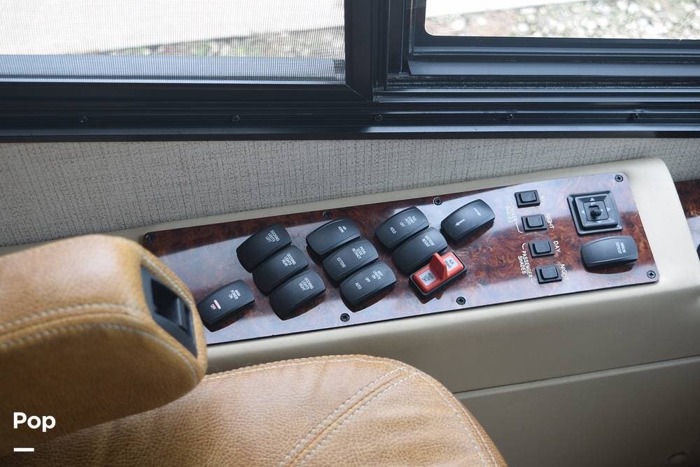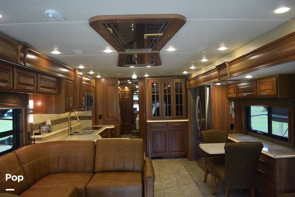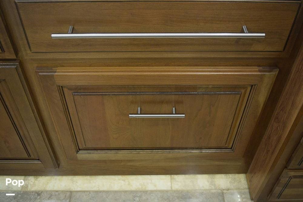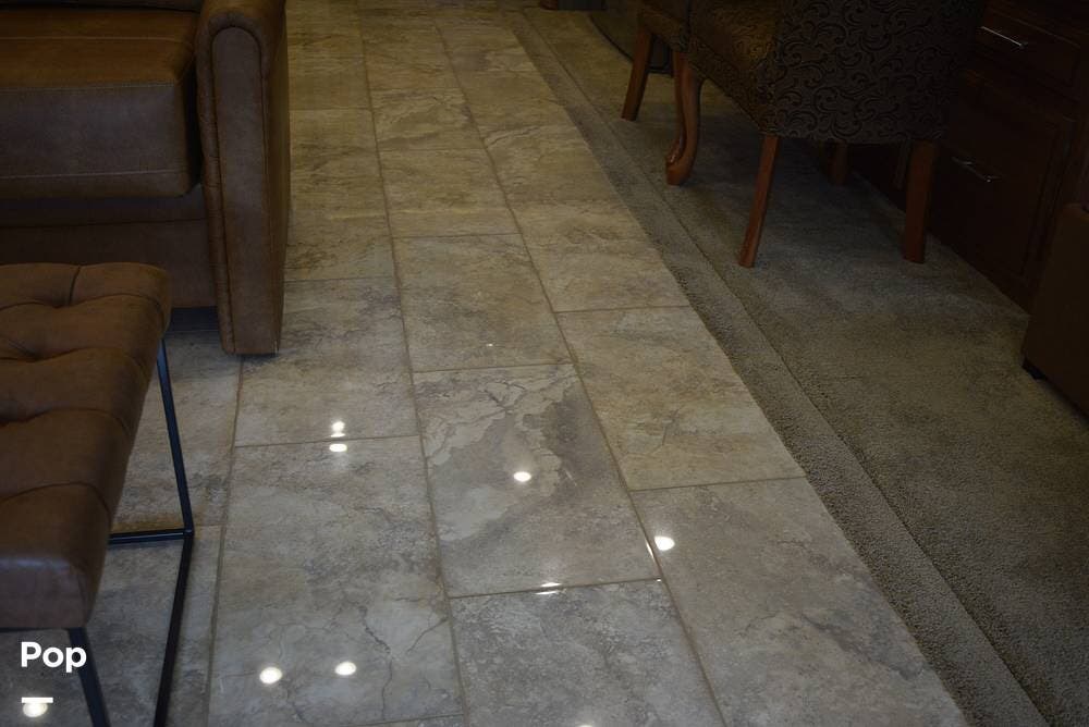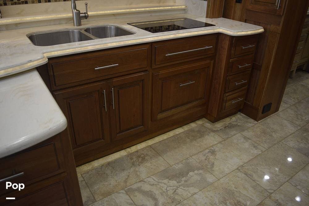 Step inside to find a spacious, beautifully appointed interior featuring premium hardwood cabinetry, solid-surface countertops, heated tile floors, and luxurious leather furnishings.