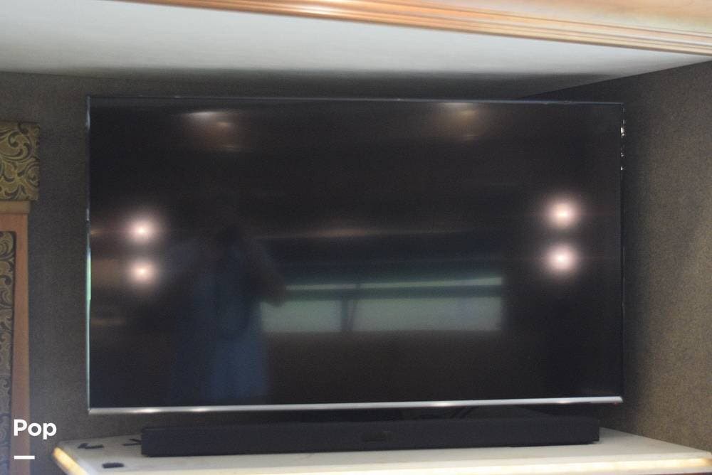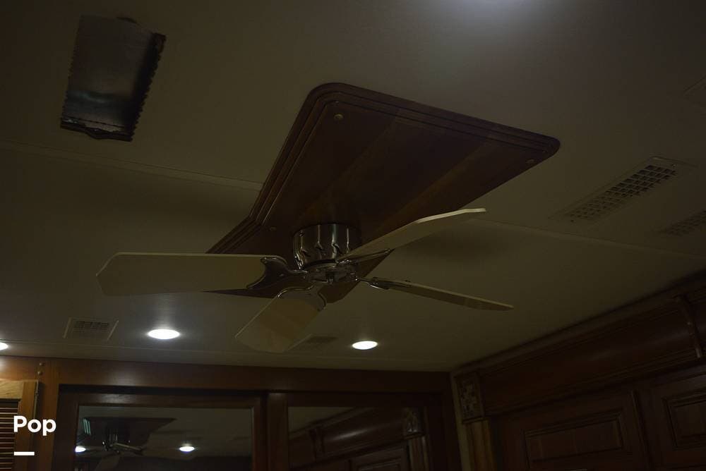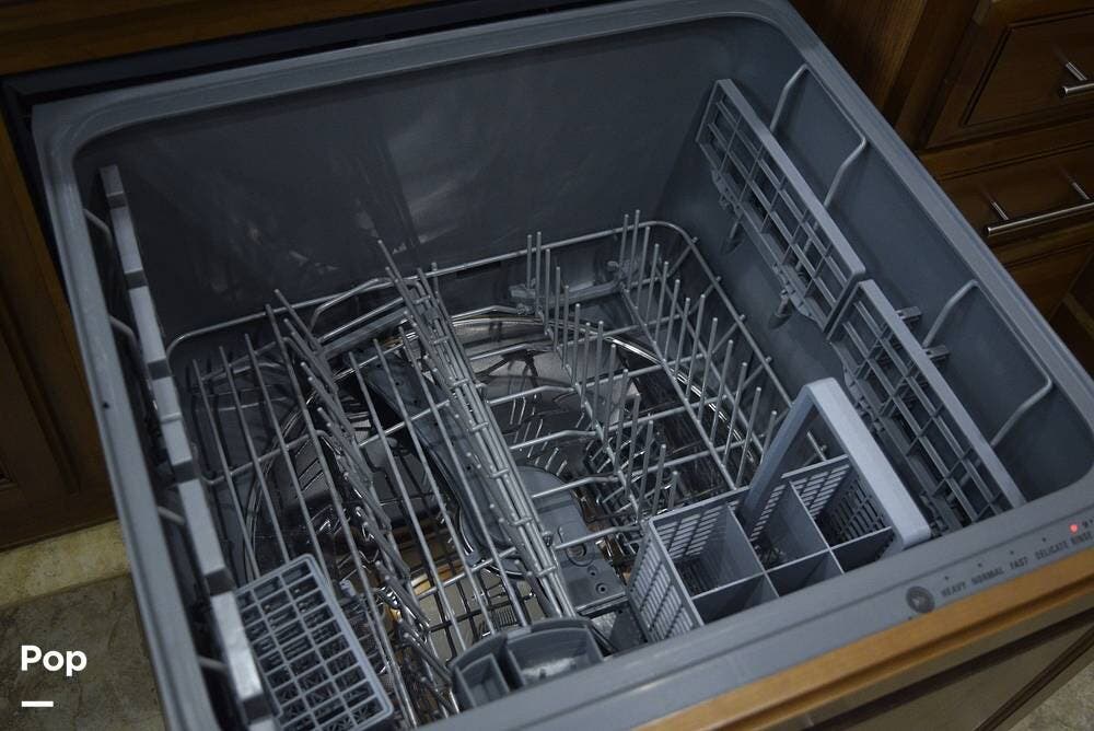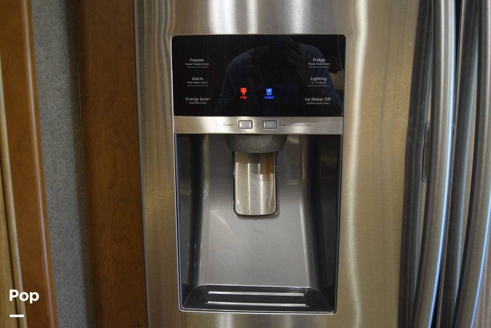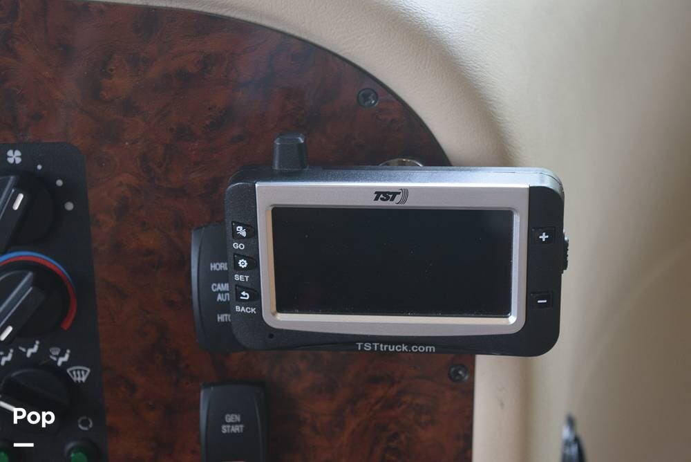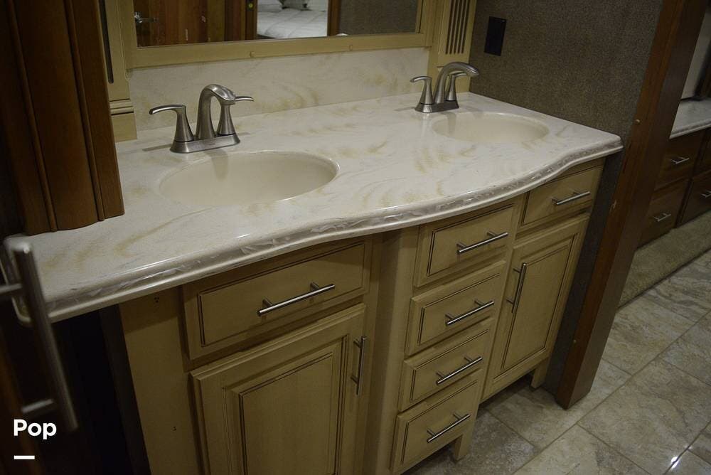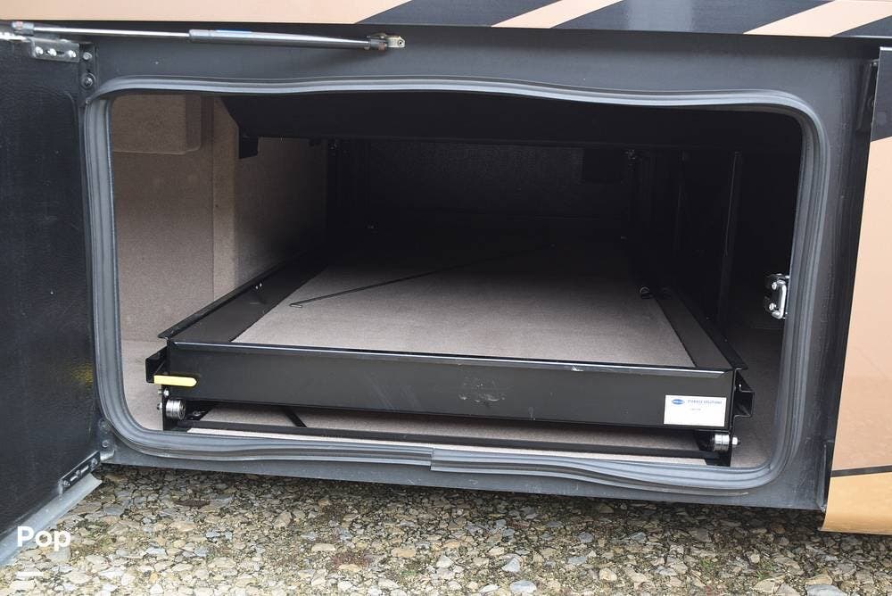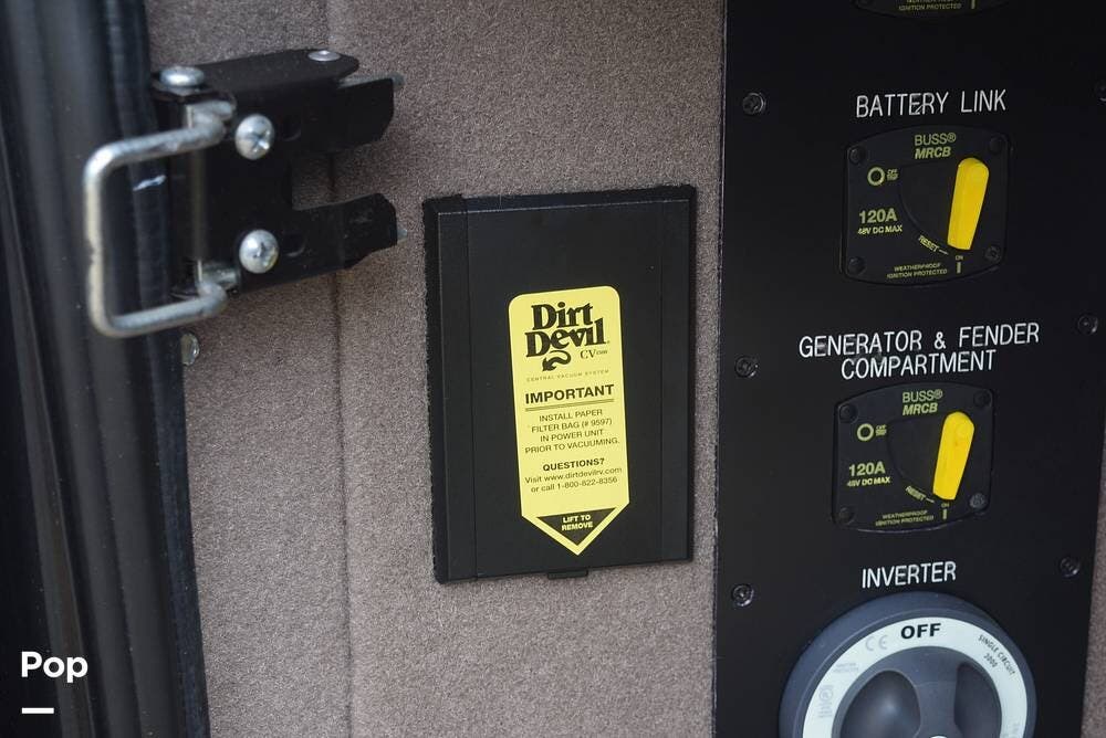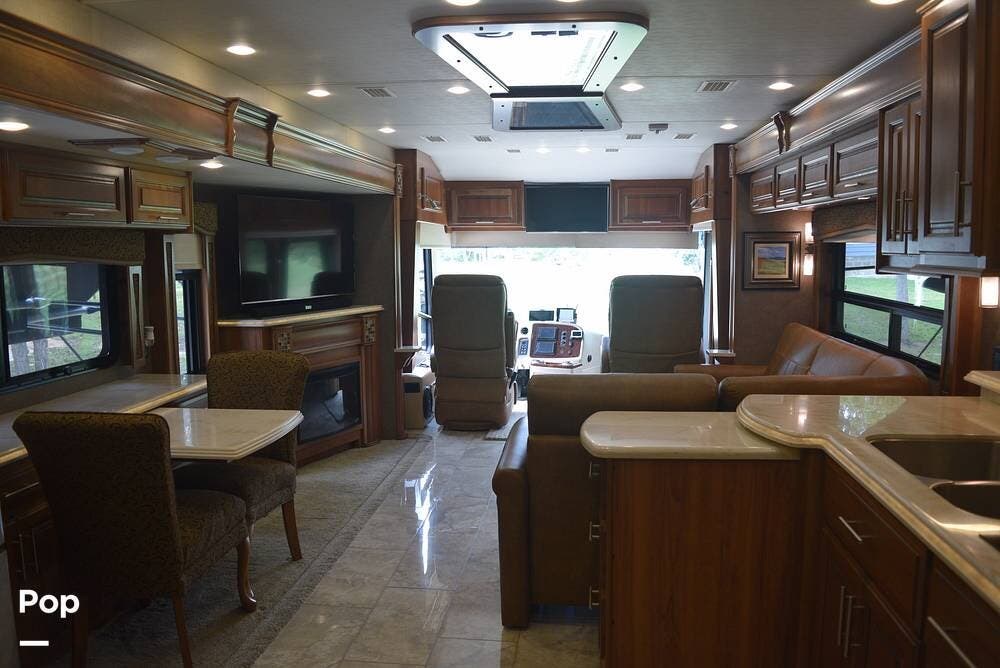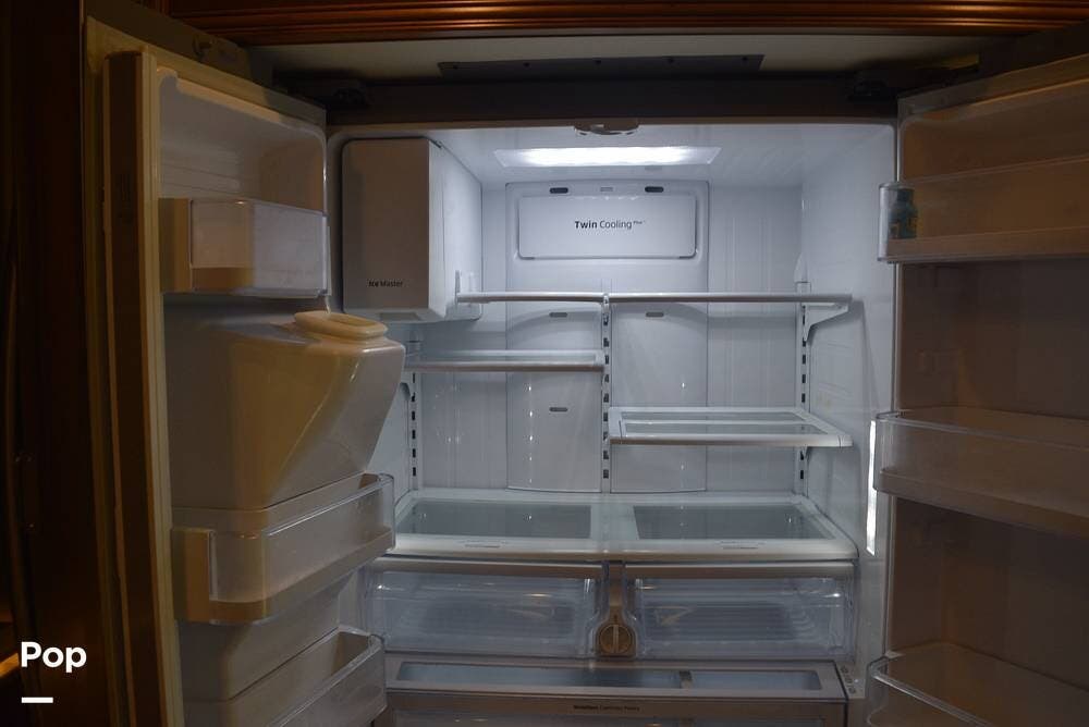 Step inside to find a spacious, beautifully appointed interior featuring premium hardwood cabinetry, solid-surface countertops, heated tile floors, and luxurious leather furnishings.