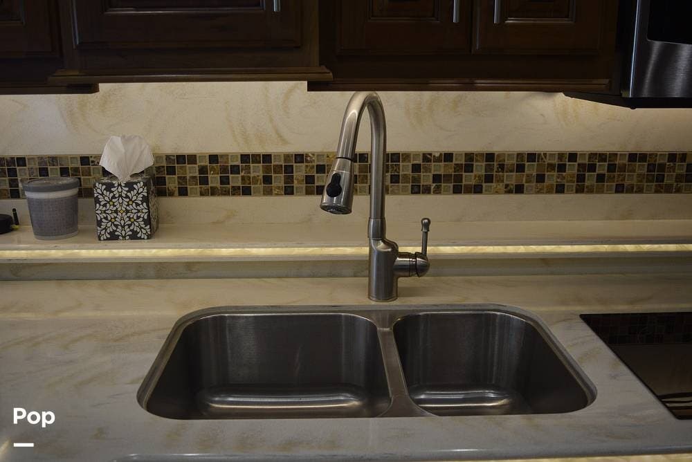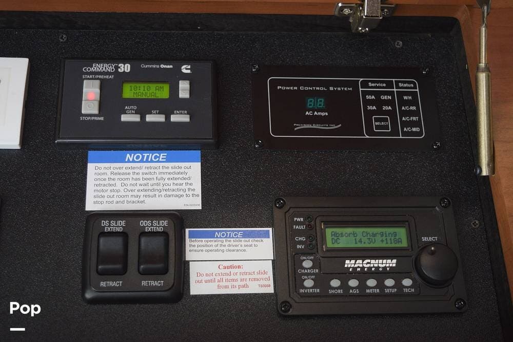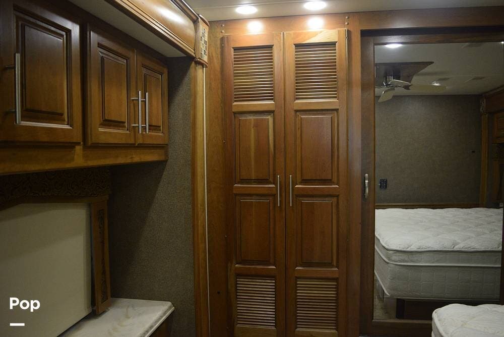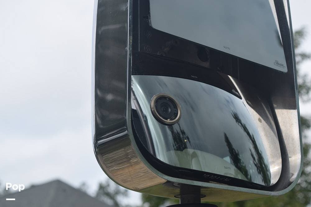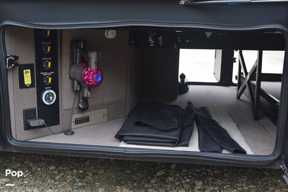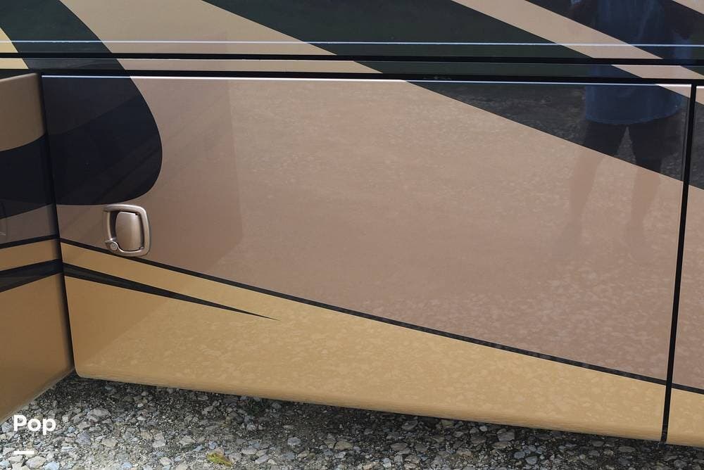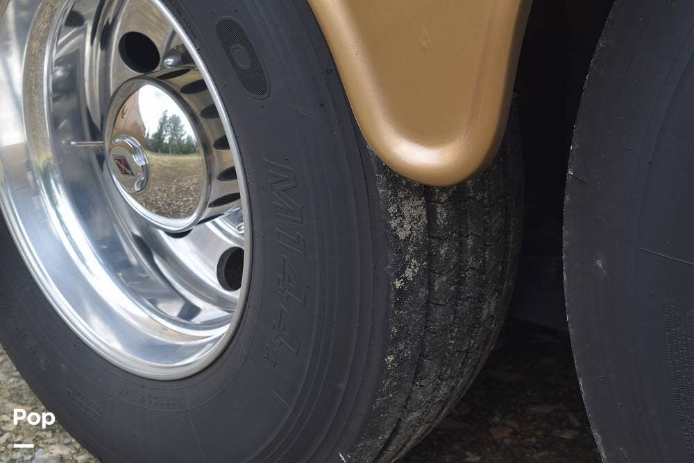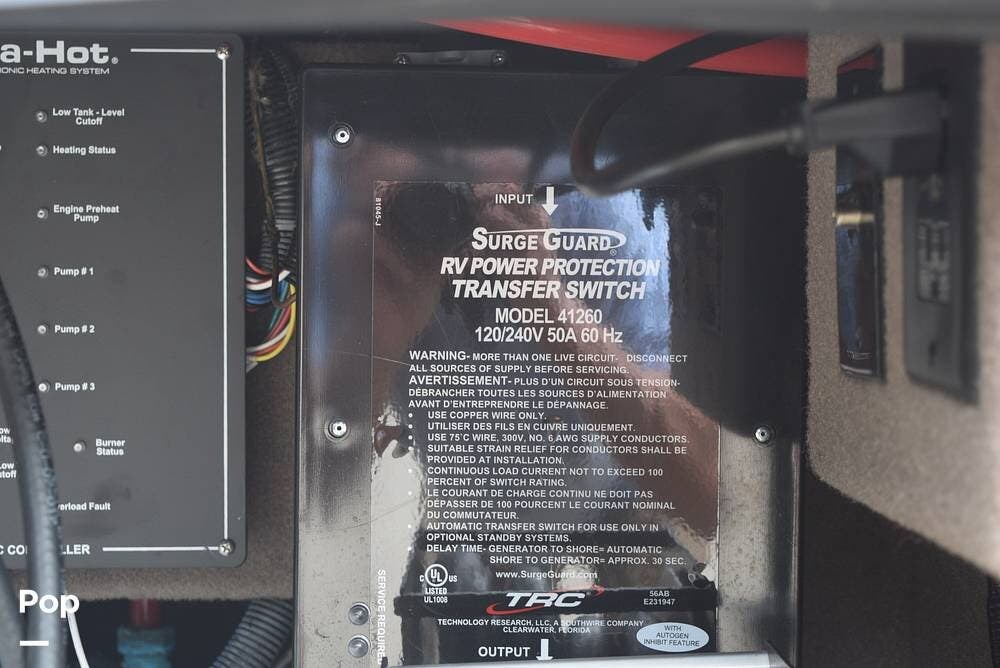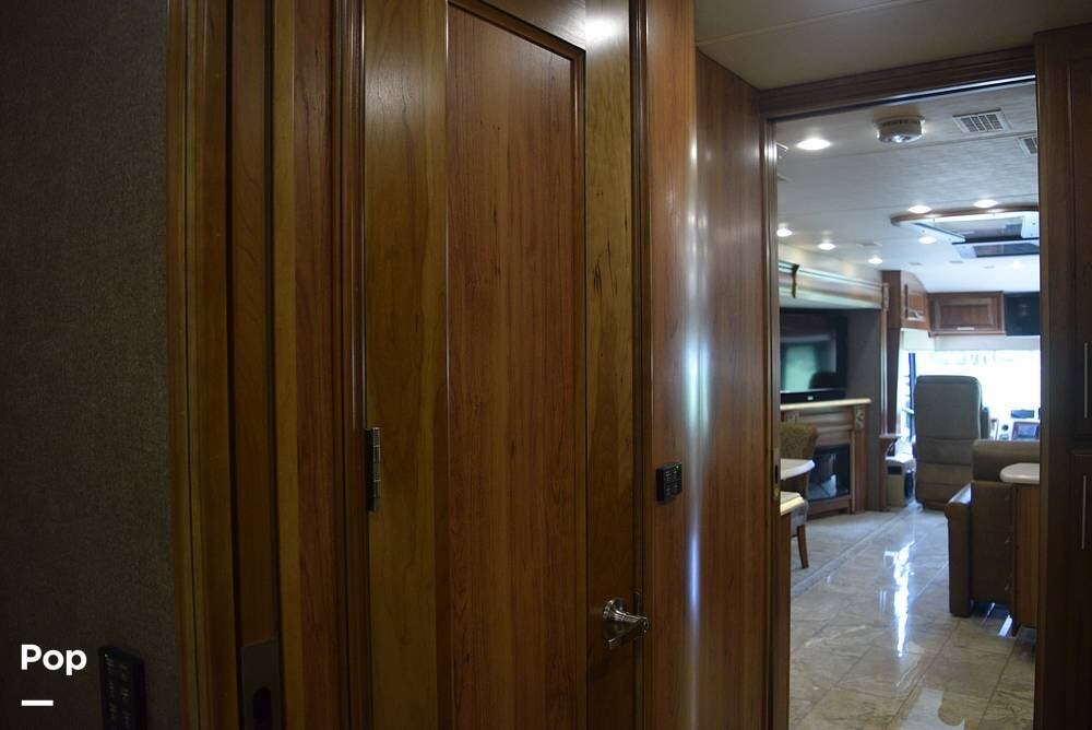Step inside to find a spacious, beautifully appointed interior featuring premium hardwood cabinetry, solid-surface countertops, heated tile floors, and luxurious leather furnishings.