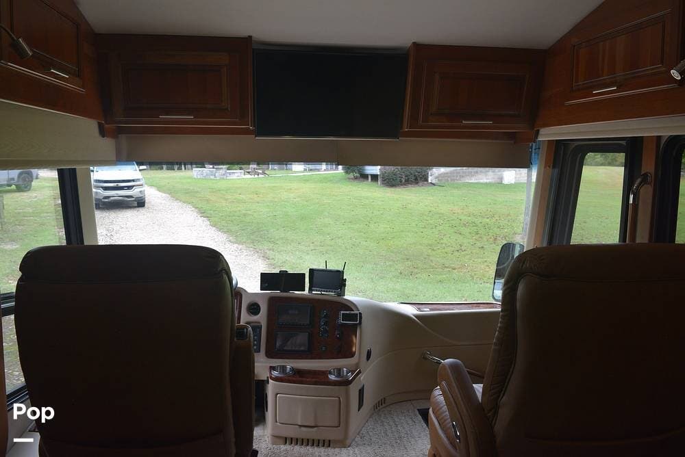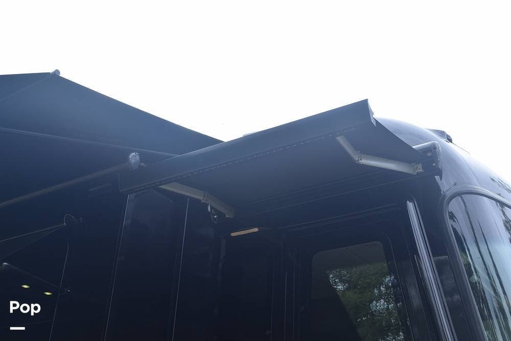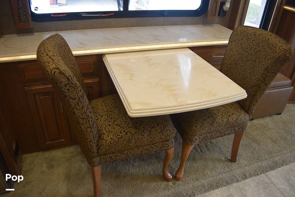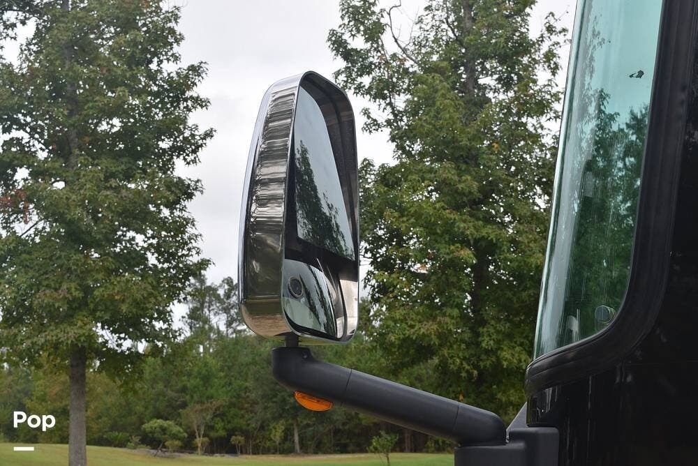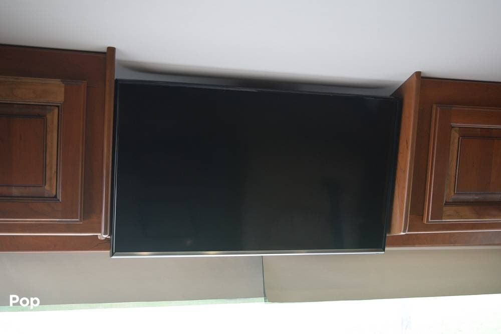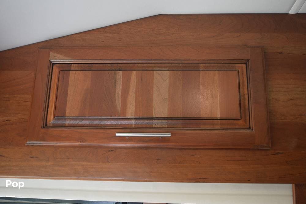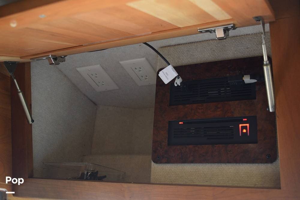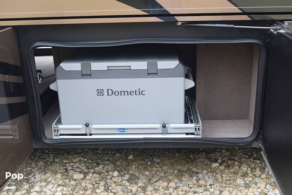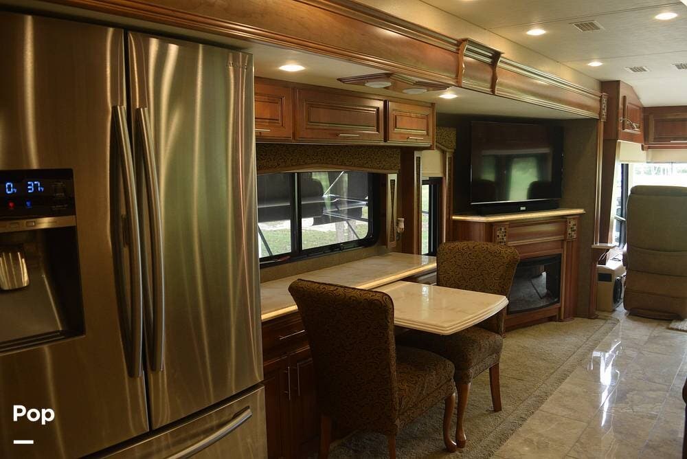Step inside to find a spacious, beautifully appointed interior featuring premium hardwood cabinetry, solid-surface countertops, heated tile floors, and luxurious leather furnishings.