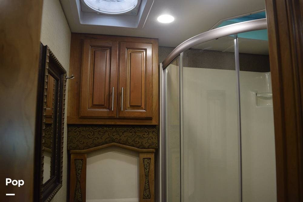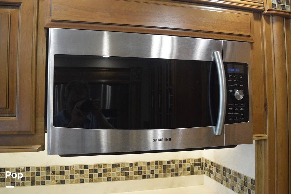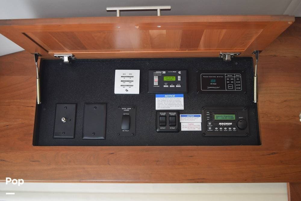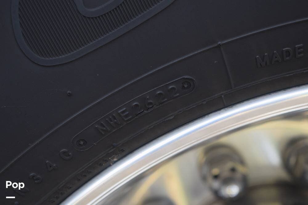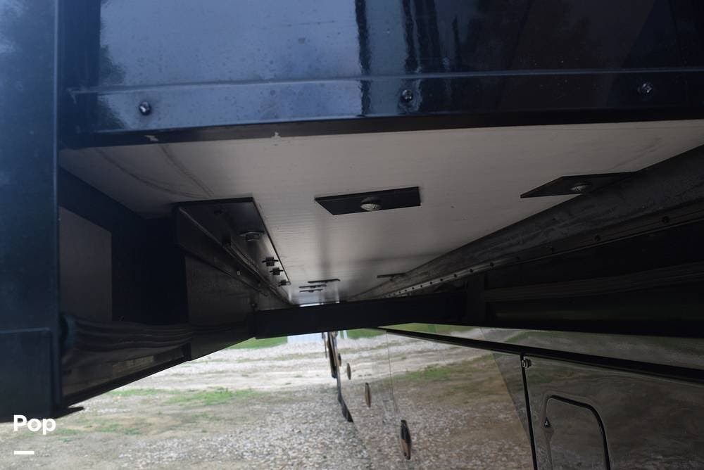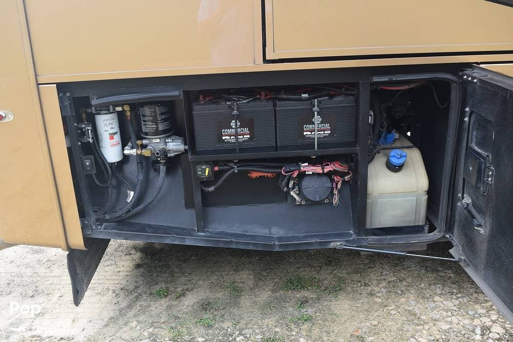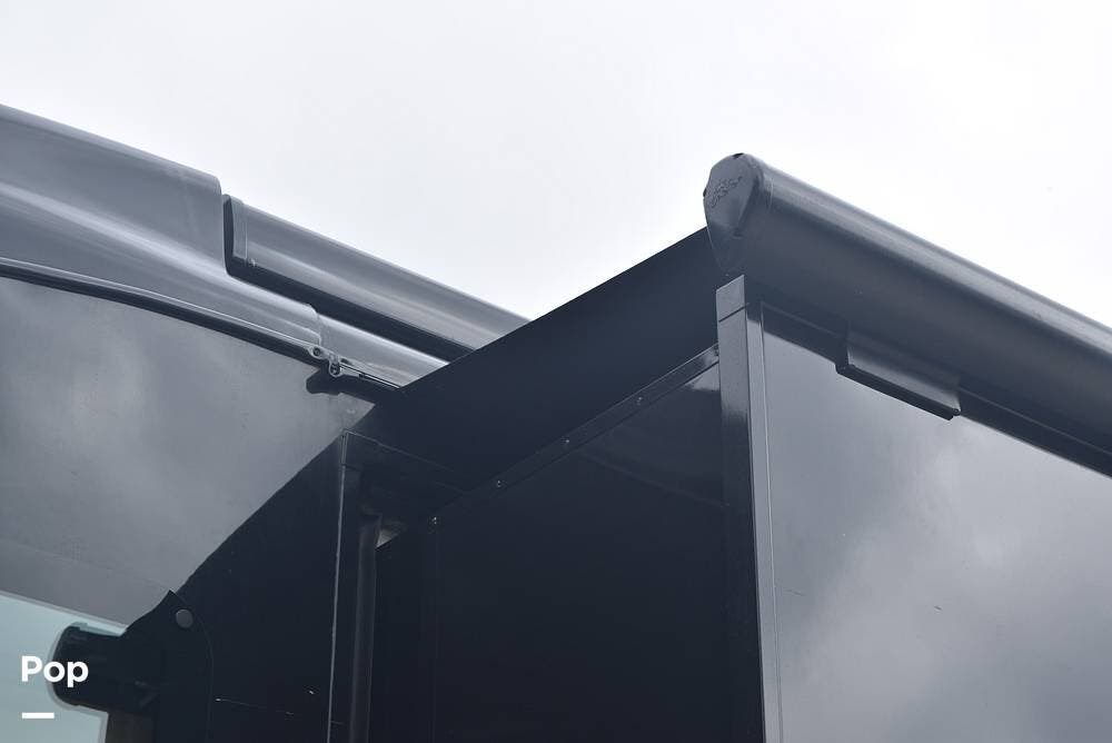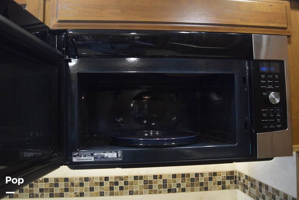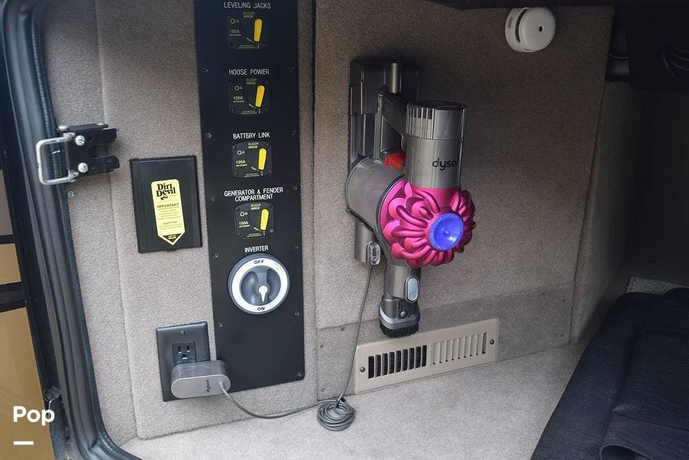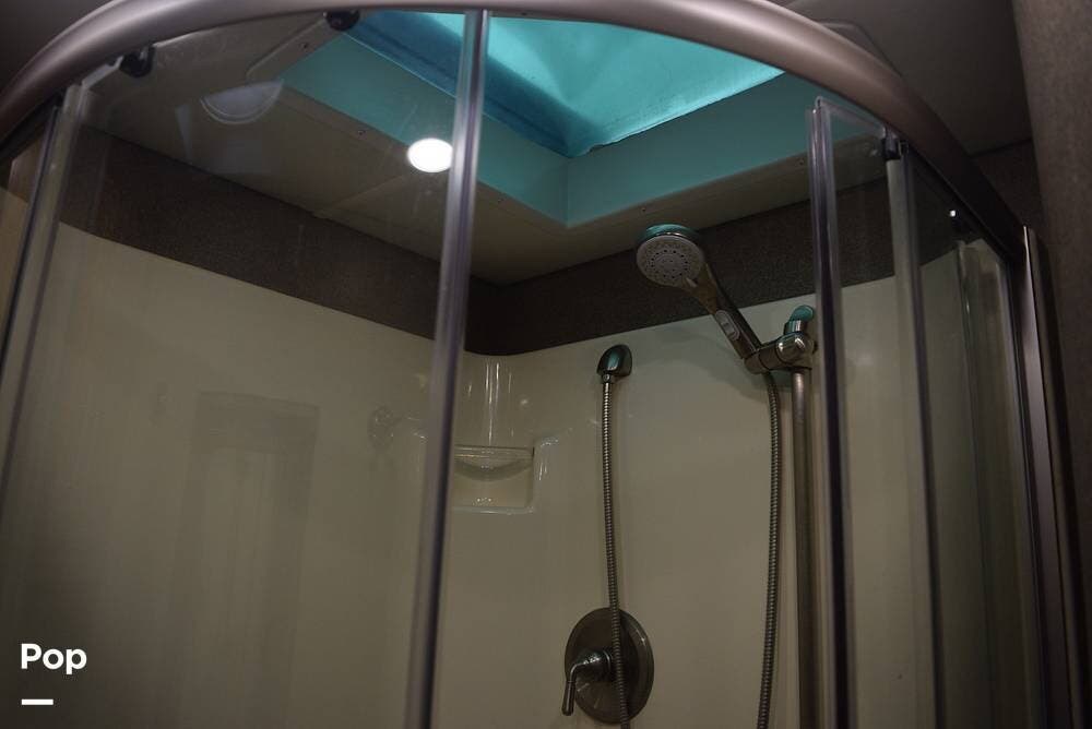 Step inside to find a spacious, beautifully appointed interior featuring premium hardwood cabinetry, solid-surface countertops, heated tile floors, and luxurious leather furnishings.