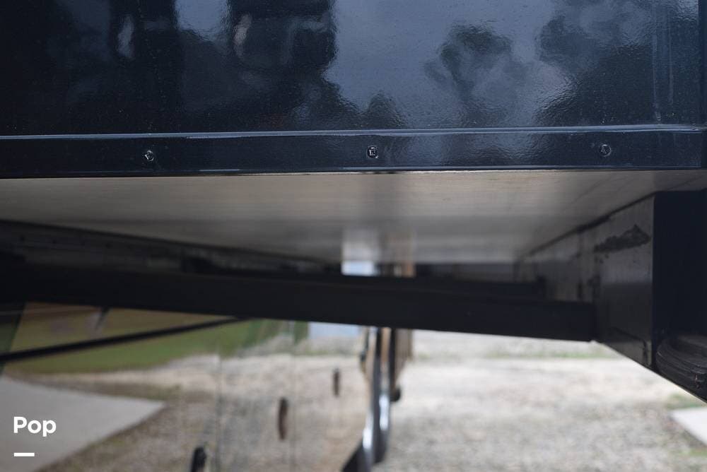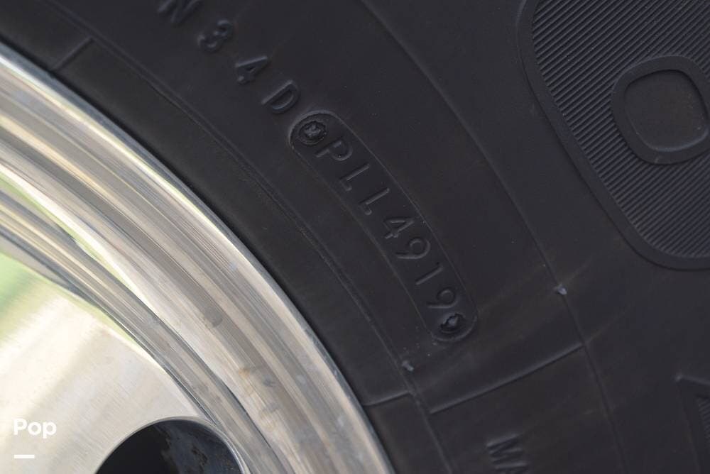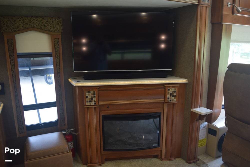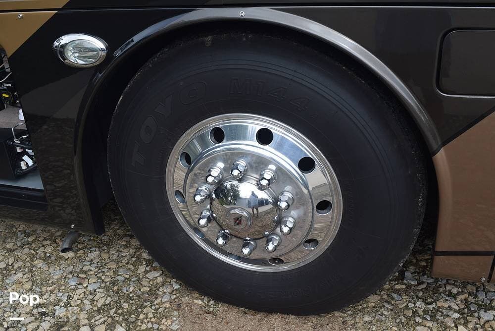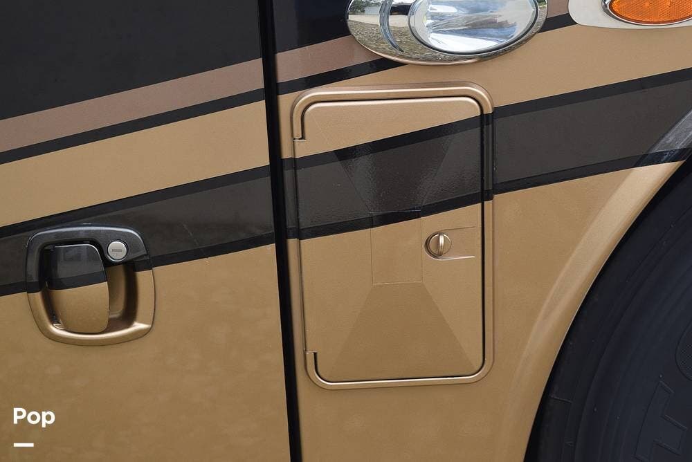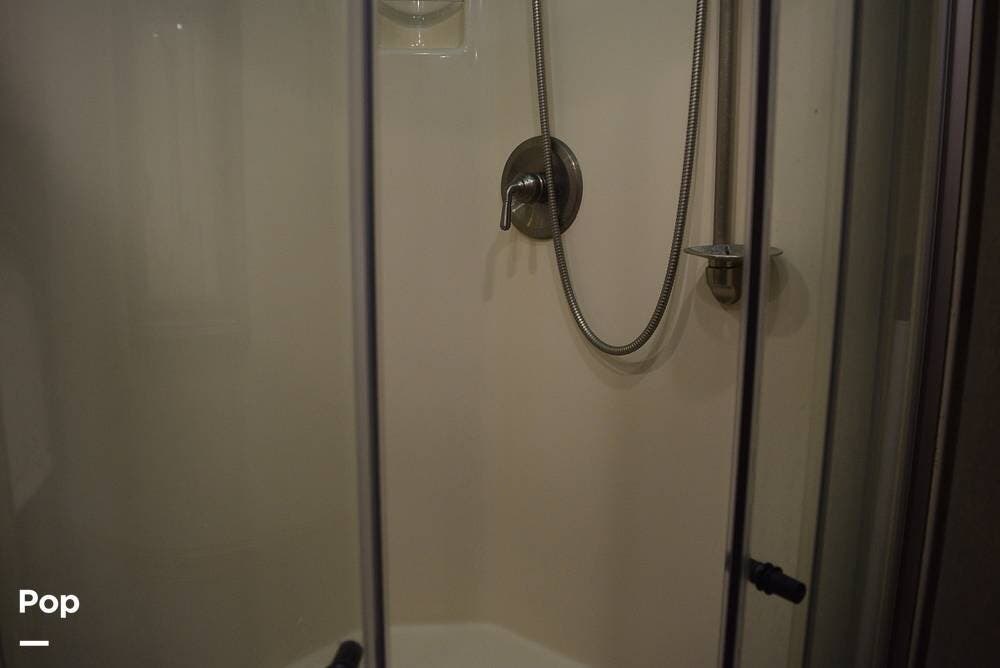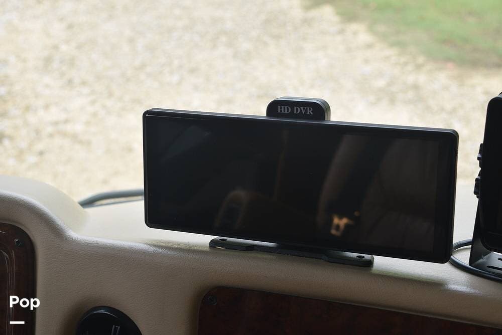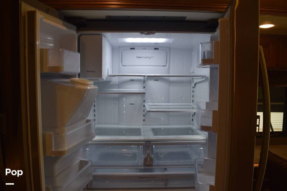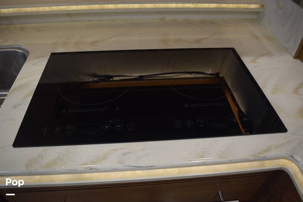 Step inside to find a spacious, beautifully appointed interior featuring premium hardwood cabinetry, solid-surface countertops, heated tile floors, and luxurious leather furnishings.