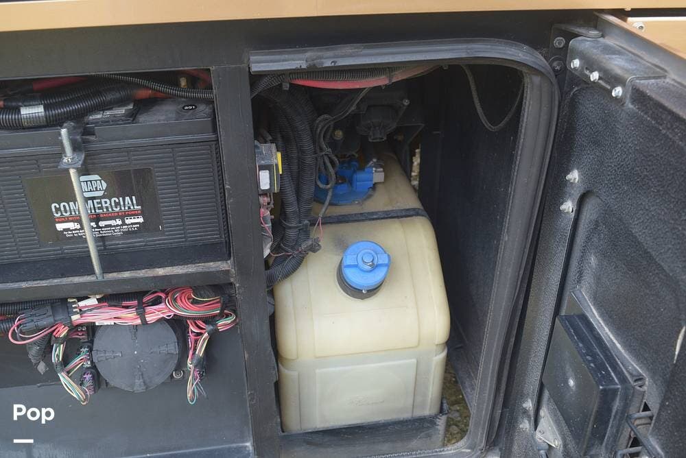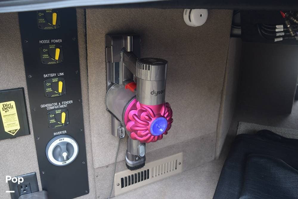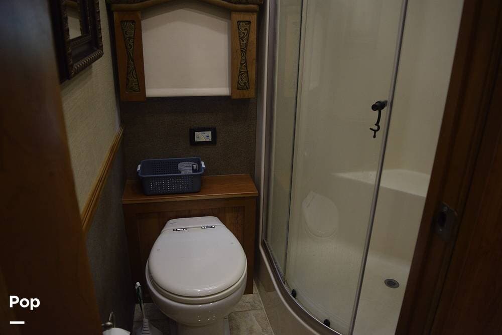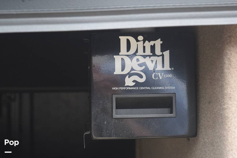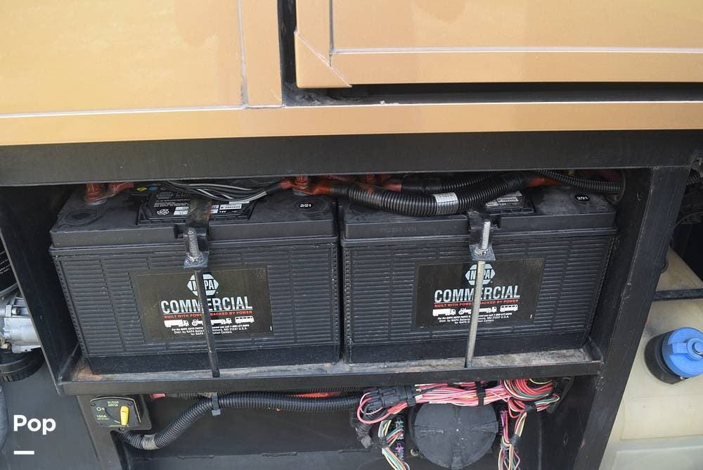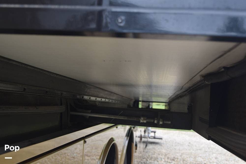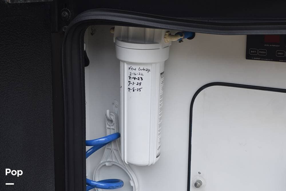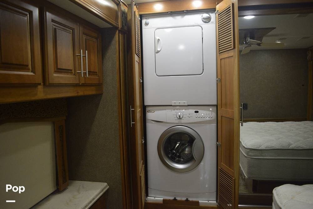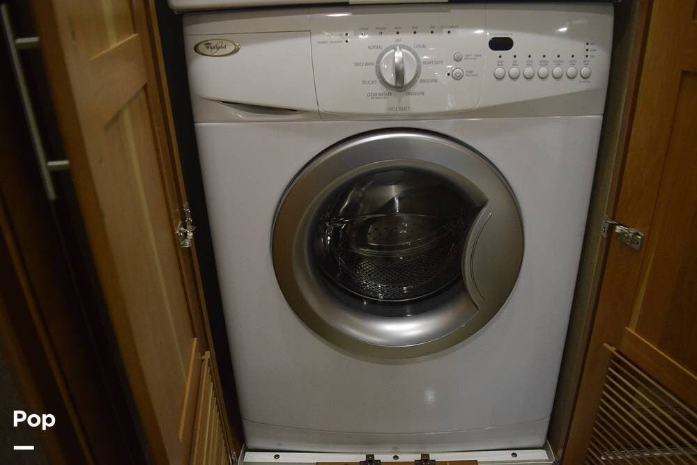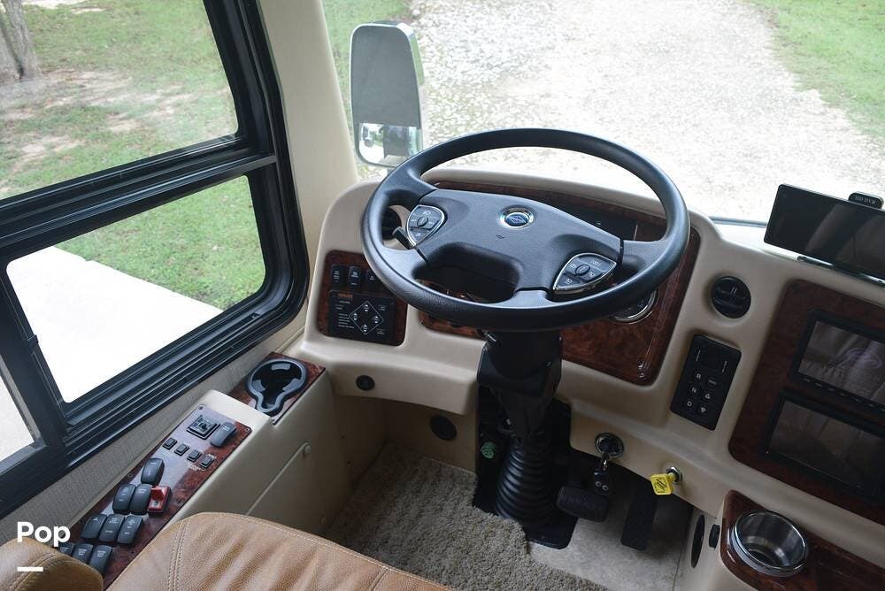 Step inside to find a spacious, beautifully appointed interior featuring premium hardwood cabinetry, solid-surface countertops, heated tile floors, and luxurious leather furnishings.