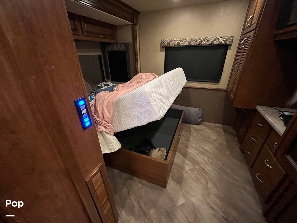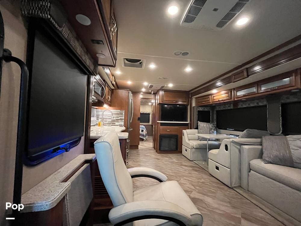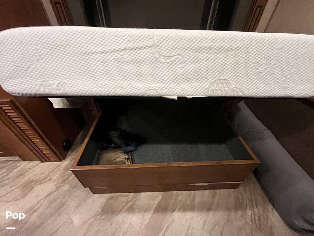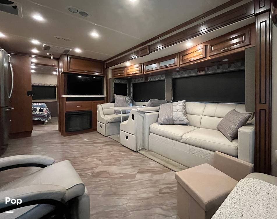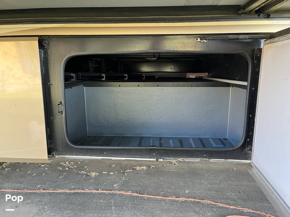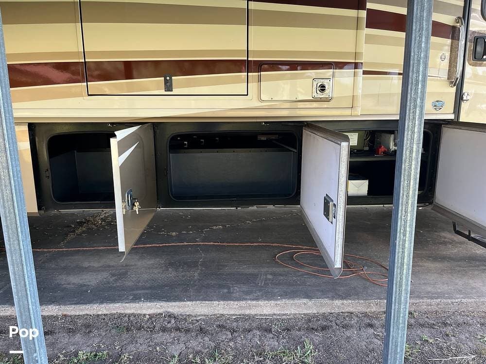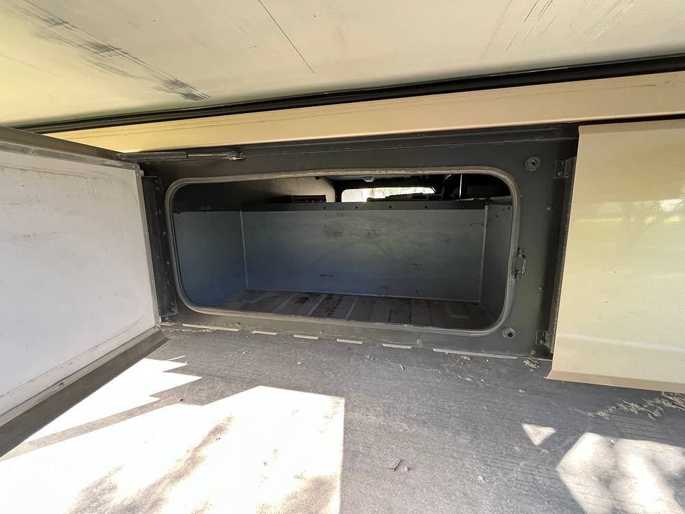 Additional highlights include a backup and side cameras with a monitor at the dash, leveling jacks, a power awning with LED lighting, an exterior entertainment center, and plenty of basement storage.