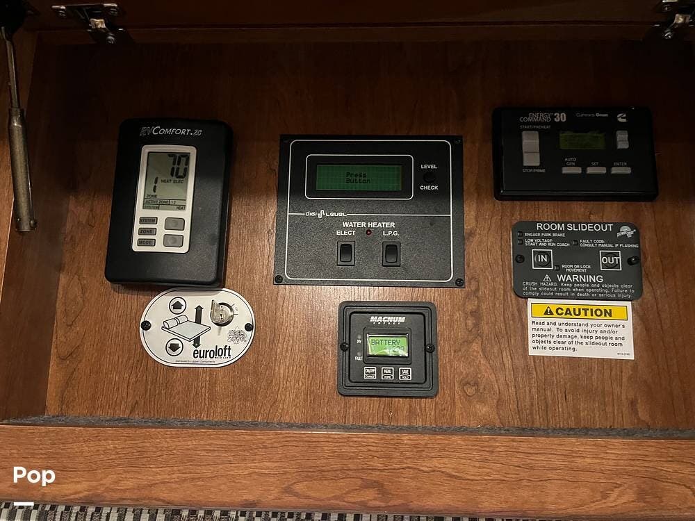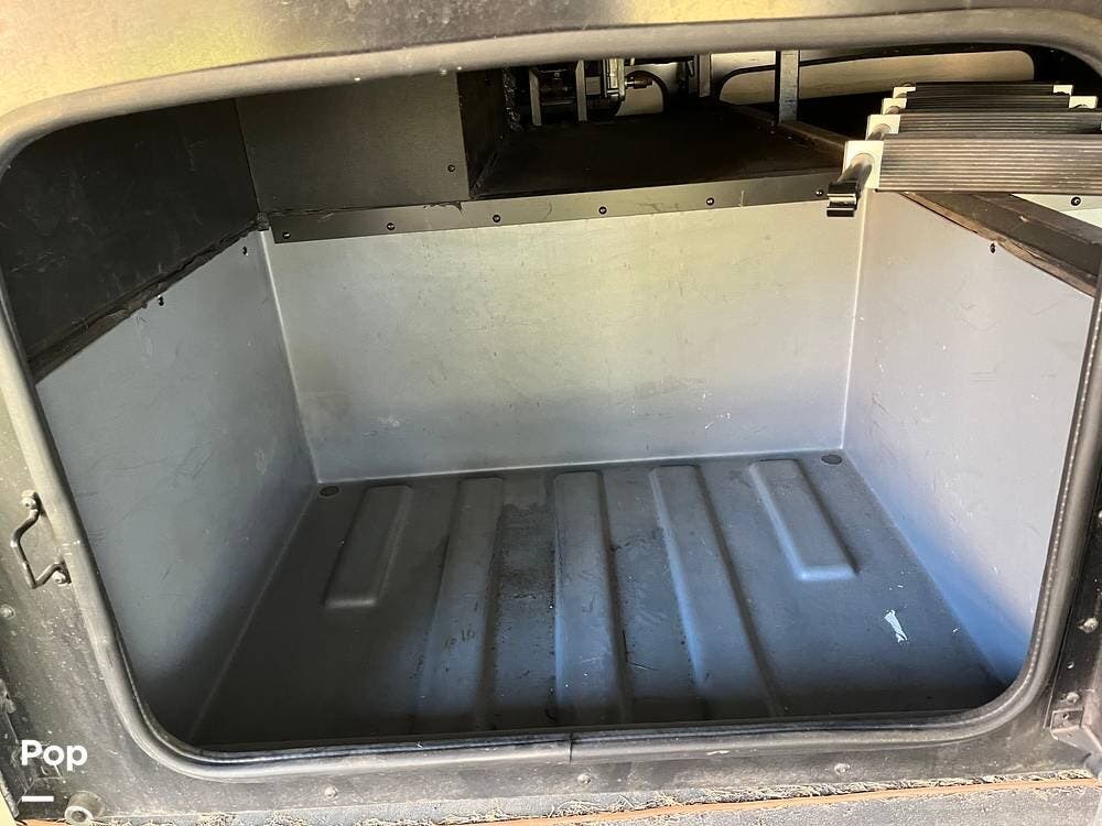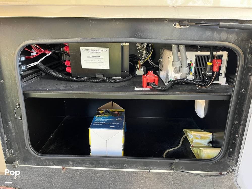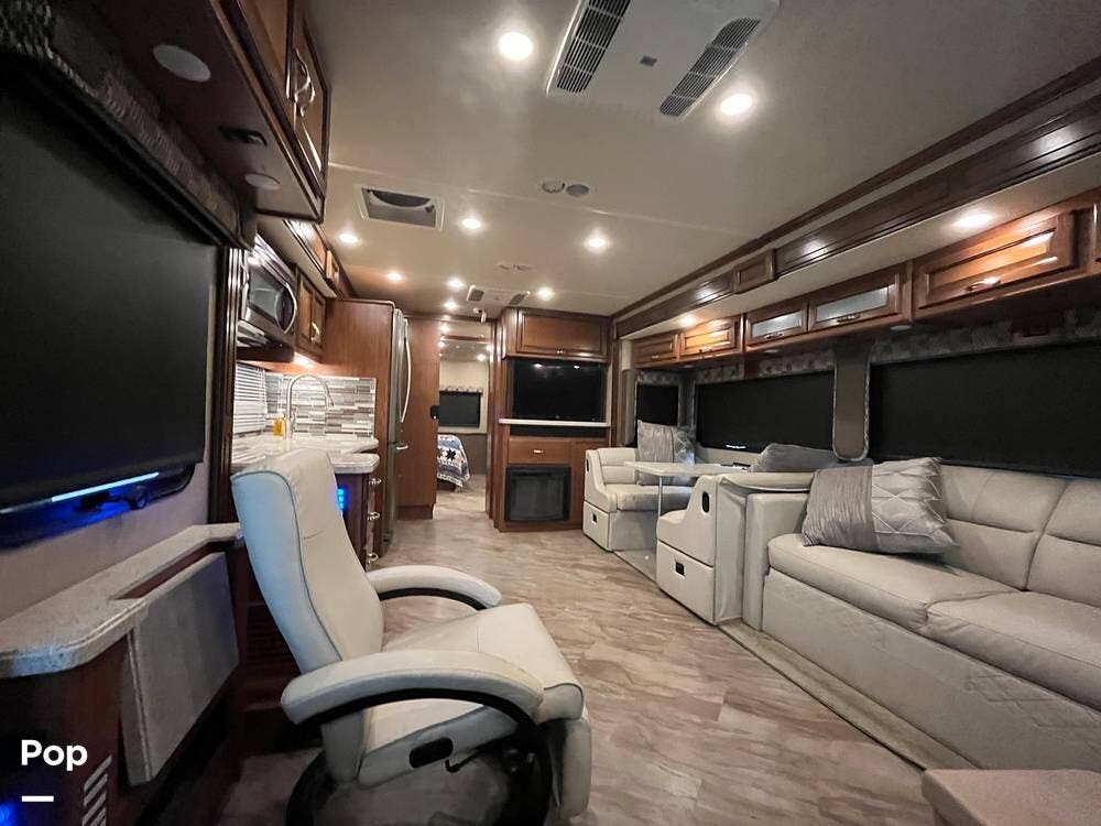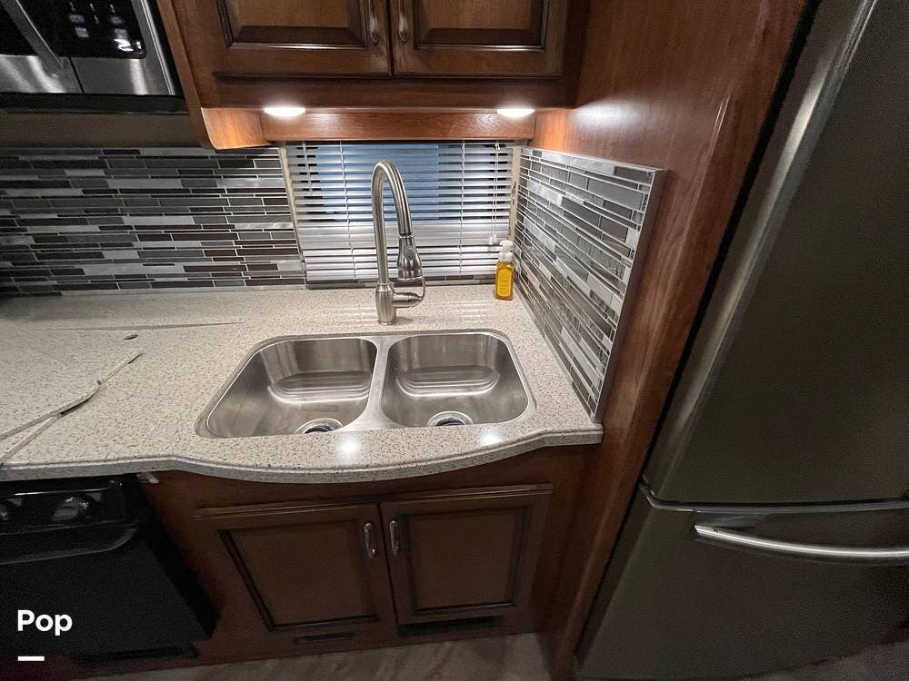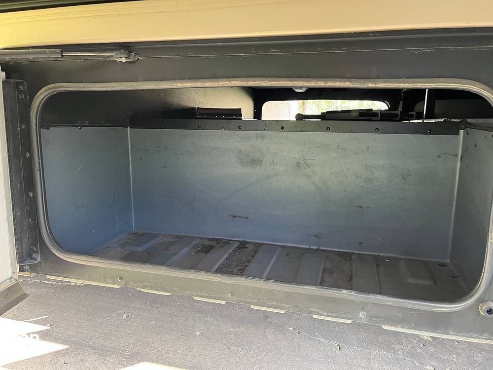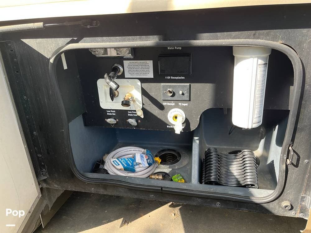 Additional highlights include a backup and side cameras with a monitor at the dash, leveling jacks, a power awning with LED lighting, an exterior entertainment center, and plenty of basement storage.