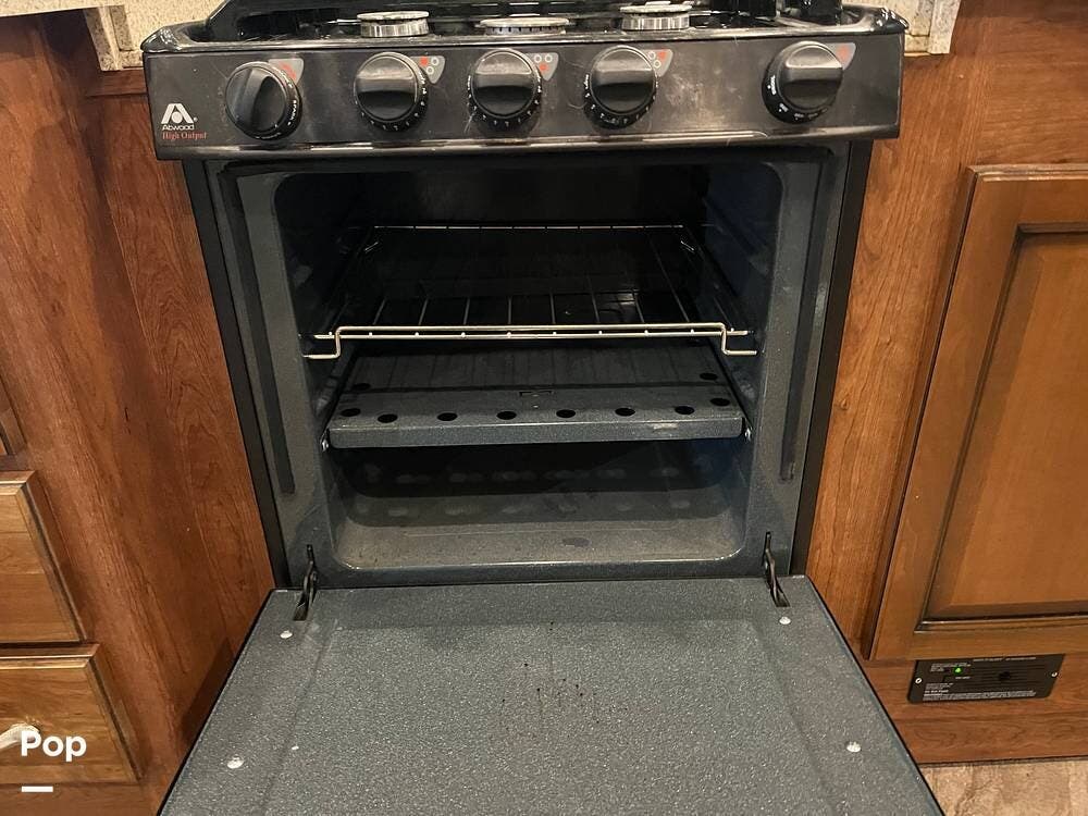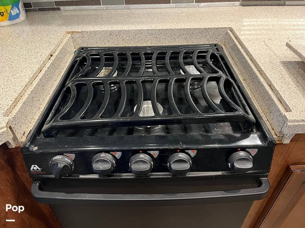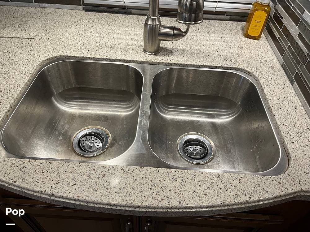The 34T floorplan is well-designed, with dual slide-outs that open up the living space, creating a bright, roomy interior. The main living area features a sofa and a convertible dinette, both facing a large flat-screen TV and an electric fireplace for cozy evenings indoors.