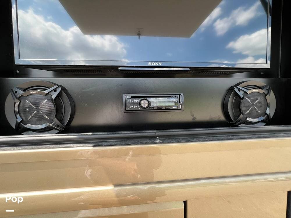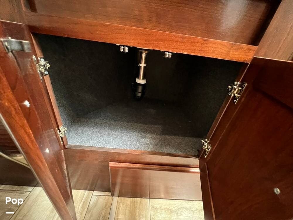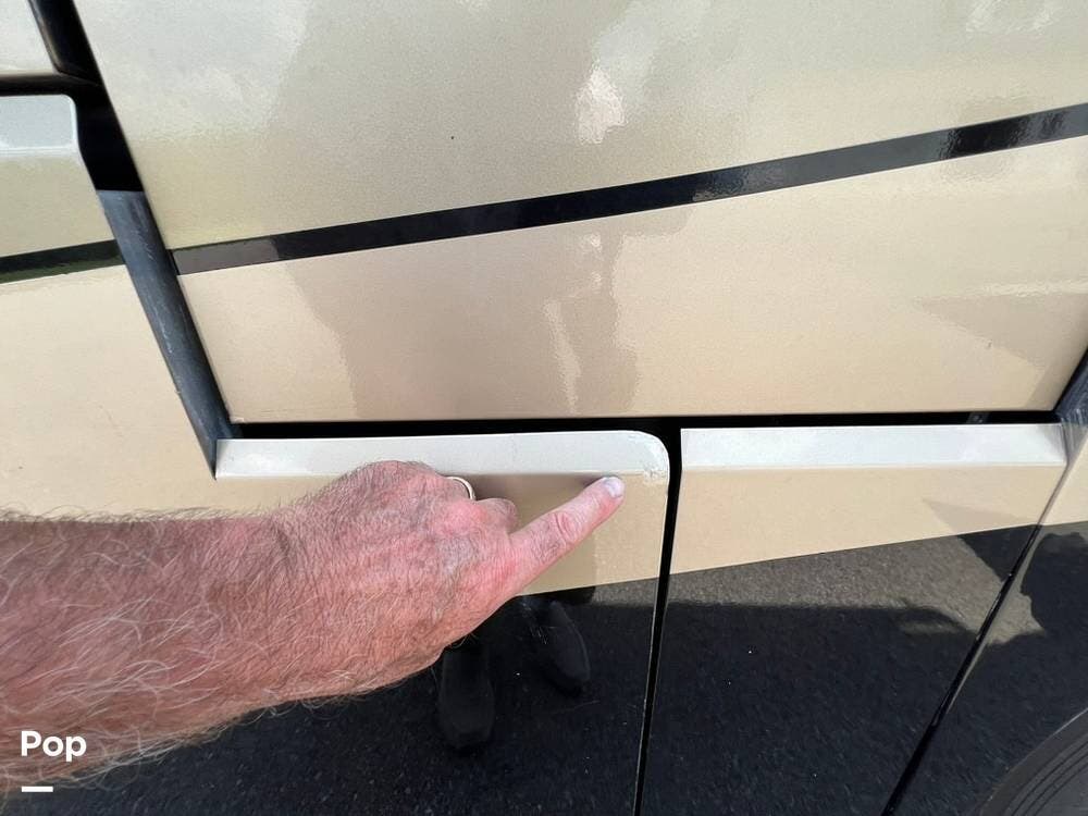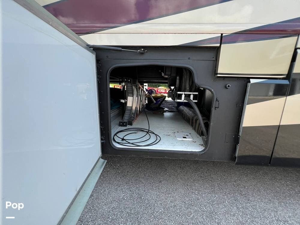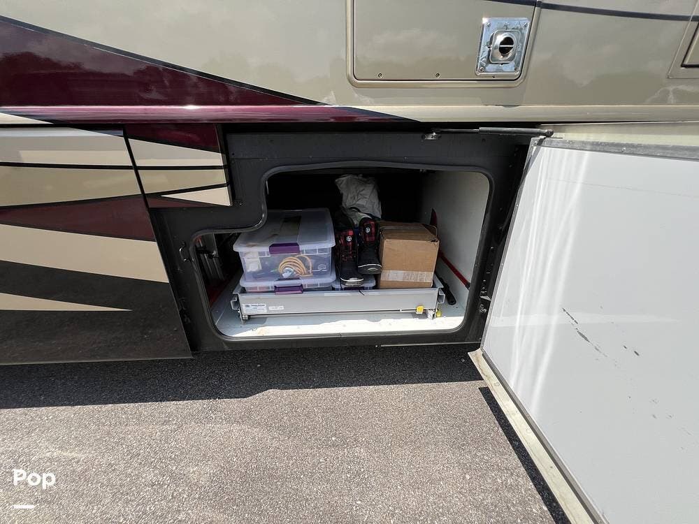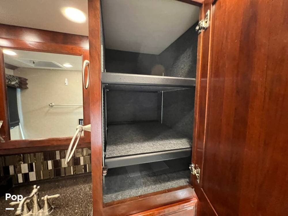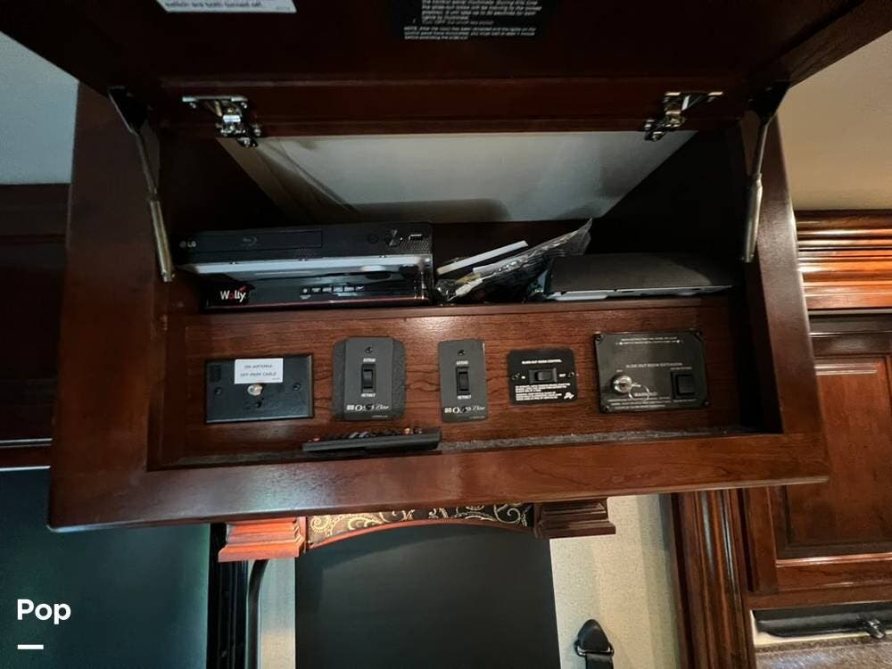 Outdoors, you have a full entertainment center, numerous storage compartments, and a pass-through storage area with a pullout slide tray.