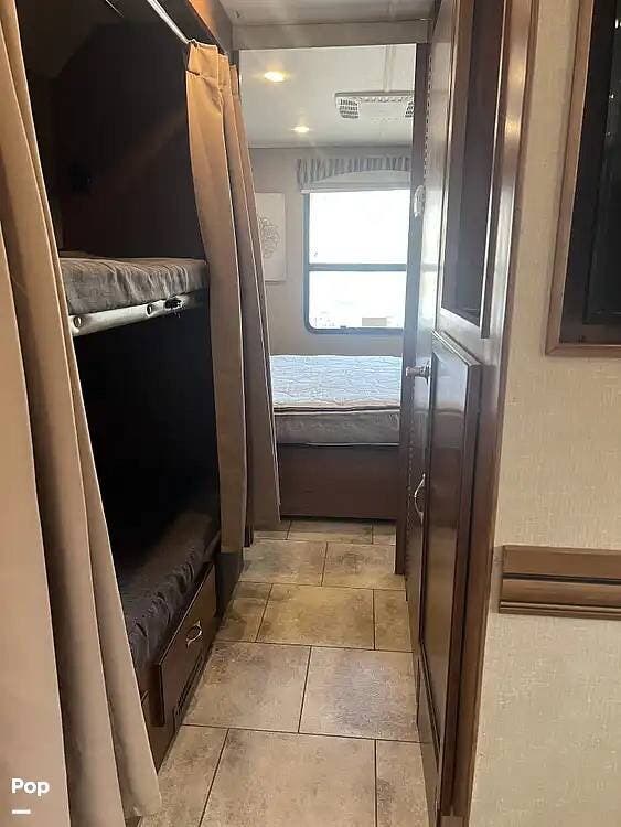 The standout feature of the Flair 31B is its bunk bed area, positioned mid-coach on the passenger side. These twin bunks include individual privacy curtains, reading lights, and TV hookups, making them a hit with younger travelers. Across from the bunks is the well-appointed bathroom, which includes a toilet, a glass-door shower, a vanity with storage, and a skylight for natural light.