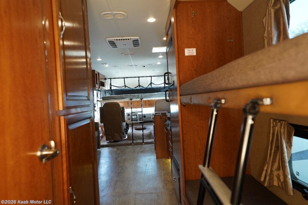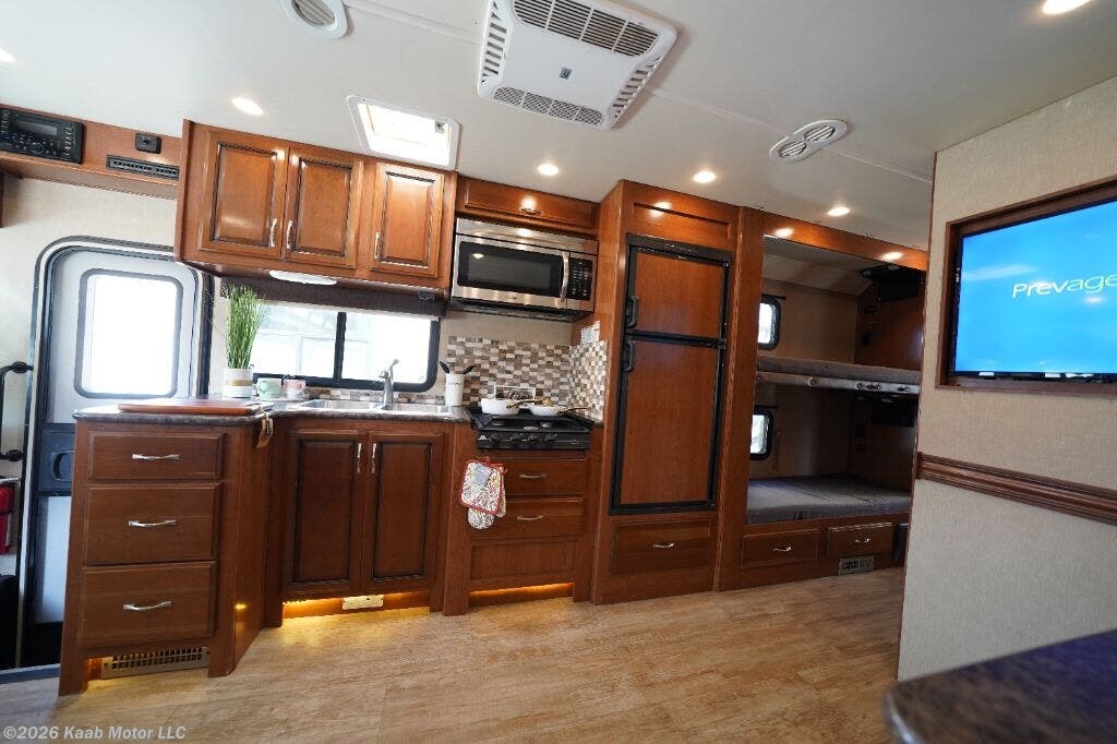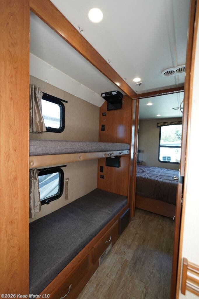 2017 Fleetwood RV Flair 31E (Bunk Beds) Class A gas motorhome built on a Ford F53 chassis powered by a 6.8L Triton V10 gasoline engine with automatic transmission. Overall length approximately 31 feet 10 inches, exterior width 8 feet 6 inches, exterior height approximately 12 feet 8 inches. Wheelbase 190 inches. Gross Vehicle Weight Rating 18,000 lbs. Gross Combined Weight Rating 23,000 lbs. Fuel capacity 80 gallons. Fresh water capacity approximately 50 gallons. Gray water capacity approximately 35 gallons. Black water capacity approximately 35 gallons. LP tank capacity approximately 25 gallons. Two slide-outs. Sleeping capacity up to 8 with rear queen bed, mid-coach bunk beds, convertible booth dinette, jackknife sofa and overhead cab bunk. Rear private bedroom with wardrobe storage and under-bed storage. Split bath floorplan with shower on one side and toilet with vanity on the other side. Kitchen equipped with three-burner range with oven, microwave, double-door refrigerator, solid surface countertops and stainless steel sink. Ducted roof air conditioning system. Forced air furnace. 6 gallon water heater. Onan 5.5kW gasoline generator. 30 amp electrical service. Power patio awning. Exterior entertainment center. Backup camera and side view cameras. Trailer hitch rated up to 5,000 lbs towing capacity. Mileage: VIN: 1F65F5DY8H0A08377 Generator hours: 464