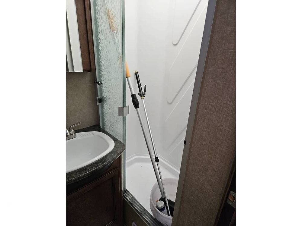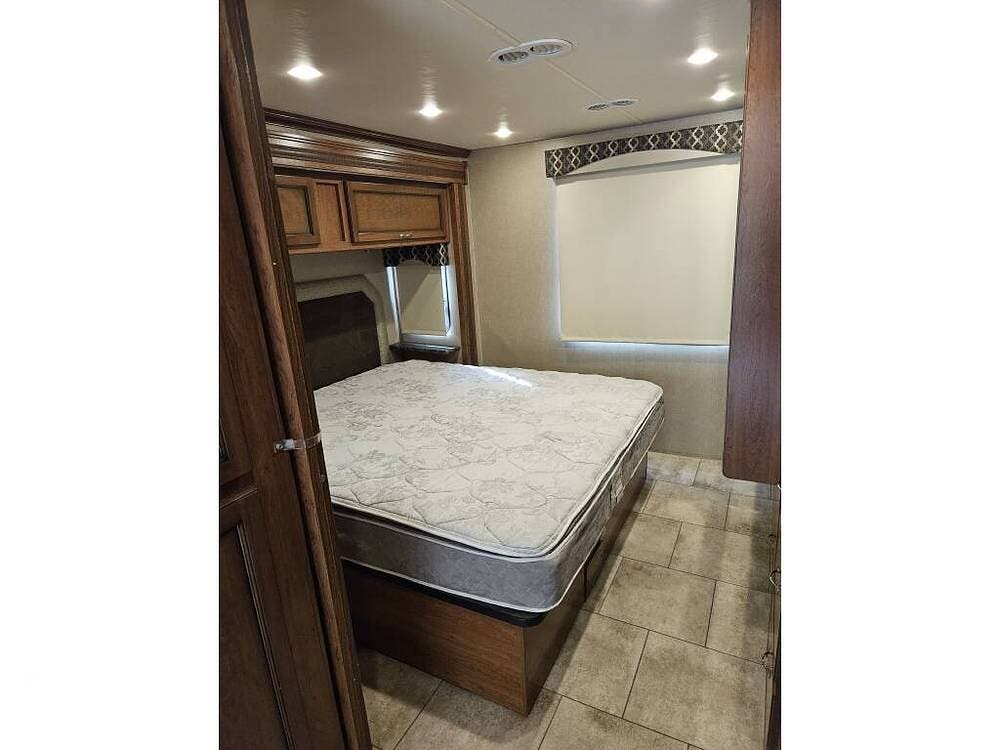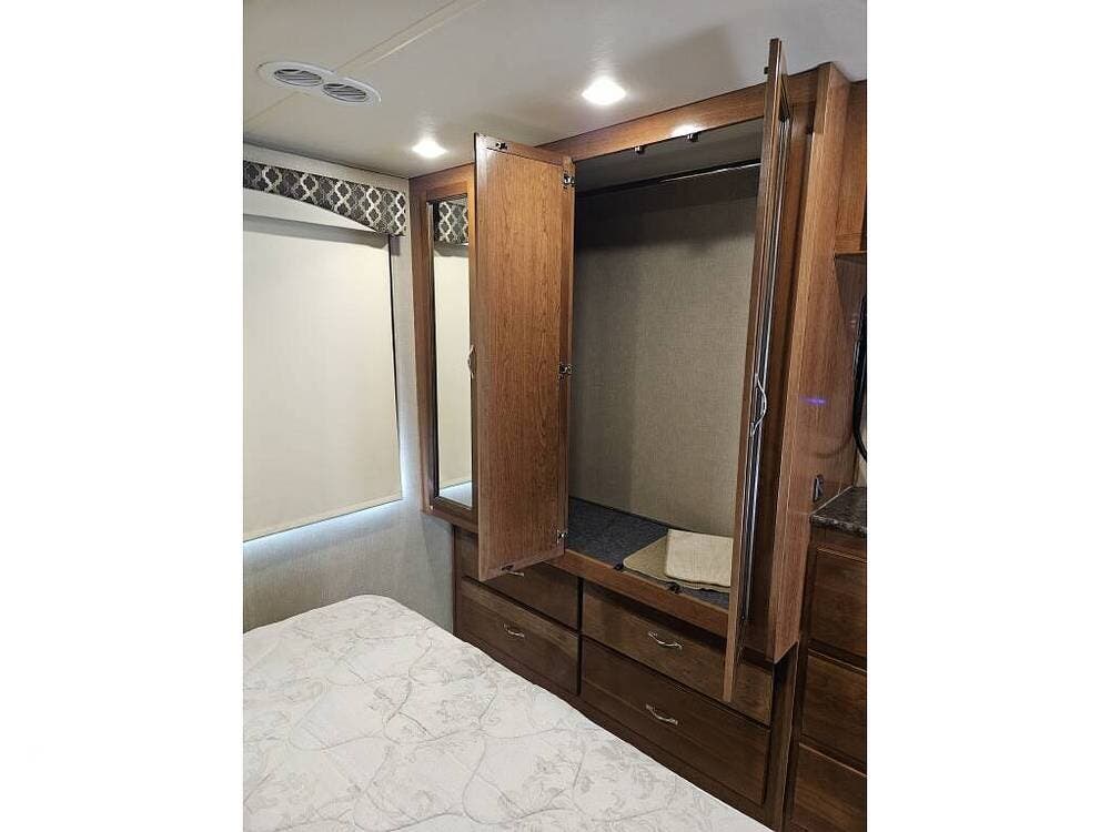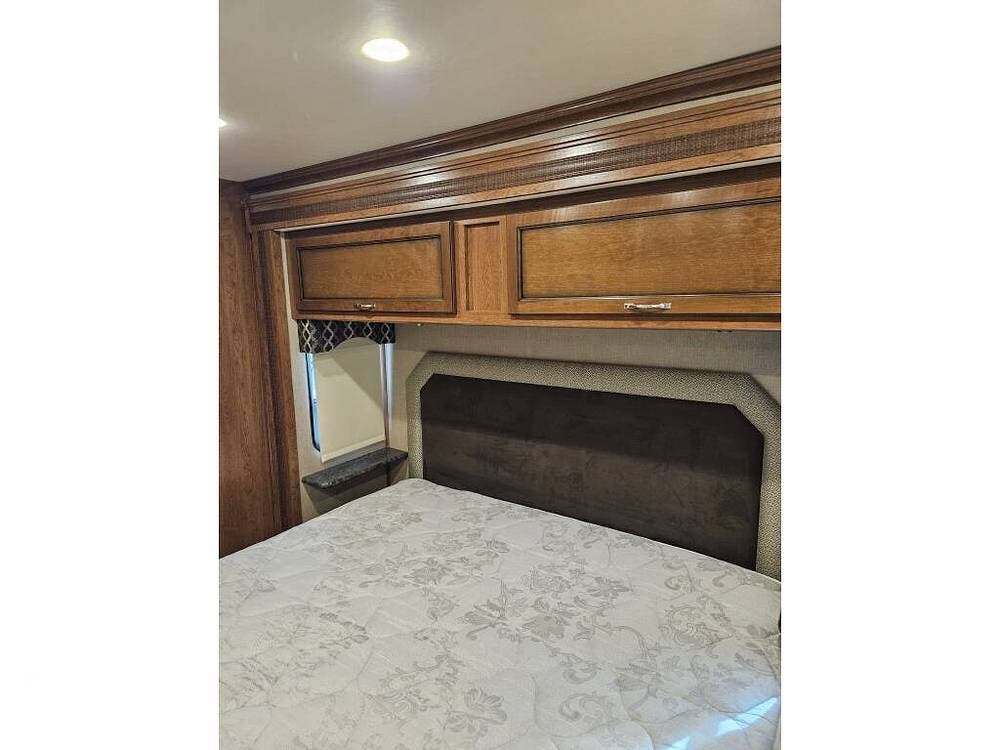 Outside, you'll find even more to love. A large 18-foot power awning provides shaded outdoor living space, and the exterior entertainment center includes a mounted TV and speakers--perfect for movie nights under the stars. There's also an outdoor shower for rinsing off after hikes or trips to the beach. Ample basement storage, a 4.0kW Onan generator, dual air conditioners, and a 5,000-pound towing capacity round out the features that make this RV a standout.
