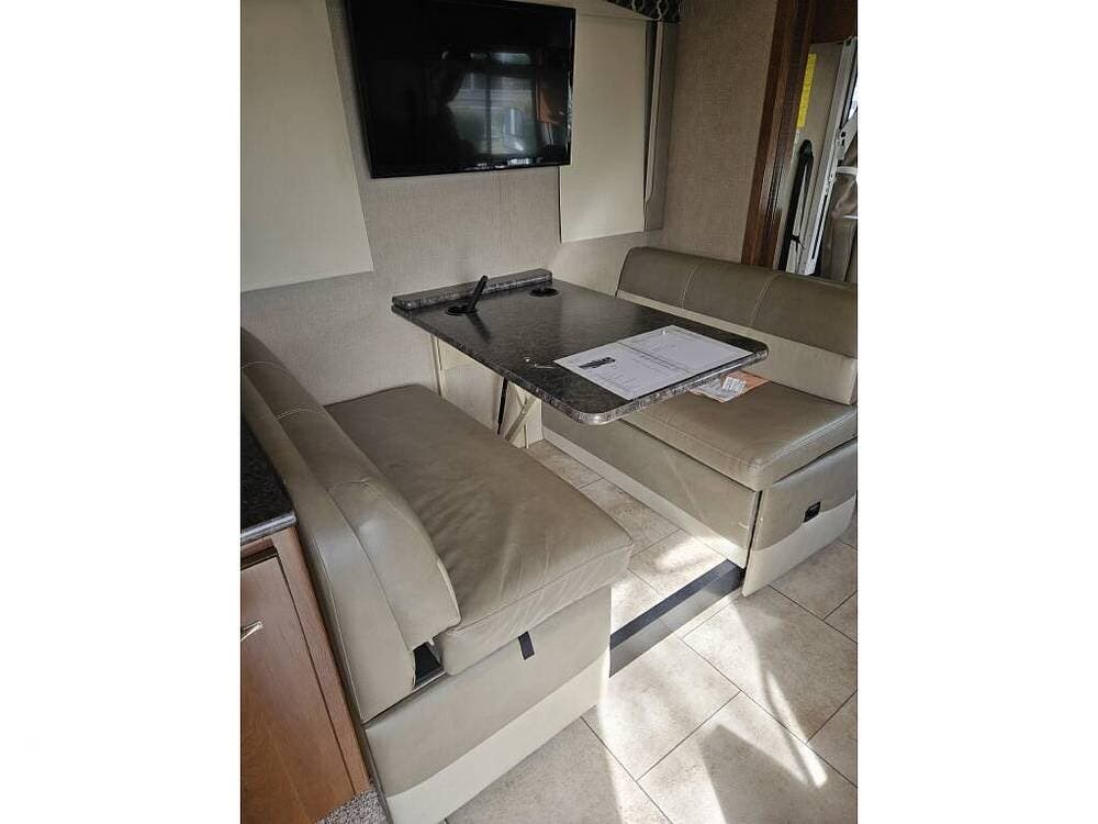 Overhead cabinetry provides generous storage, and large windows let in natural light, creating a bright and welcoming interior. The drop-down Hide-A-Loft bed above the cab offers a comfortable queen-sized sleeping space, ideal for guests or family members.