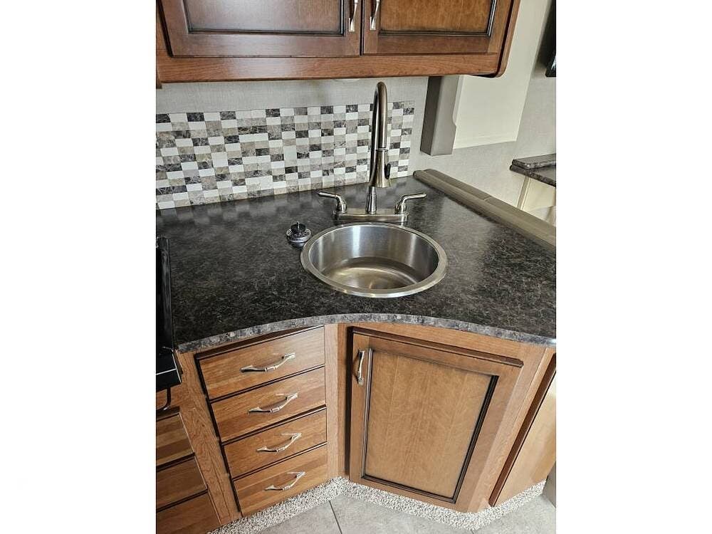 The kitchen is well-equipped for cooking on the road, offering a three-burner gas stove, convection microwave oven, and a full-size residential refrigerator. Solid-surface countertops, a double stainless steel sink with covers, and a convenient pantry give you all the conveniences of home, whether prepping a quick snack or a full dinner.