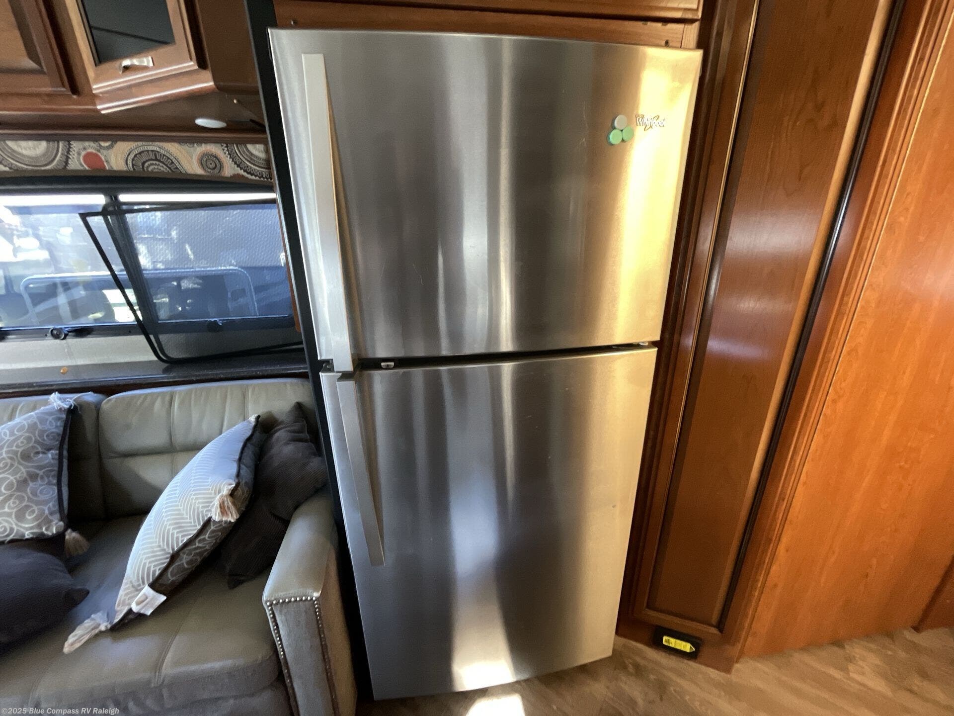 The kitchen is found partly in the road side slide. Here a three burner range and overhead microwave oven give you the perfect tools to whip up something to eat. A nice double sink makes cleaning up a breeze, and the residential refrigerator will provide enough space for you to stock up on fresh groceries.