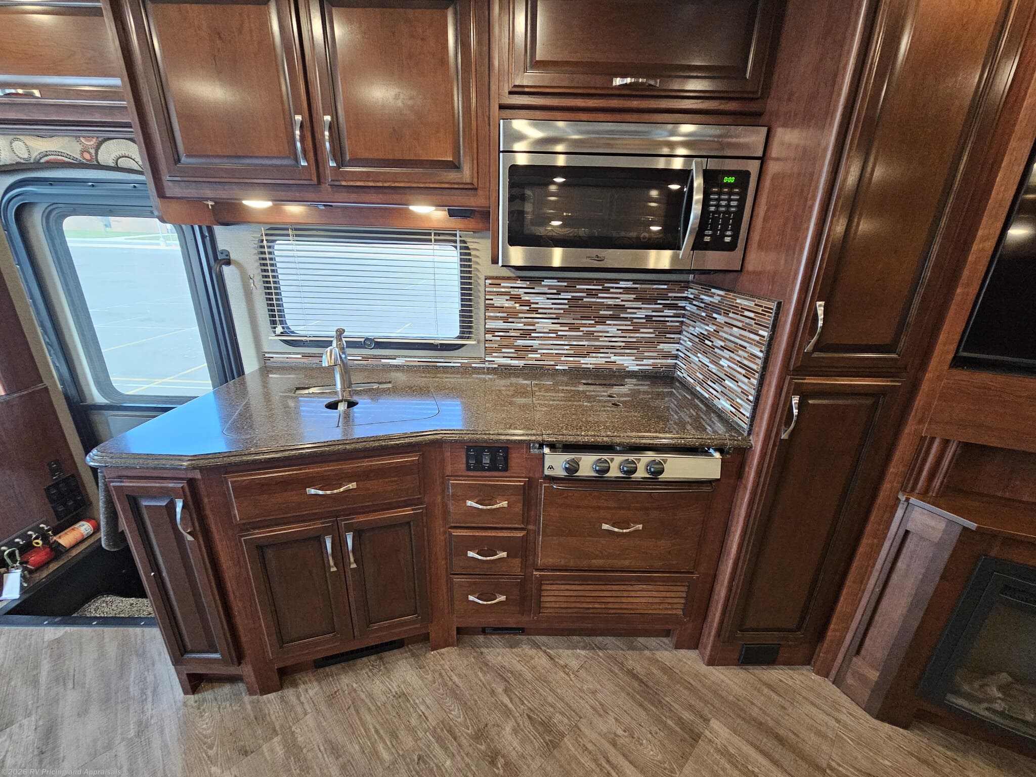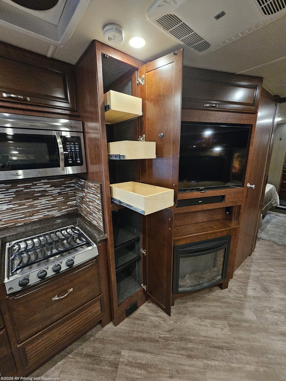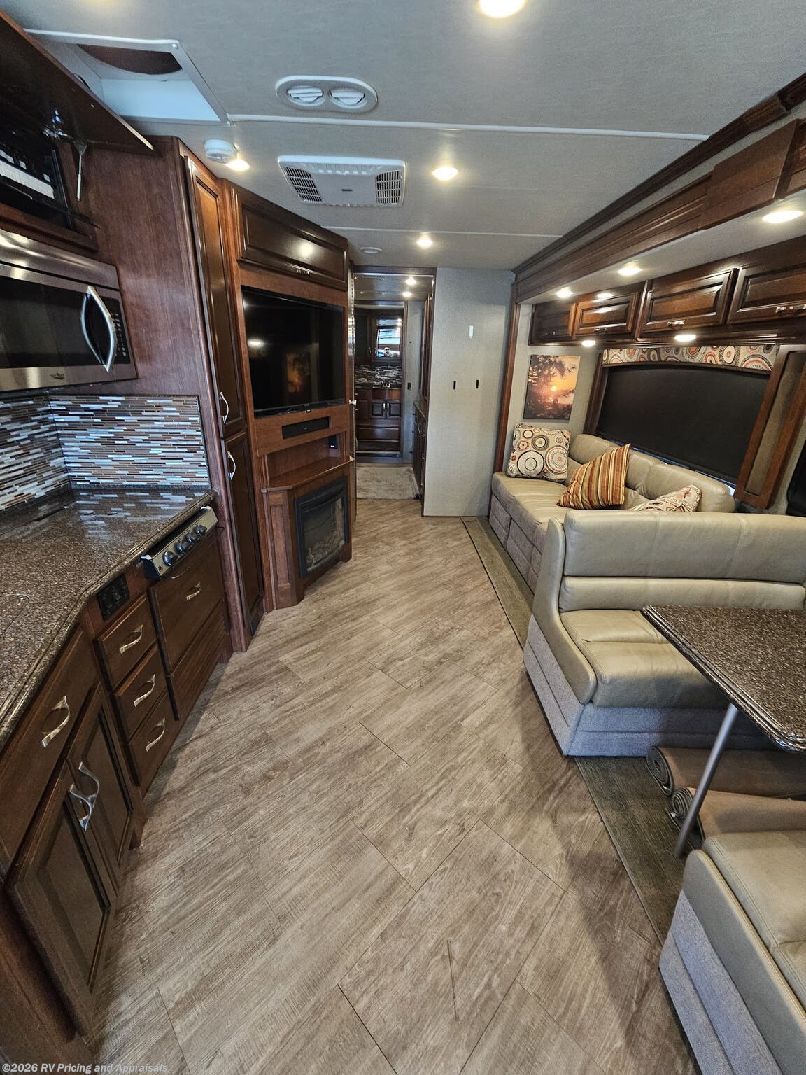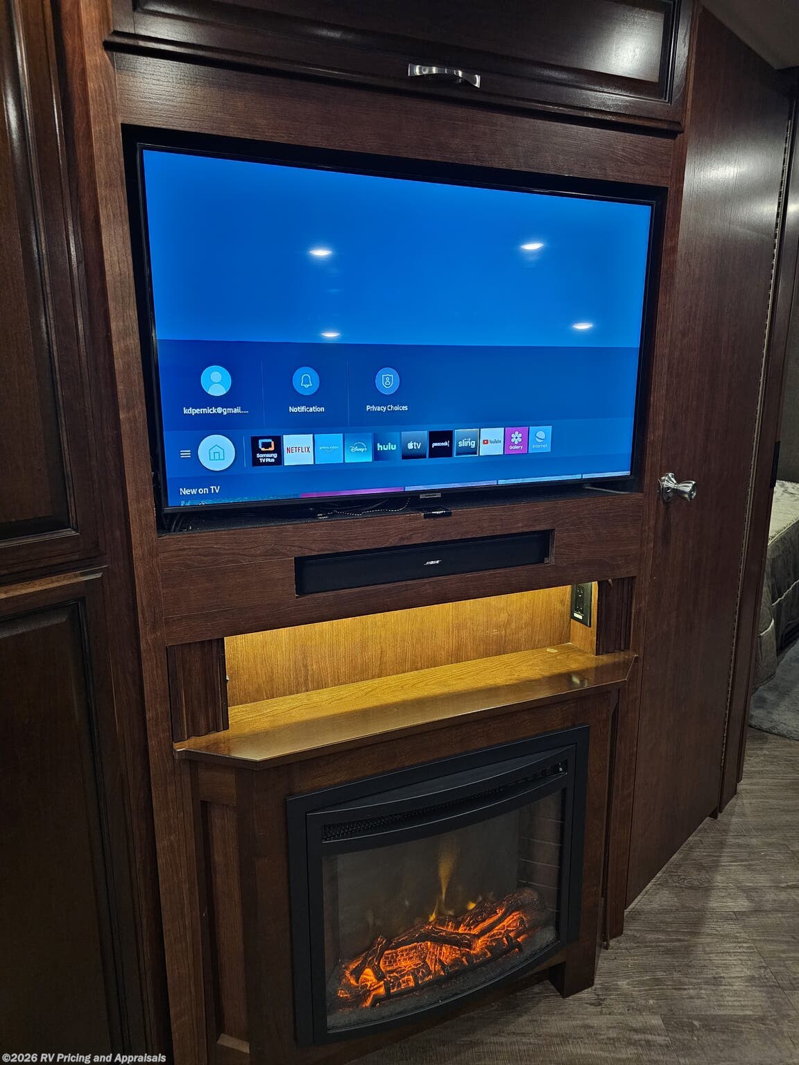 This RV has been expertly designed for maximum comfort and convenience, accommodating 4-6 people effortlessly with a king bed and a dropdown queen bed. The interior exudes warmth and hominess with a residential refrigerator freezer with ice-maker, composite plank flooring, solid surface countertops, and rich hardwood cabinetry. Enjoy additional highlights such as a welcoming fireplace, a central vacuum system, and generous storage space with massive pass-through compartments. The airy atmosphere and impressive 84-inch interior ceiling height creates a spacious and inviting environment for all your travel needs.