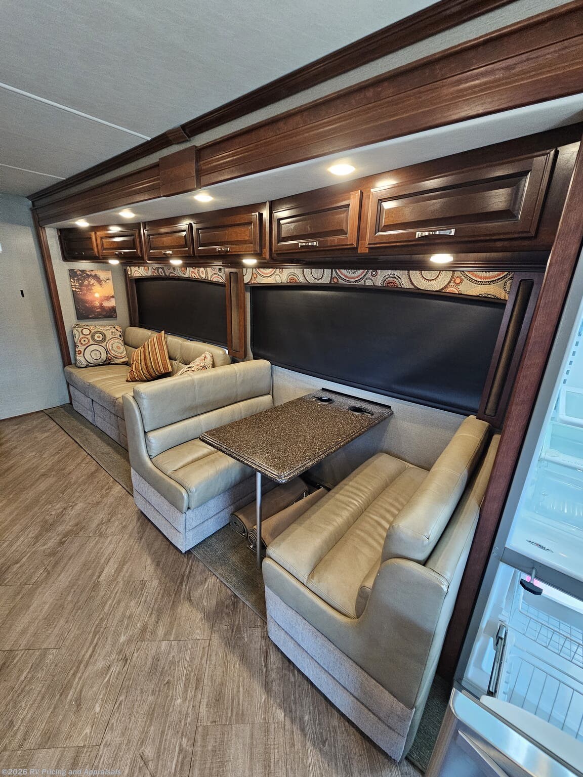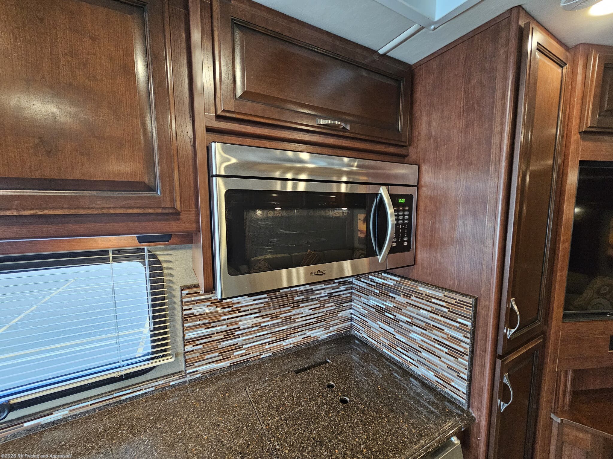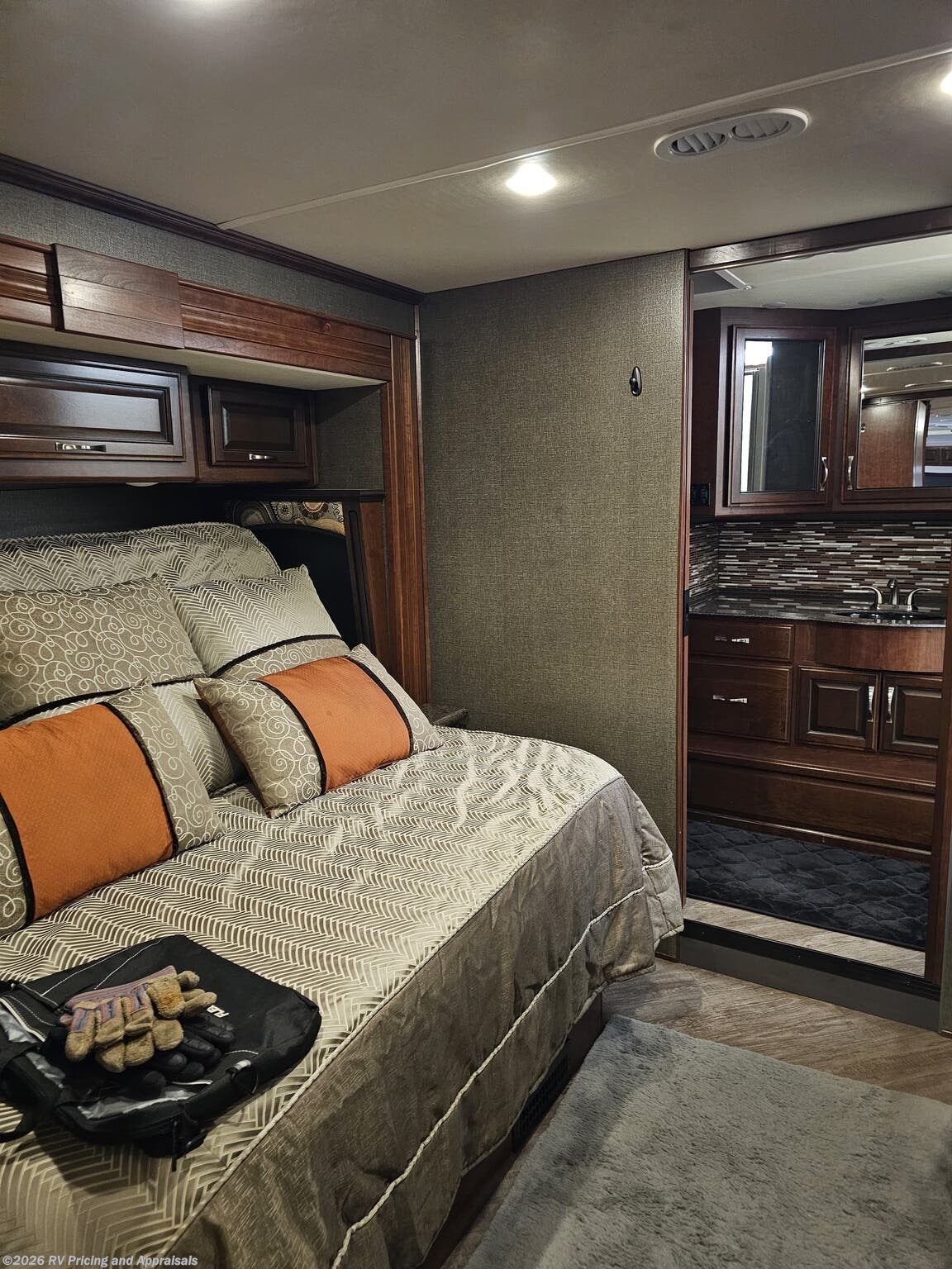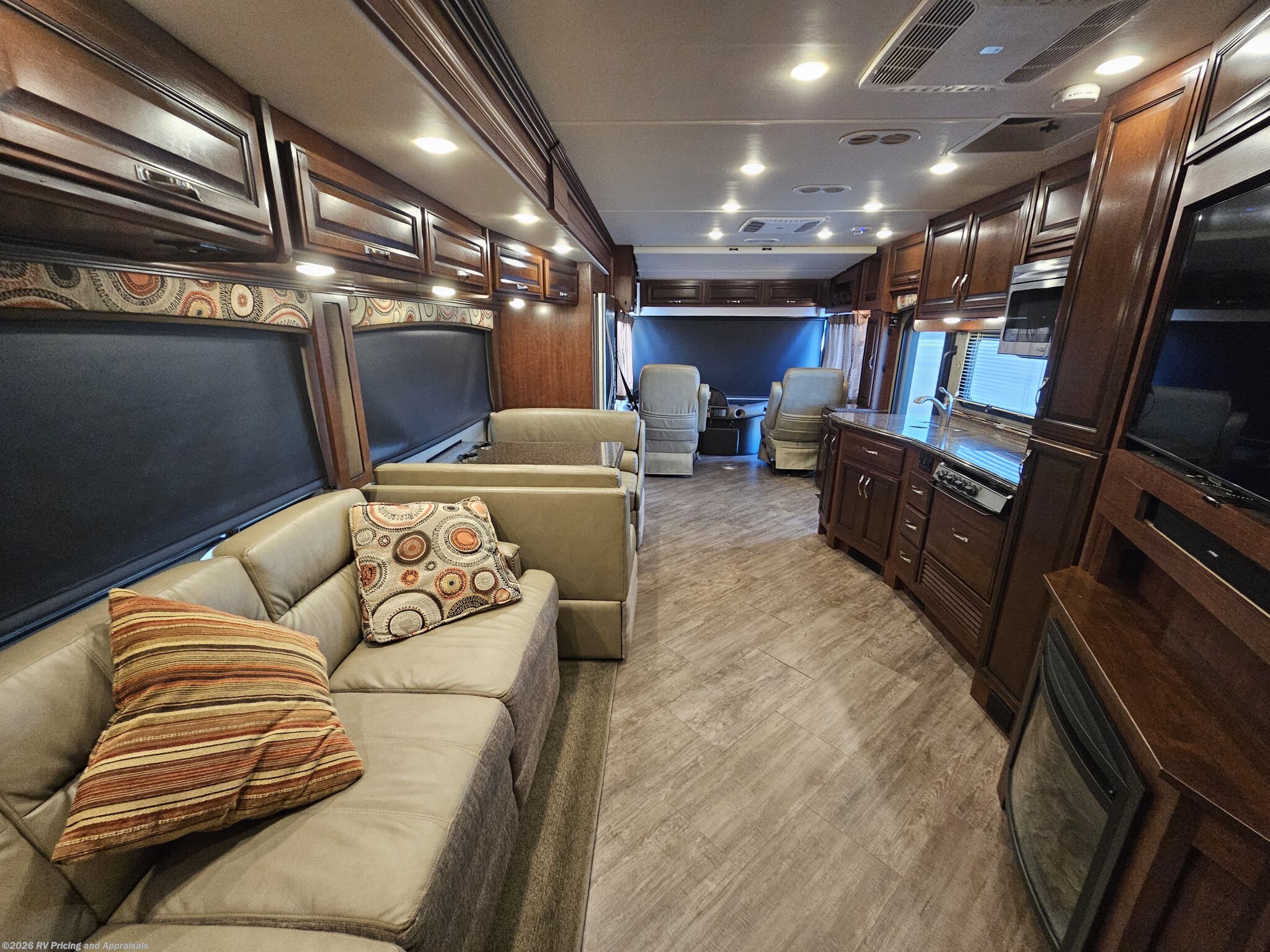 This RV has been expertly designed for maximum comfort and convenience, accommodating 4-6 people effortlessly with a king bed and a dropdown queen bed. The interior exudes warmth and hominess with a residential refrigerator freezer with ice-maker, composite plank flooring, solid surface countertops, and rich hardwood cabinetry. Enjoy additional highlights such as a welcoming fireplace, a central vacuum system, and generous storage space with massive pass-through compartments. The airy atmosphere and impressive 84-inch interior ceiling height creates a spacious and inviting environment for all your travel needs.