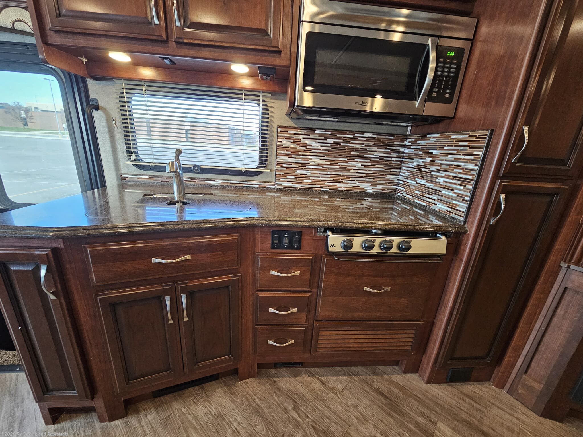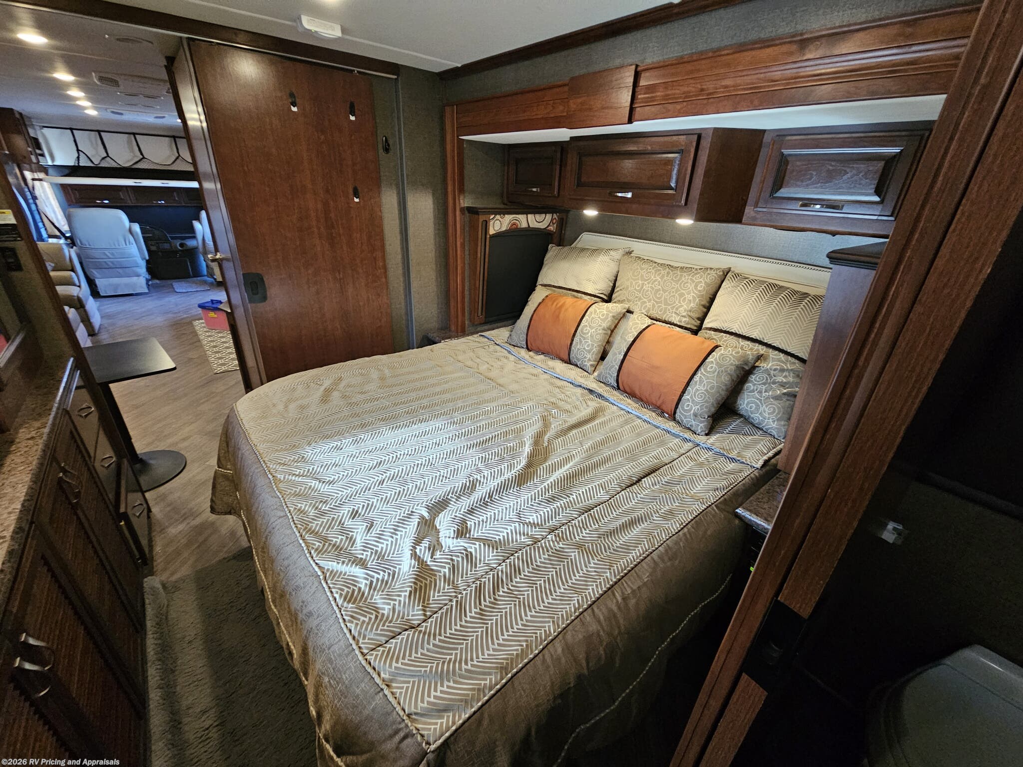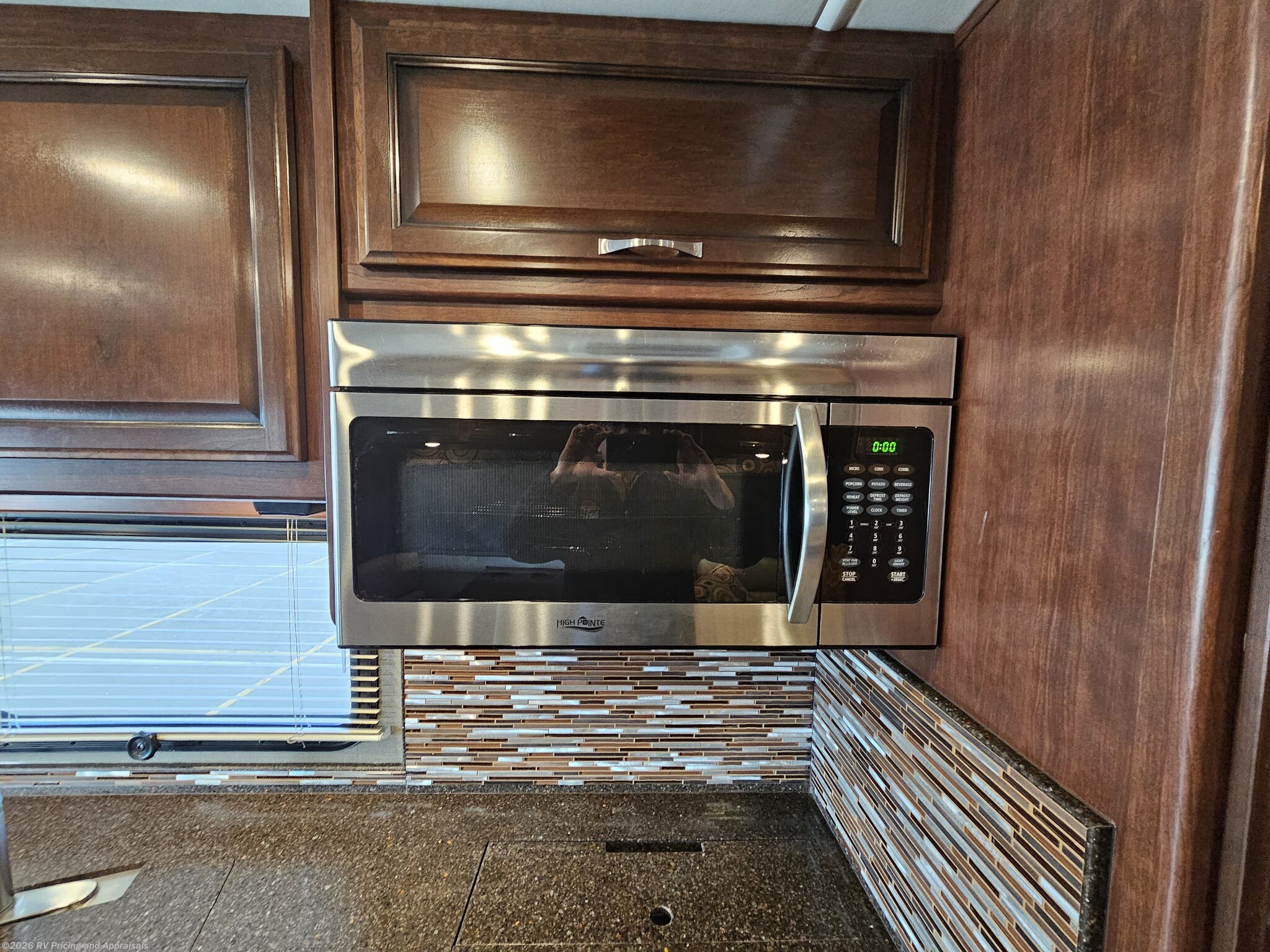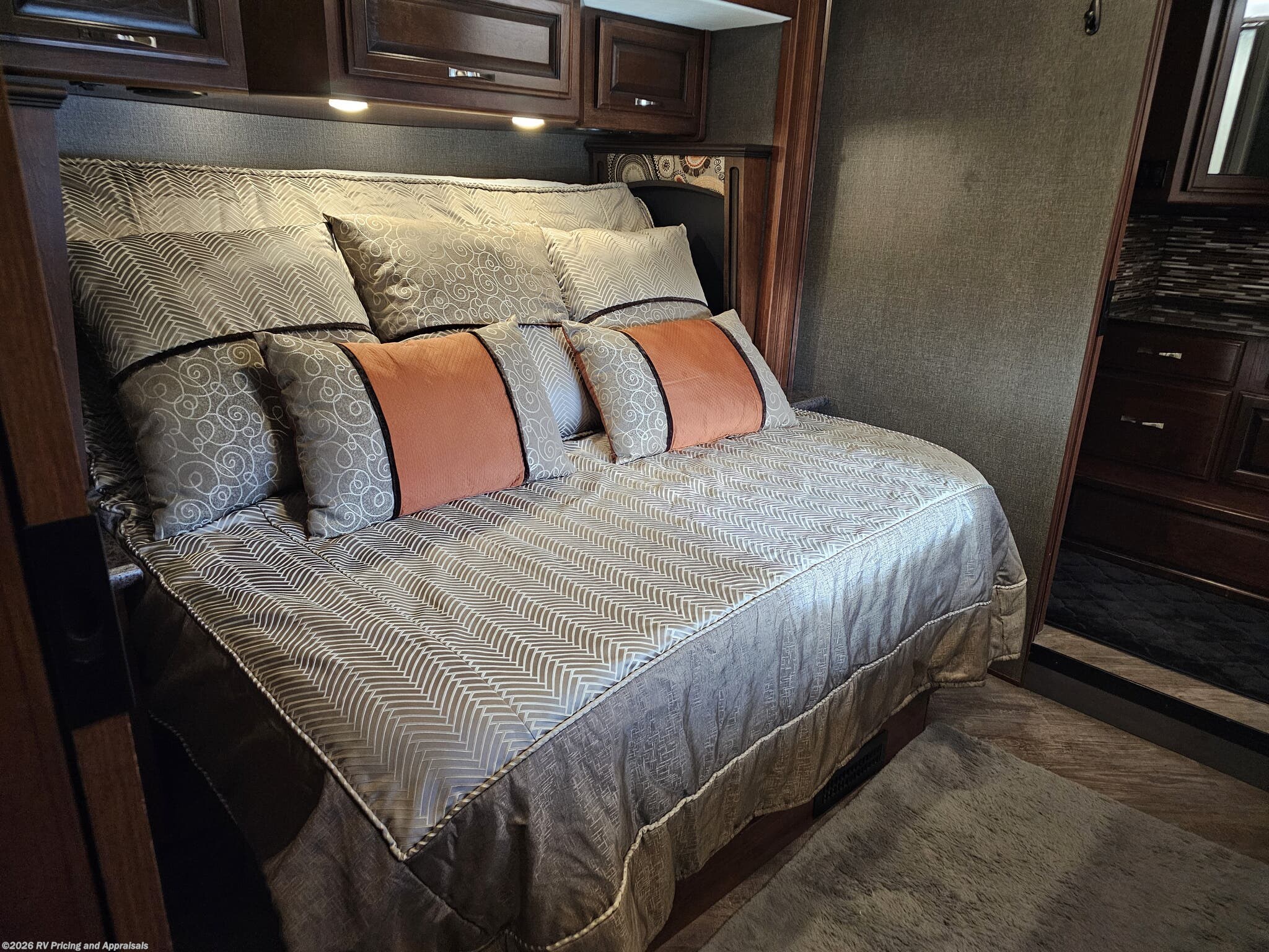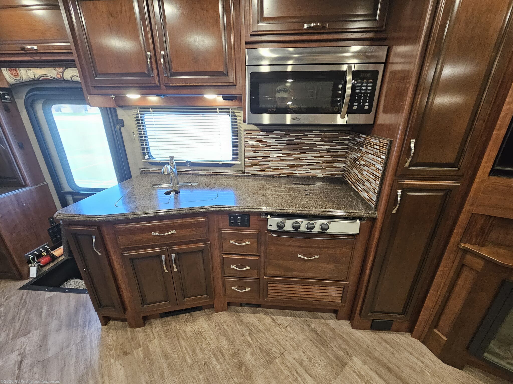 This RV has been expertly designed for maximum comfort and convenience, accommodating 4-6 people effortlessly with a king bed and a dropdown queen bed. The interior exudes warmth and hominess with a residential refrigerator freezer with ice-maker, composite plank flooring, solid surface countertops, and rich hardwood cabinetry. Enjoy additional highlights such as a welcoming fireplace, a central vacuum system, and generous storage space with massive pass-through compartments. The airy atmosphere and impressive 84-inch interior ceiling height creates a spacious and inviting environment for all your travel needs.