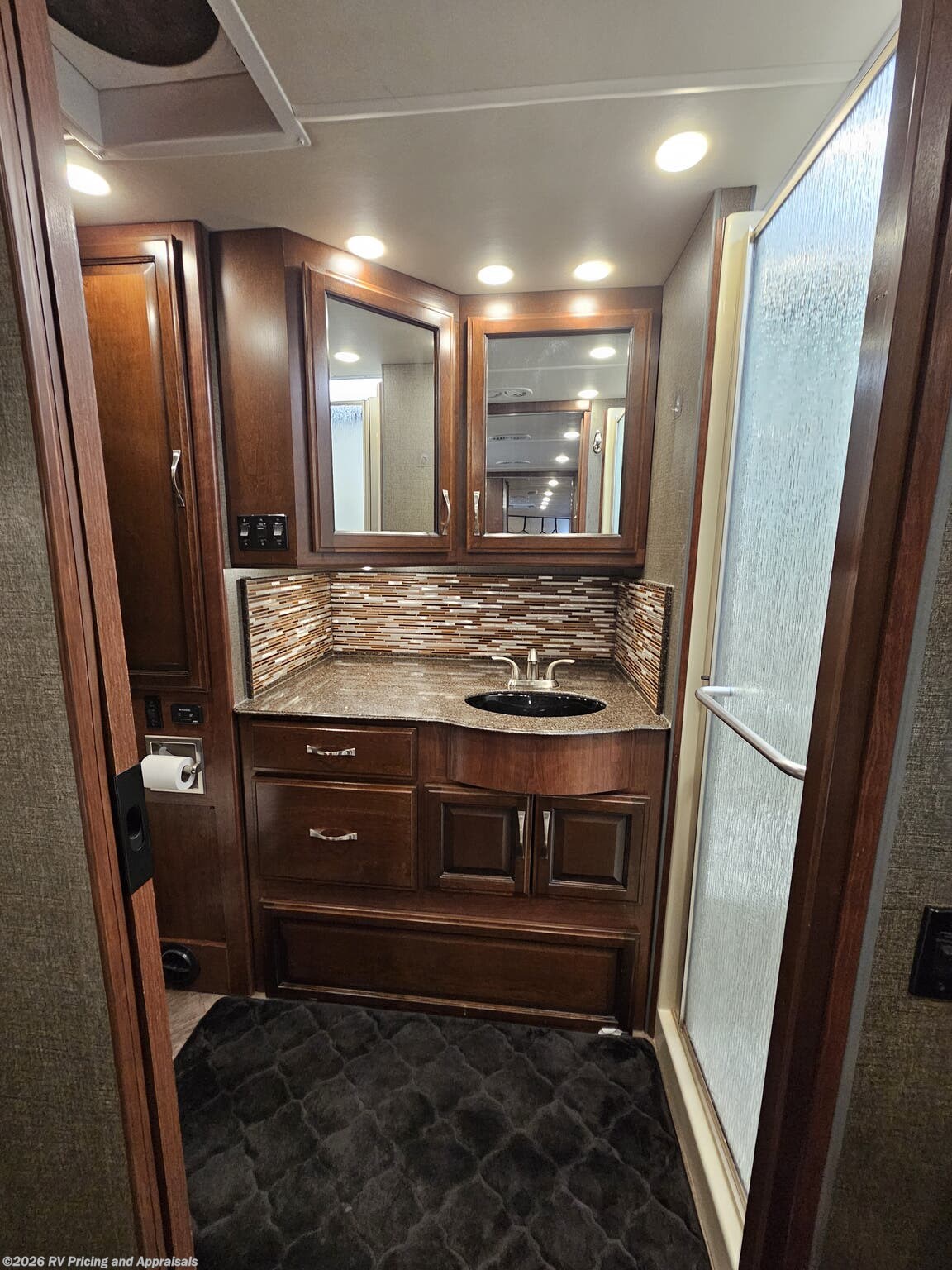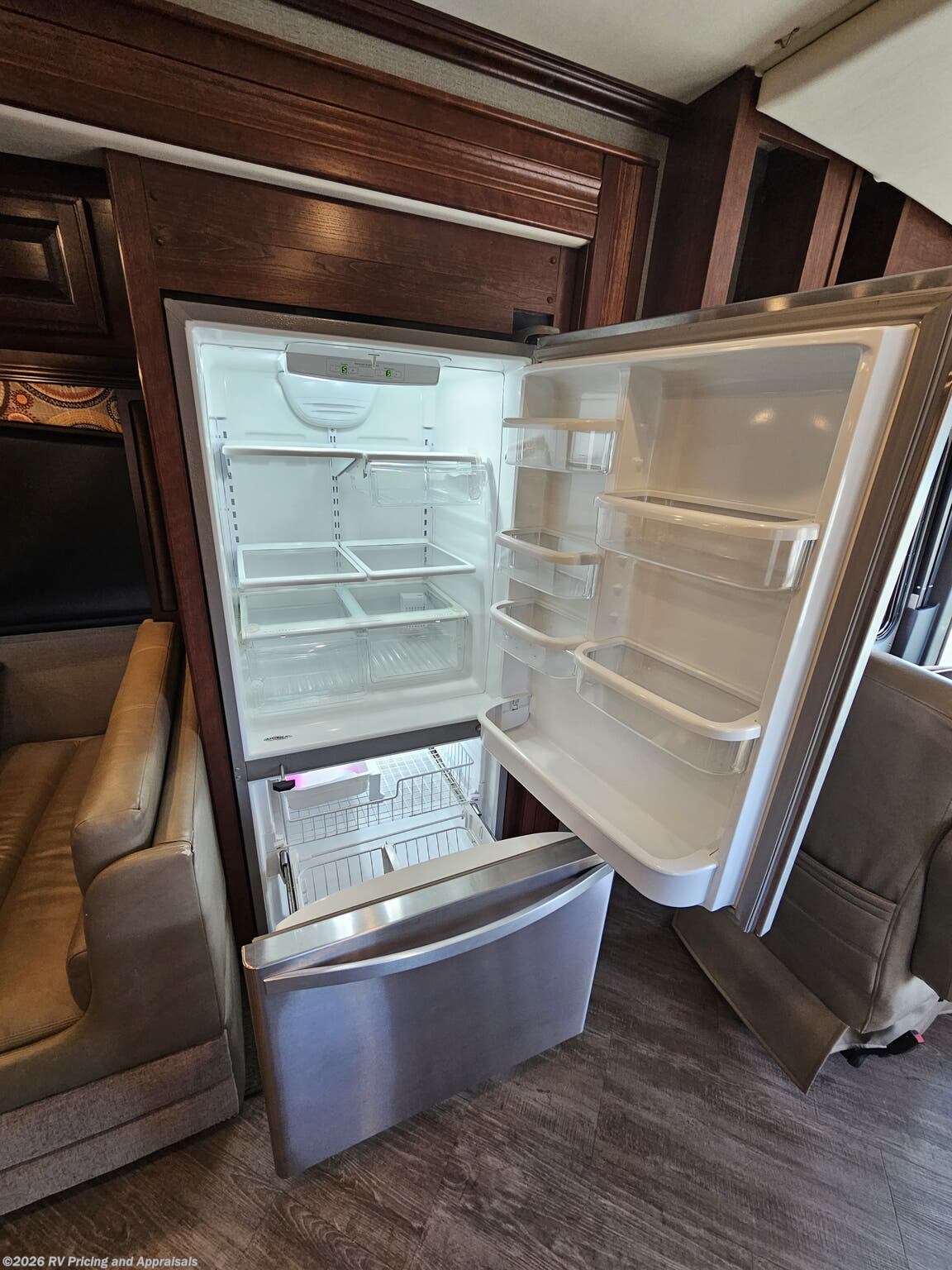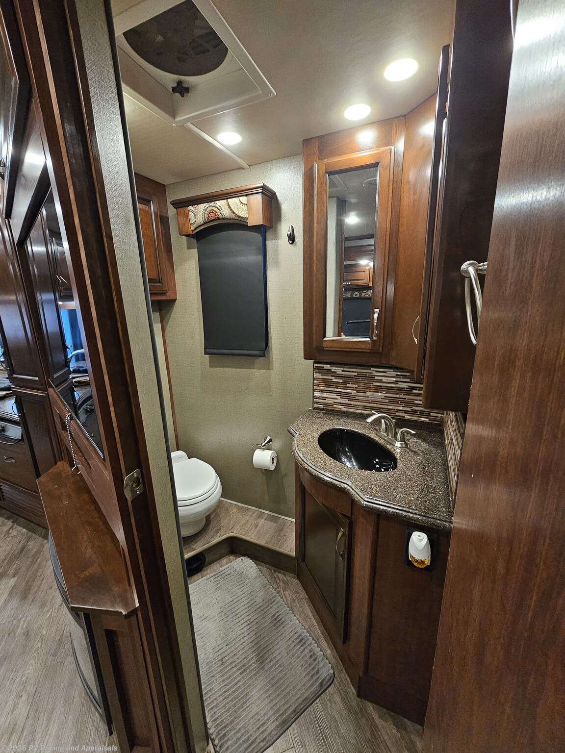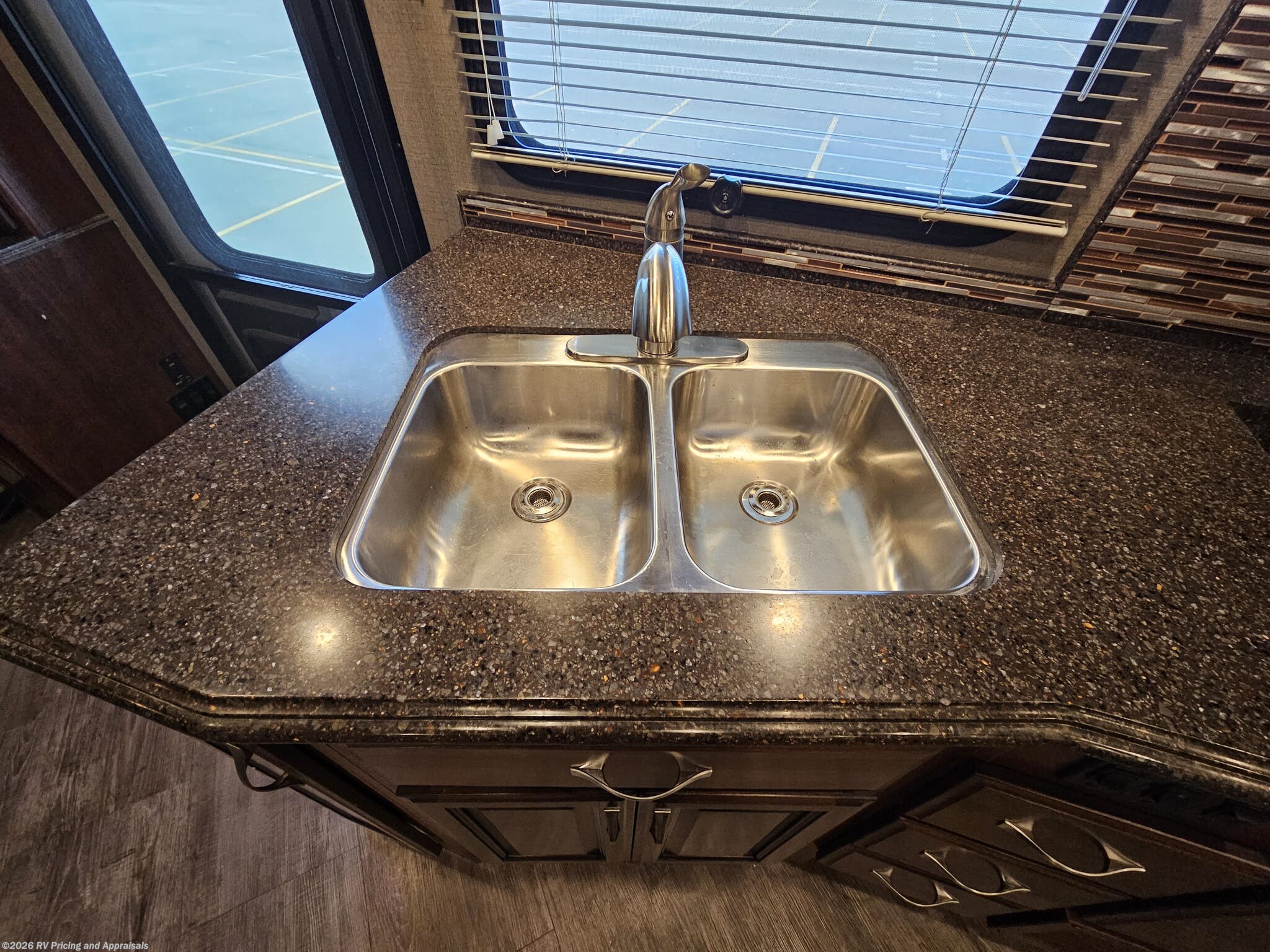 This RV has been expertly designed for maximum comfort and convenience, accommodating 4-6 people effortlessly with a king bed and a dropdown queen bed. The interior exudes warmth and hominess with a residential refrigerator freezer with ice-maker, composite plank flooring, solid surface countertops, and rich hardwood cabinetry. Enjoy additional highlights such as a welcoming fireplace, a central vacuum system, and generous storage space with massive pass-through compartments. The airy atmosphere and impressive 84-inch interior ceiling height creates a spacious and inviting environment for all your travel needs.