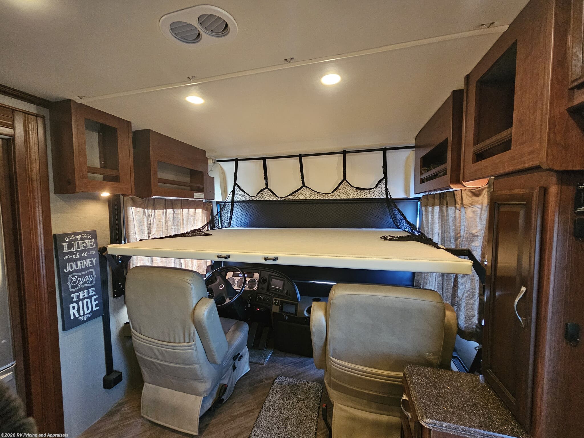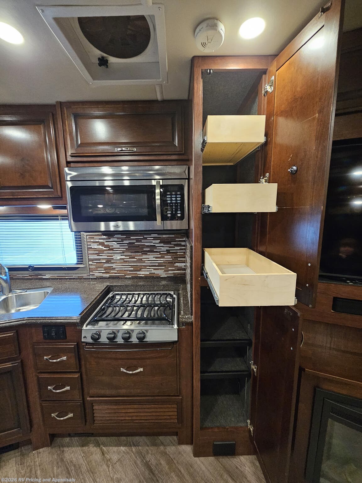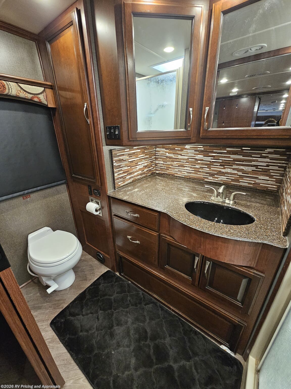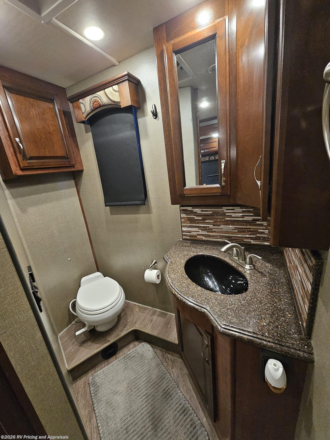 This RV has been expertly designed for maximum comfort and convenience, accommodating 4-6 people effortlessly with a king bed and a dropdown queen bed. The interior exudes warmth and hominess with a residential refrigerator freezer with ice-maker, composite plank flooring, solid surface countertops, and rich hardwood cabinetry. Enjoy additional highlights such as a welcoming fireplace, a central vacuum system, and generous storage space with massive pass-through compartments. The airy atmosphere and impressive 84-inch interior ceiling height creates a spacious and inviting environment for all your travel needs.