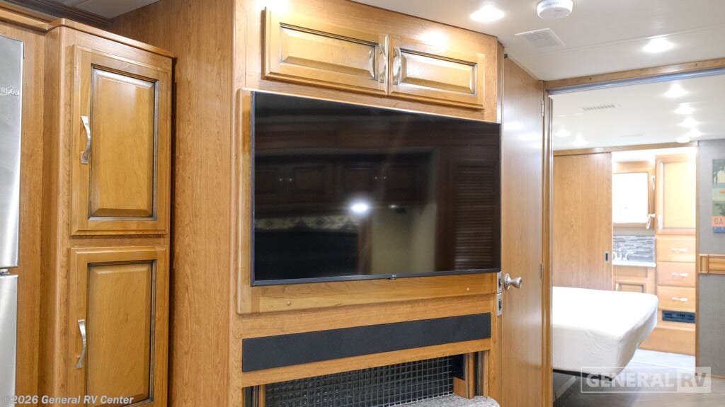 One and a half baths, a king size Articulating Serenity Series bed, and a full wall slide out are what makes this Pace Arrow LXE class A model by Fleetwood special. Model 38K provides everything you need to have a wonderful experience traveling the countryside. Step inside in front of the passenger side seat. The kitchen is directly behind and features a spacious kitchen sink with counter-top extension, a three burner range, overhead microwave oven, residential size refrigerator, and storage pantry for your dry and canned goods. Along the opposite side enjoy plenty of seating with a dinette and sofa. Both can be turned into added sleeping space if needed at night, and provide ample seating during mealtime, or just hanging out. Mid coach you will find a convenient half bath with toilet and sink along the curb side. Just outside the bathroom door along the angled bath wall is a 43" LED TV and fireplace. The perfect addition for evenings when you just want to cozy up inside and enjoy a movie or relaxing time with a bit of ambiance that a fireplace provides. There is also a 32" LED TV over the cab area so you can watch in any direction. Beyond the L-sofa along the road side full slide find a storage cabinet with a stackable washer and dryer, and then the rear master bedroom and bath. Here you will enjoy two wardrobes with one being a full length, plus a 32" LED TV to finish up the slide. Along the curb side sleep comfortable on Articulating King Serenity Series bed. Nightstands can be found on either side of the bed. The master bath is at the rear of this diesel coach and features a shower with full seat and shelf, a linen cabinet, toilet, and vanity with sink, plus overhead storage, and more!