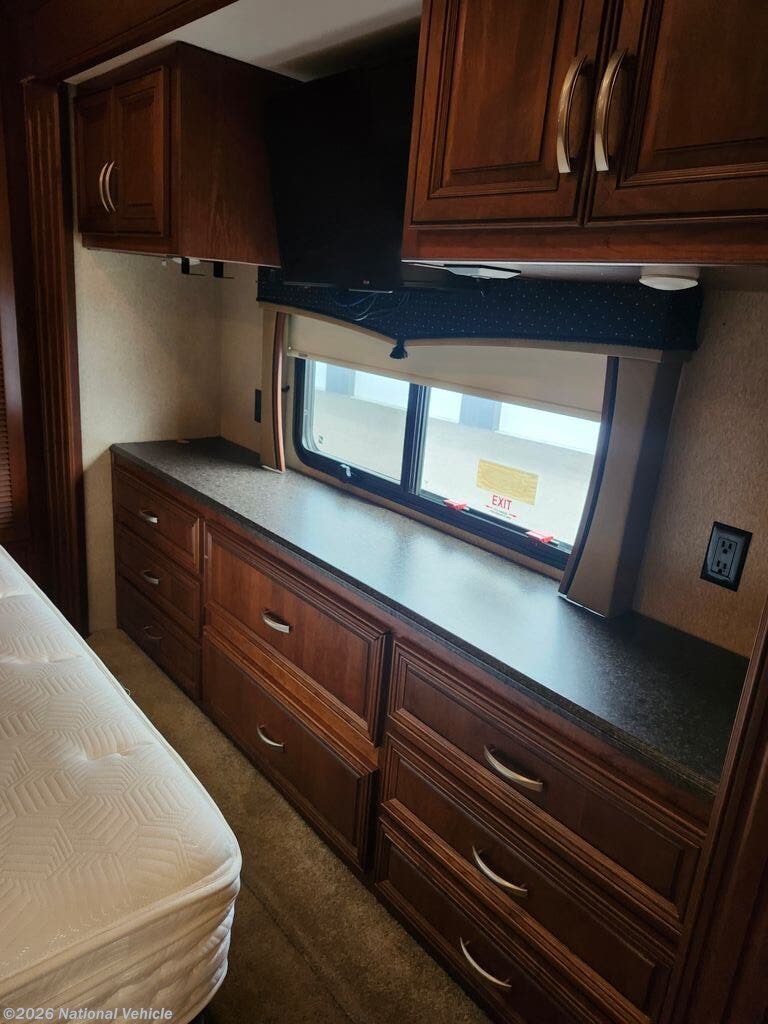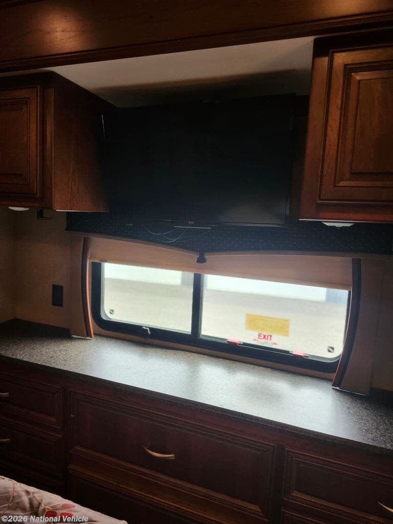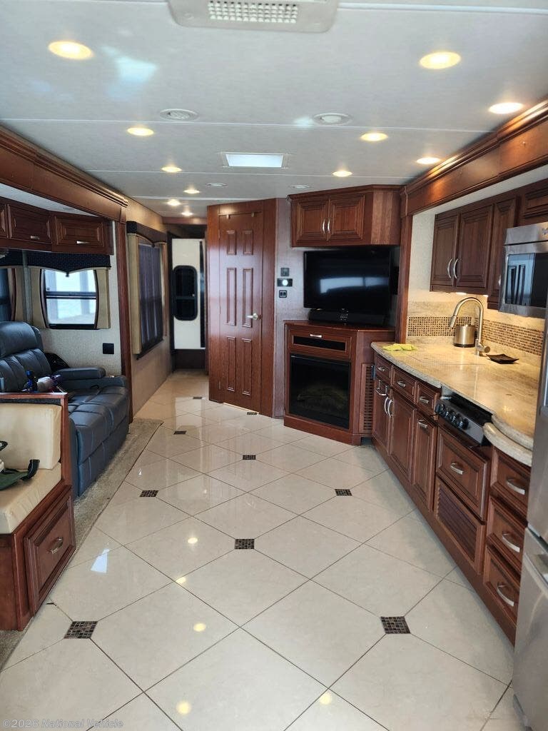 Inside, the Berkshire offers the upscale comfort and craftsmanship expected in a premium diesel pusher. The spacious living area features residential-style furnishings, elegant cabinetry, and an inviting electric fireplace, creating a warm and comfortable environment for relaxing or entertaining. Large windows bring in natural light, while the entertainment system provides the perfect setup for evenings indoors.