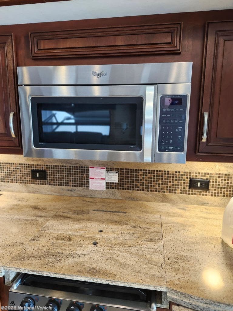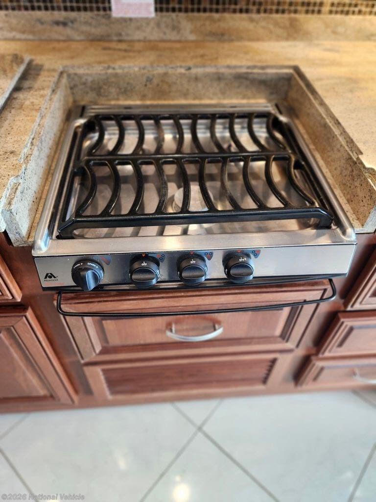 The well-appointed kitchen is designed for convenience on the road and includes solid counter space, a convection microwave oven, cooktop range, refrigerator, and abundant cabinet storage. Whether preparing quick meals or full dinners, the layout provides everything needed for extended travel.