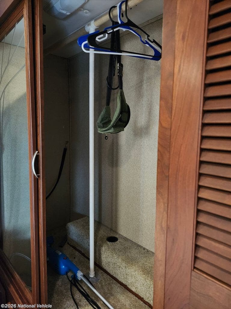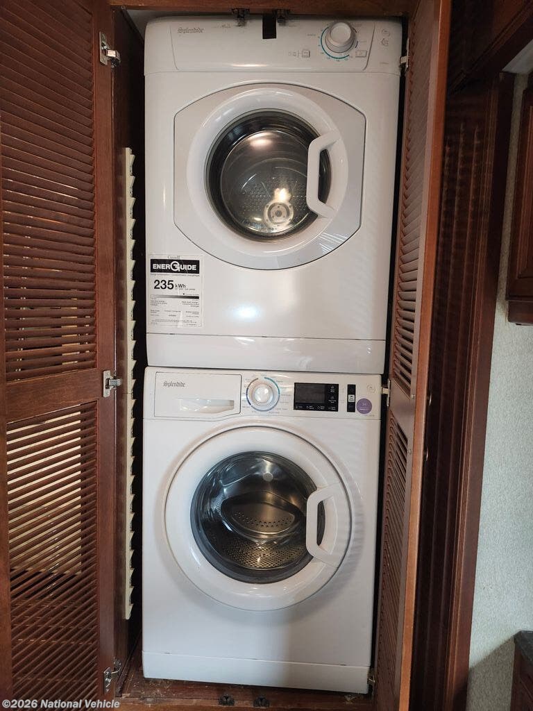 The private rear bedroom offers a king-size bed, generous wardrobe storage, and a TV for comfortable nights on the road. A washer and dryer located in the bedroom area adds the convenience of home during long trips or full-time RV living.