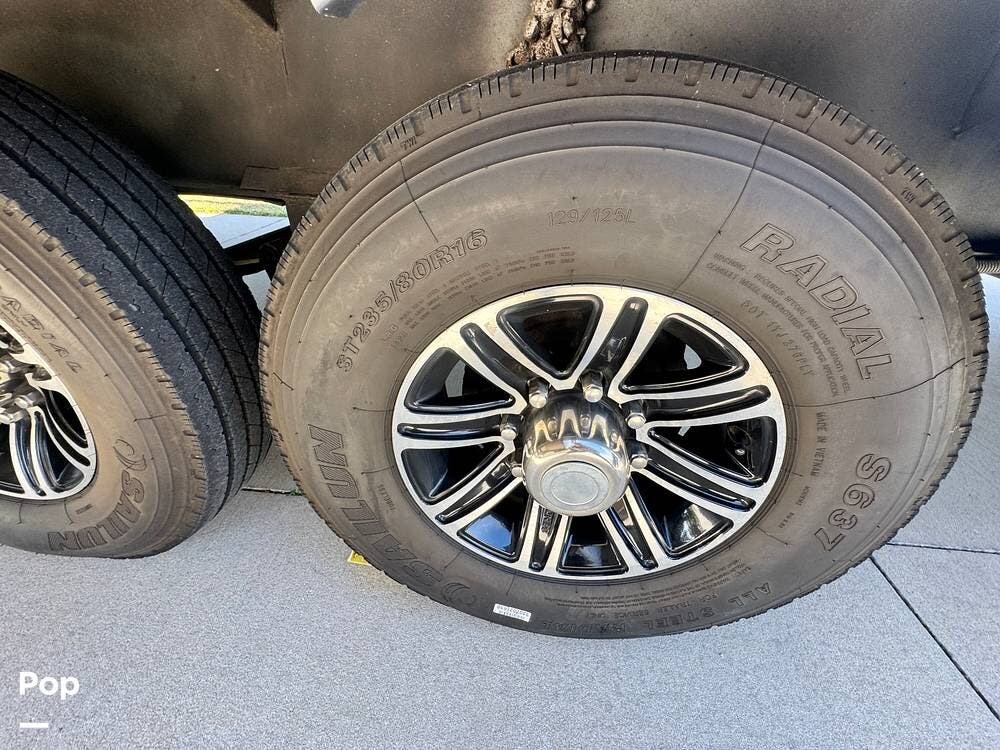 The exterior features two awnings, three slides, a rooftop digital antenna and solar prep system, two 30-pound propane tanks, a spare tire kit, tire covers, and unobstructed pass-through storage.