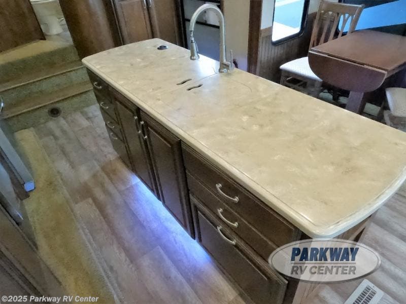 As you enter the fifth wheel, to the left is a slide with a free-standing dinette, and two recliners or you can choose optional theater seats. Along the rear wall there is a sofa hide-a-bed. The other slide has a 58" pop-up TV with a fireplace below the TV, pantry, microwave, three burner range, additional pantry, and a refrigerator. The kitchen island comes with a double kitchen sink for convenient clean up.