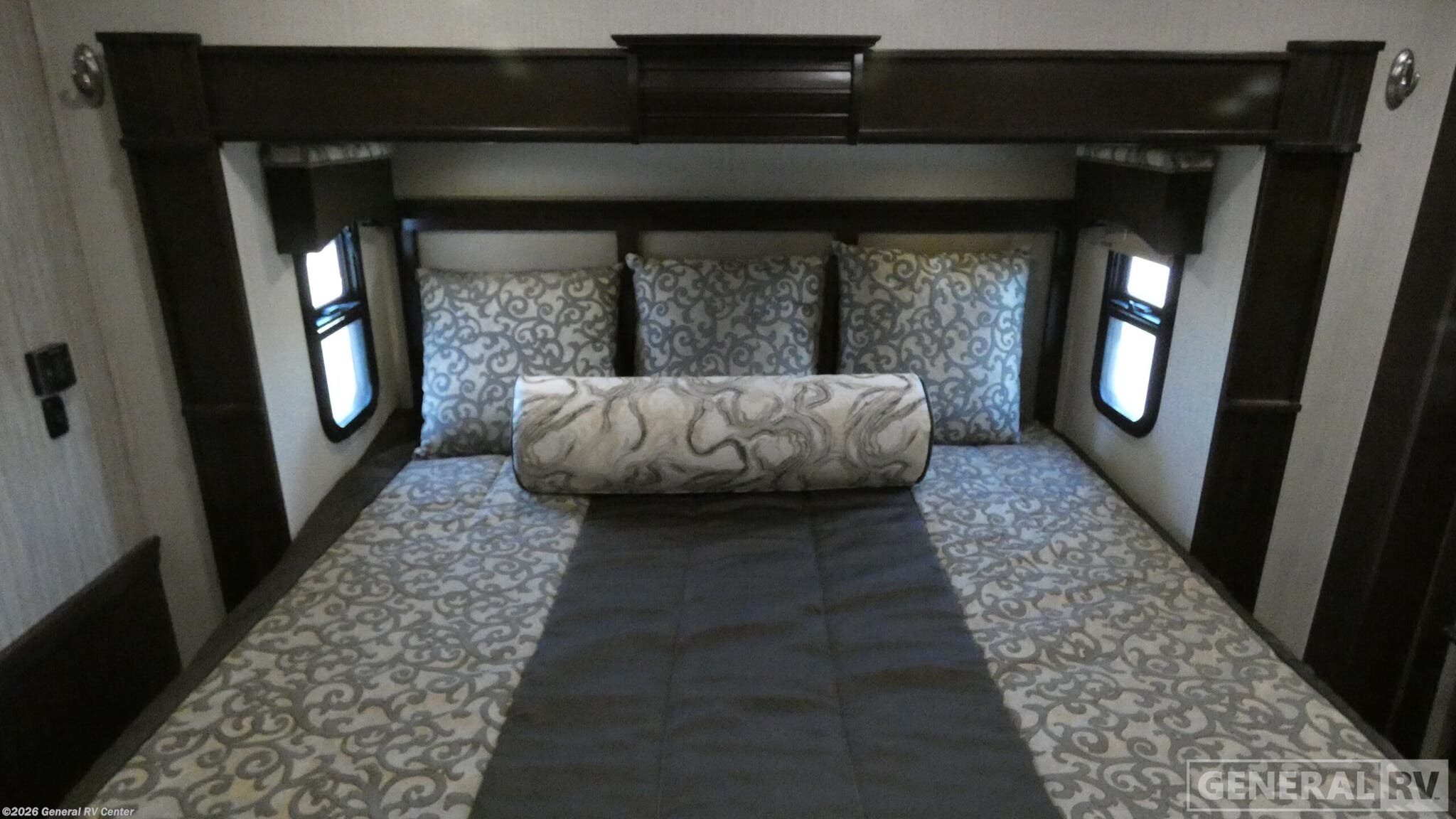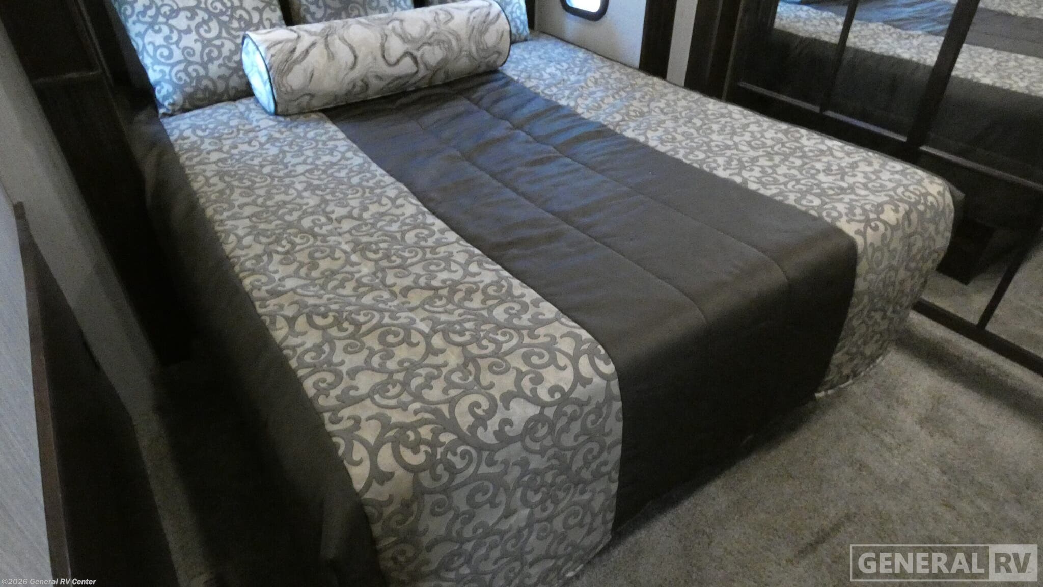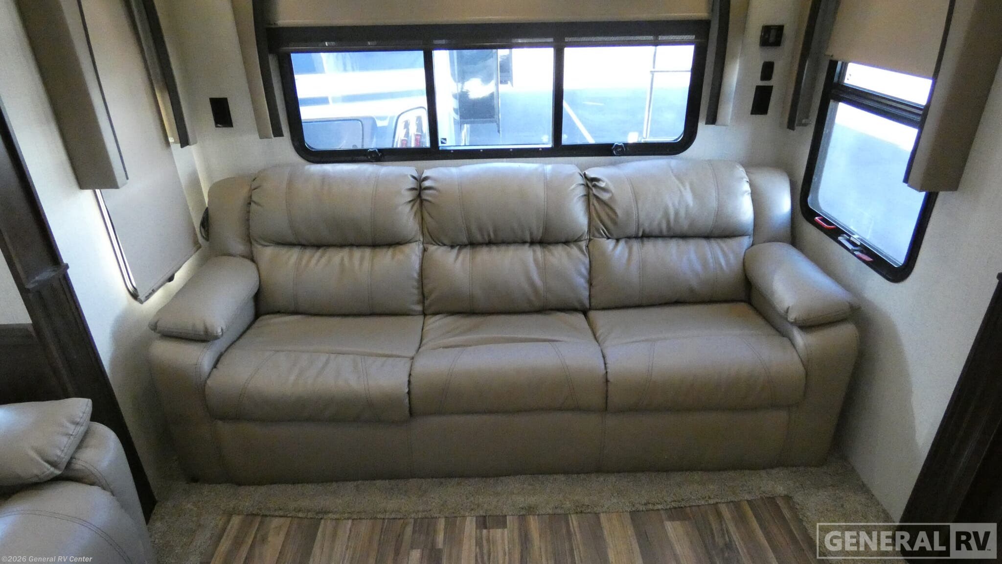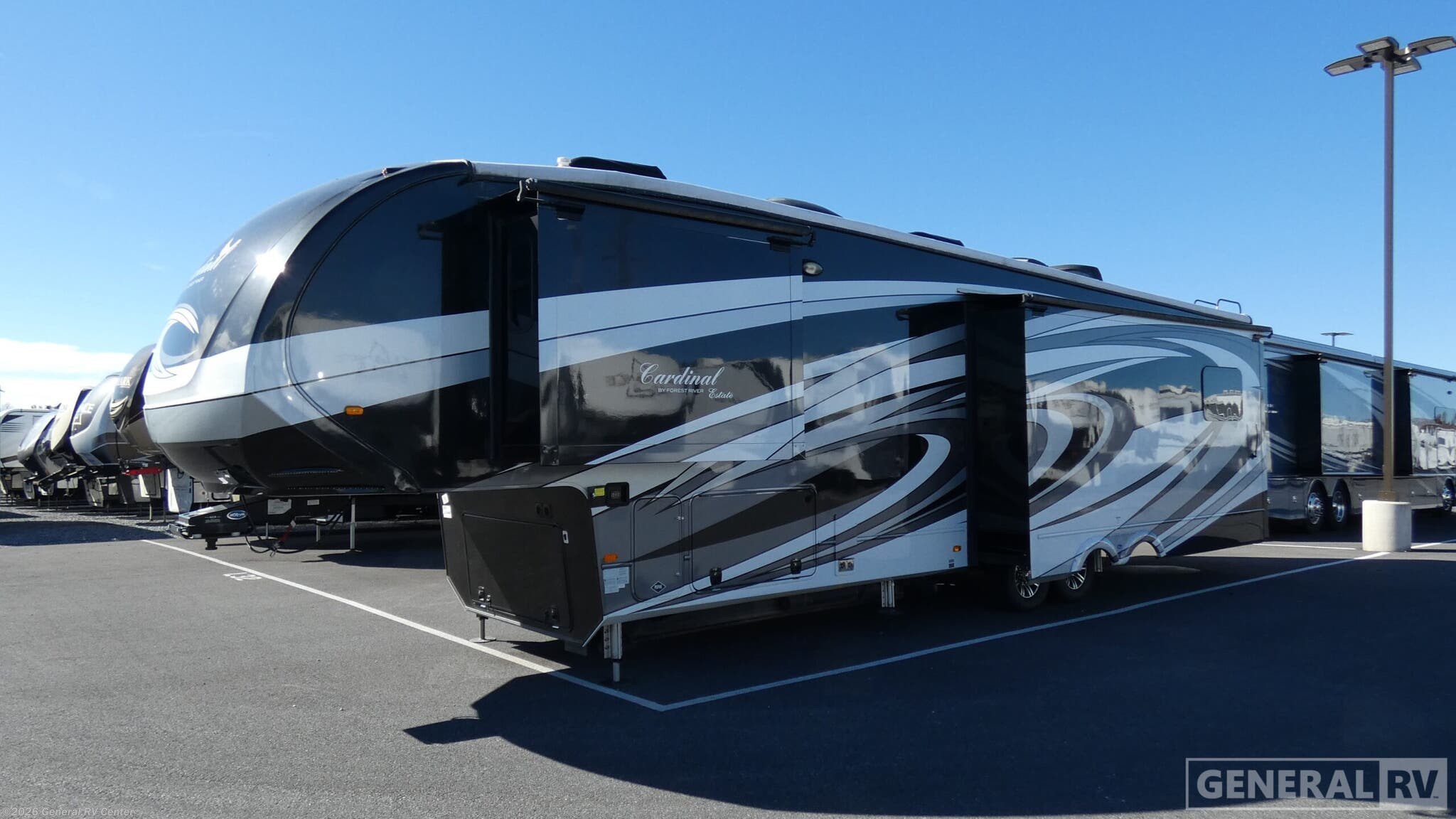 This Cardinal Estate fifth wheel model 3455RL is similar in layout to model 3850RL in that it offers a rear living area, triple slides, and a front master bedroom and bath including a king pillow-top mattress, and more. The main difference is that the bathroom is flipped over to the road side instead of along the curb side, and the bedroom slide out contains only the bed rather than a wardrobe and nightstand along side of it. Step inside and notice how open the main living space is with dual opposing slides in this already 100" wide body model. You will enjoy plenty of seating along the curb side and rear with a free standing dinette for four and theater seating to the left of the door. Adjacent along the rear wall find a sofa hide-a-bed with overhead storage for your things. This can easily be transformed into added sleeping space for two additional guests. From either of these seating areas you can view the entertainment center in the slide opposite the door side which also features the kitchen appliances. Cooking will be simple in this Cardinal Estate kitchen with a slide out three door refrigerator, a three burner cook-top, microwave oven, and pantry. The kitchen island features a double sink, plus a drawer style dishwasher so you can get back to exploring or enjoying the outdoors, rather that being stuck inside doing the dishes. Head up the steps to the right of the entry door and find a side aisle bath and front master bedroom. The bath provides a corner shower, toilet, and vanity with sink, plus overhead medicine cabinet. At the head of the hall a sliding door leads into the front master bedroom where you will sleep soundly on the king pillow-top mattress. There is storage available under the bed, as well as in the dresser opposite, and in the wardrobes along the front of the unit. Here you will find space for your hanging clothes, plus drawers and shelves for the rest of your belongings. There is even a space prepped for a washer and dryer if you choose to add, plus so much more!