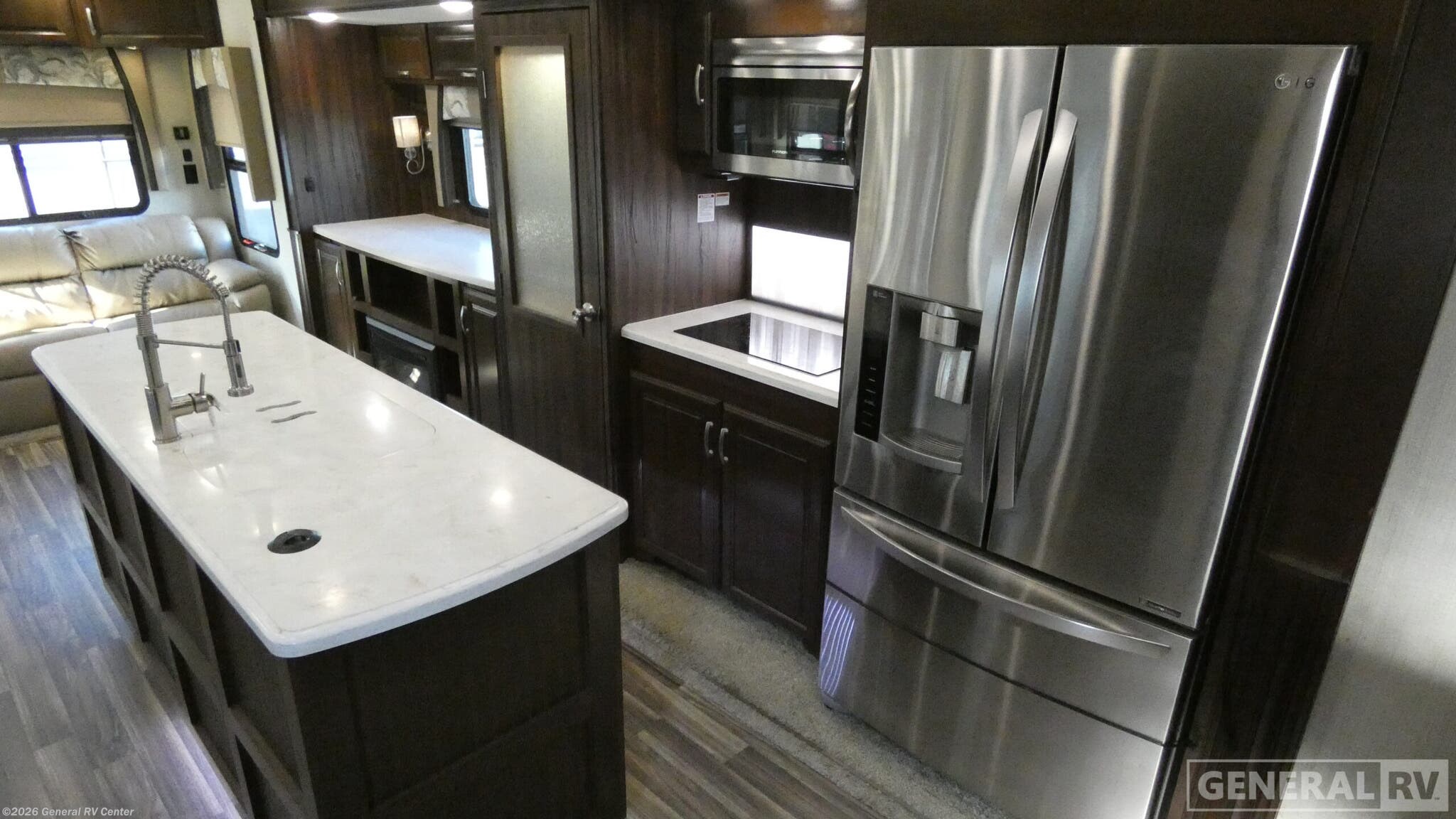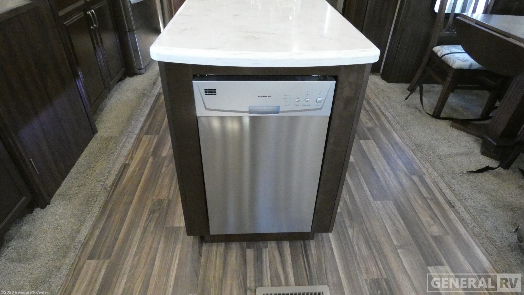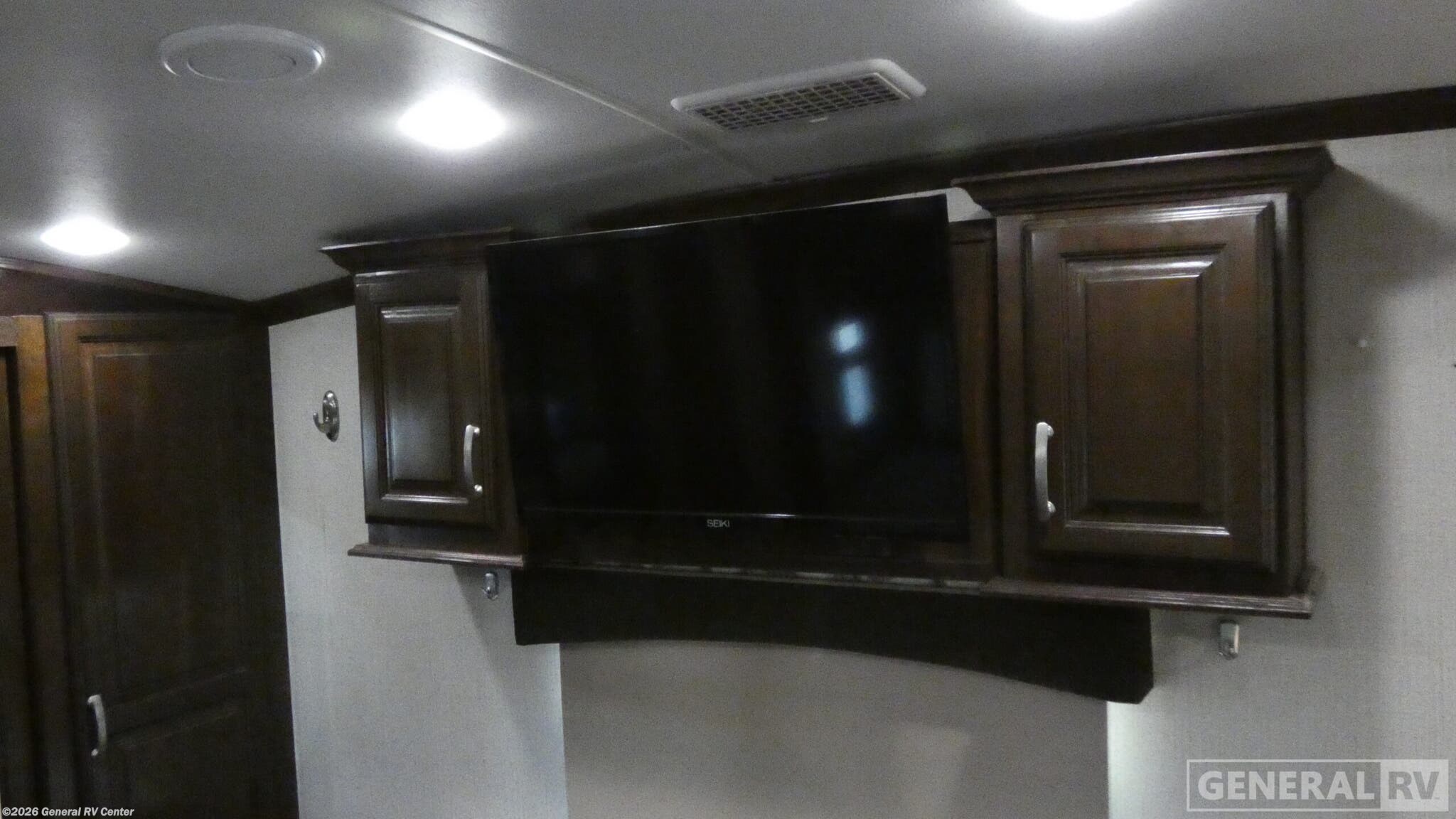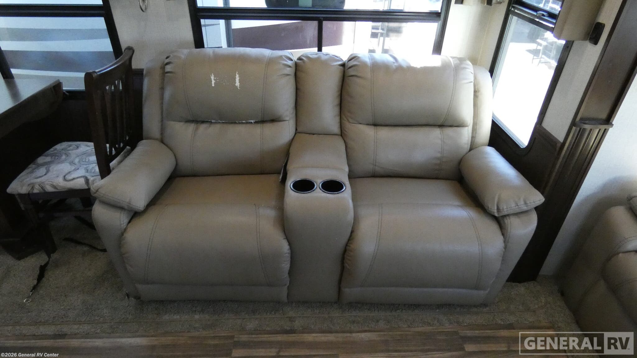 This Cardinal Estate fifth wheel model 3455RL is similar in layout to model 3850RL in that it offers a rear living area, triple slides, and a front master bedroom and bath including a king pillow-top mattress, and more. The main difference is that the bathroom is flipped over to the road side instead of along the curb side, and the bedroom slide out contains only the bed rather than a wardrobe and nightstand along side of it. Step inside and notice how open the main living space is with dual opposing slides in this already 100" wide body model. You will enjoy plenty of seating along the curb side and rear with a free standing dinette for four and theater seating to the left of the door. Adjacent along the rear wall find a sofa hide-a-bed with overhead storage for your things. This can easily be transformed into added sleeping space for two additional guests. From either of these seating areas you can view the entertainment center in the slide opposite the door side which also features the kitchen appliances. Cooking will be simple in this Cardinal Estate kitchen with a slide out three door refrigerator, a three burner cook-top, microwave oven, and pantry. The kitchen island features a double sink, plus a drawer style dishwasher so you can get back to exploring or enjoying the outdoors, rather that being stuck inside doing the dishes. Head up the steps to the right of the entry door and find a side aisle bath and front master bedroom. The bath provides a corner shower, toilet, and vanity with sink, plus overhead medicine cabinet. At the head of the hall a sliding door leads into the front master bedroom where you will sleep soundly on the king pillow-top mattress. There is storage available under the bed, as well as in the dresser opposite, and in the wardrobes along the front of the unit. Here you will find space for your hanging clothes, plus drawers and shelves for the rest of your belongings. There is even a space prepped for a washer and dryer if you choose to add, plus so much more!