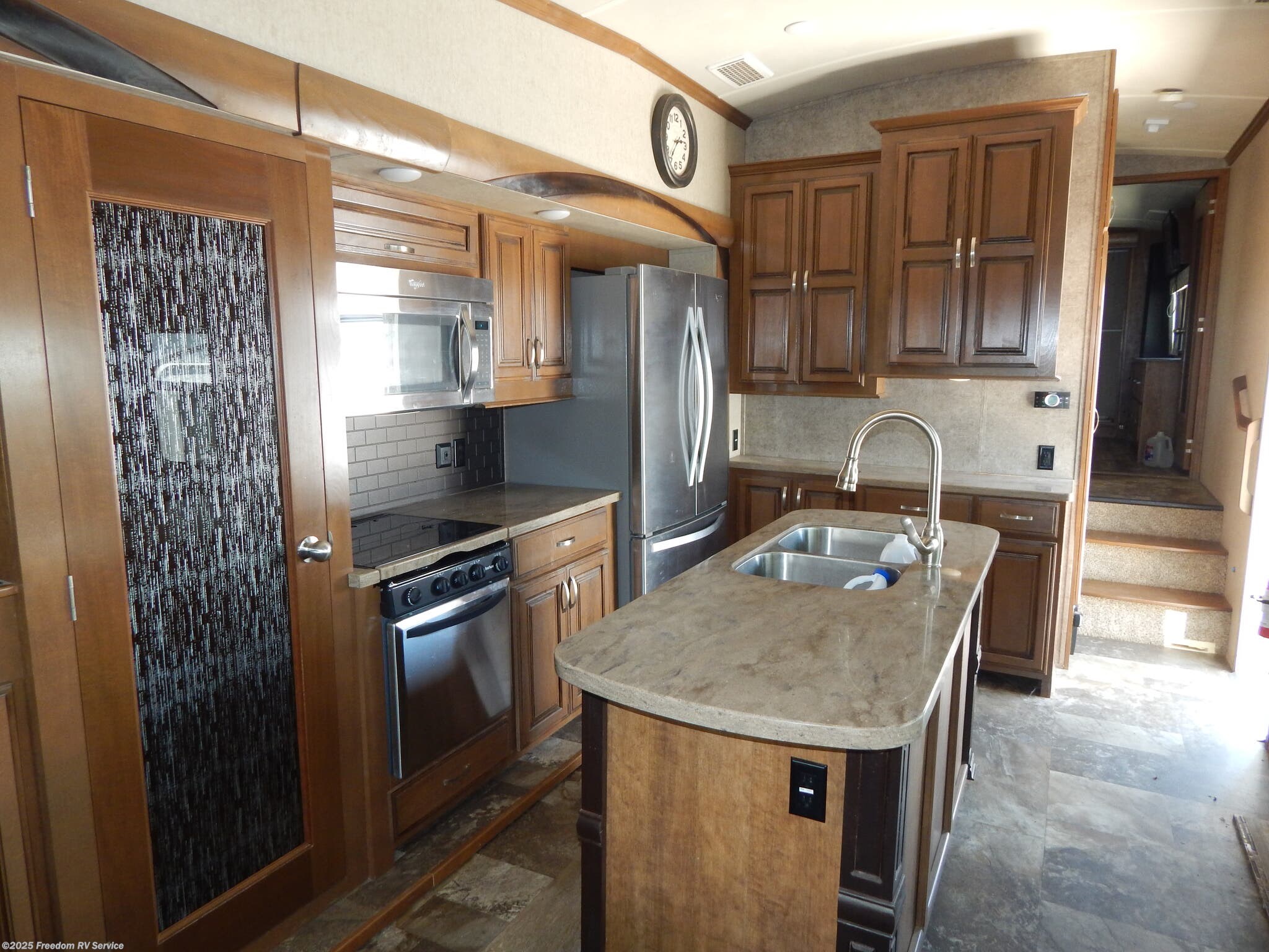 This travel trailer is packed with high-end features to ensure a comfortable journey. It includes a large refrigerator and a microwave, oven, and stove top burner for meal preparation. The interior boasts a centrally controlled air conditioning system, ceiling fans, and a power roof vent, providing a cool and well-ventilated living space. Additional conveniences include a central vacuum system, medicine cabinet, and skylight, enhancing overall comfort and functionality.