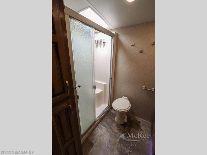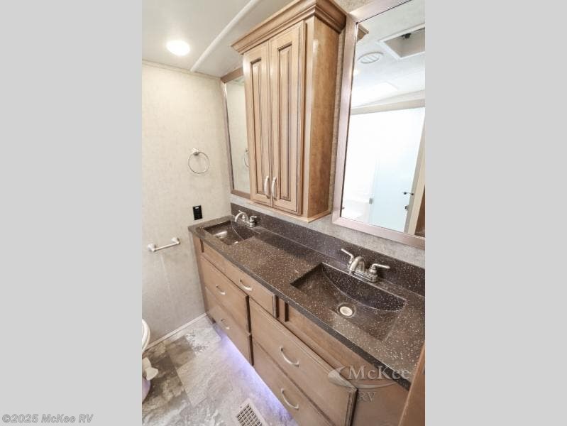 Up the steps towards the front of the fifth wheel find a full bathroom on your left. It includes a vanity with two sinks, a medicine cabinet, a nice size shower with seat, toilet, and overhead cabinet.