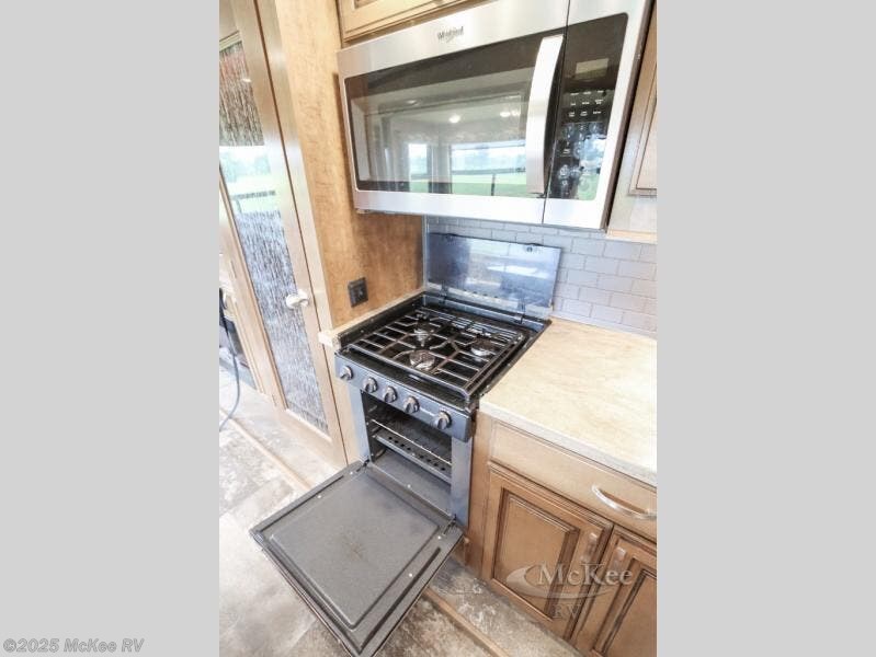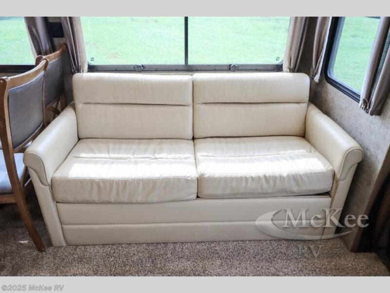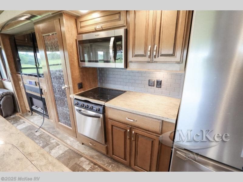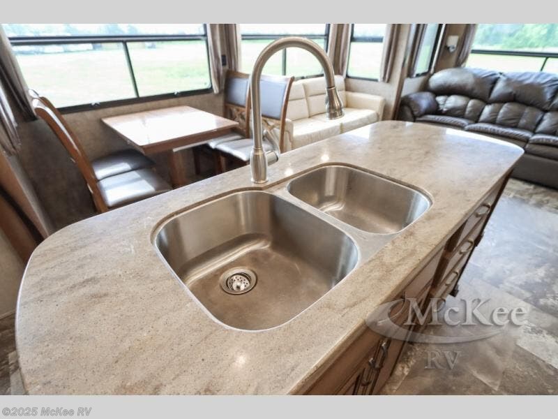 Two generous slide outs are located in the main living/kitchen area right inside the door. To your immediate left as you step inside find a slide out which offers a free standing dinette and two chairs, plus two lounge chairs. Along the rear wall you will find a sofa, plus overhead cabinets that run the entire width of the unit. Continuing around to the road side, another slide out features a fireplace and an entertainment center. This slide also features the kitchen appliances.