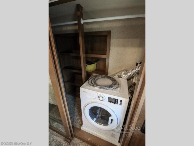 The private front bedroom offers a queen bed slide out with a shelf on either side, or you can choose an optional king size bed if you need a bit more sleeping space. There is also a dresser opposite of the bed along the curb side wall, and a full width wardrobe with shelves and drawers for all of your storage needs. In corner of the wardrobe you will find that it has been washer/dryer prepped for your convenience, plus so much more.