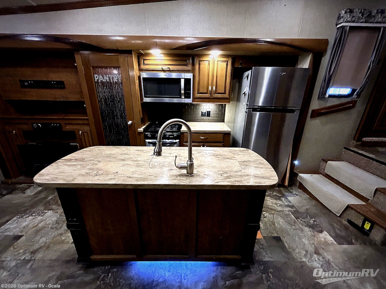 When it comes to cooking while you travel this Cedar Creek Hathaway model has you covered. There is a pantry, a three burner range including microwave oven, extra counter space, and a refrigerator all within the slide. In the center of the kitchen you will find a handy island that includes a double sink for cleaning up, and you can add an optional dishwasher so you can spend more time relaxing while letting the dishwasher do your cleaning!