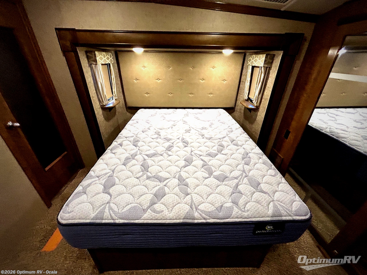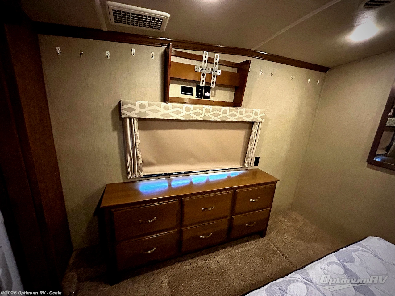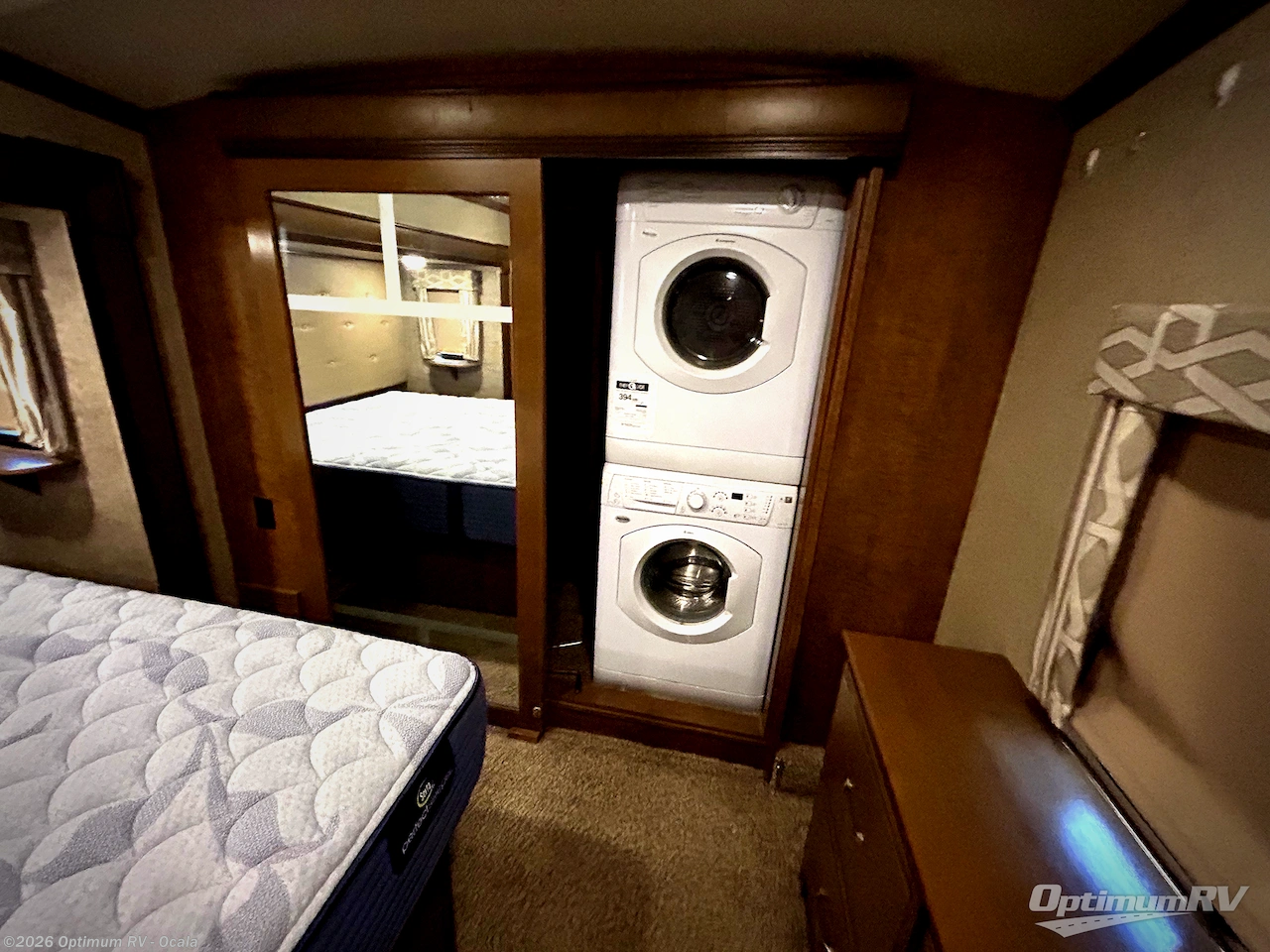 In the bedroom you will find a queen bed and nightstands that are part of the bedroom slide. If you like you can choose a king size bed in place of the queen. Opposite along the curb side there is a dresser with TV above, and a front wardrobe with sliding doors for all of your clothing needs including shelves, and a washer/dryer prep, plus so much more!