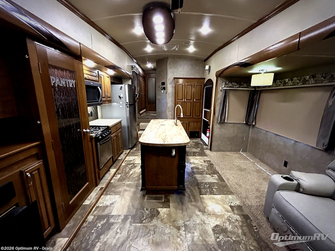 Step inside and notice how open it feels thanks to dual opposing slides in this area. To the left there is a free standing dinette with two chairs, and two lounge chairs. Along the rear wall there is a sofa, plus storage above to keep things neatly tucked away and organized. Adjacent to the sofa is a second slide out along the road side that features an entertainment center with fireplace. This slide also features the kitchen appliances.