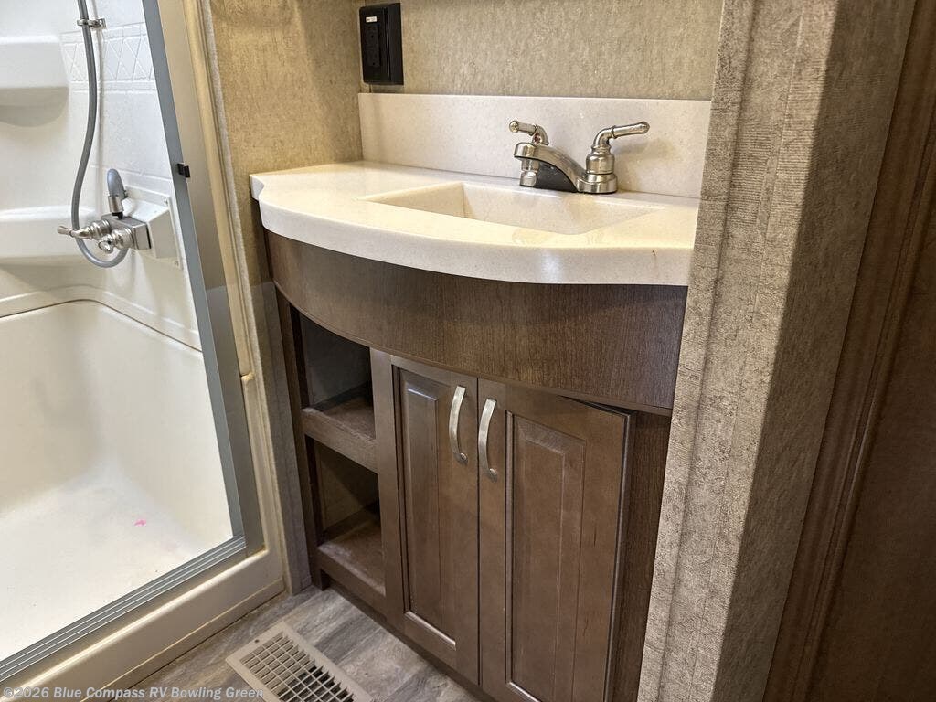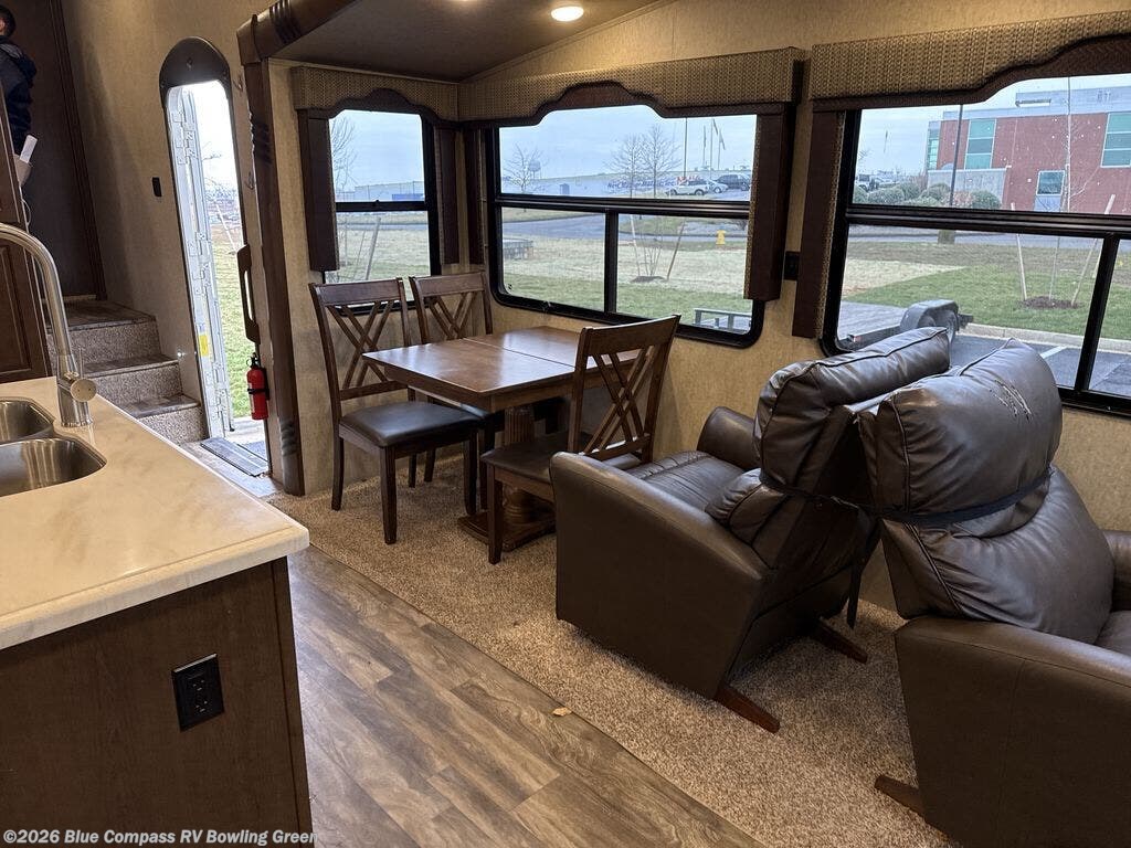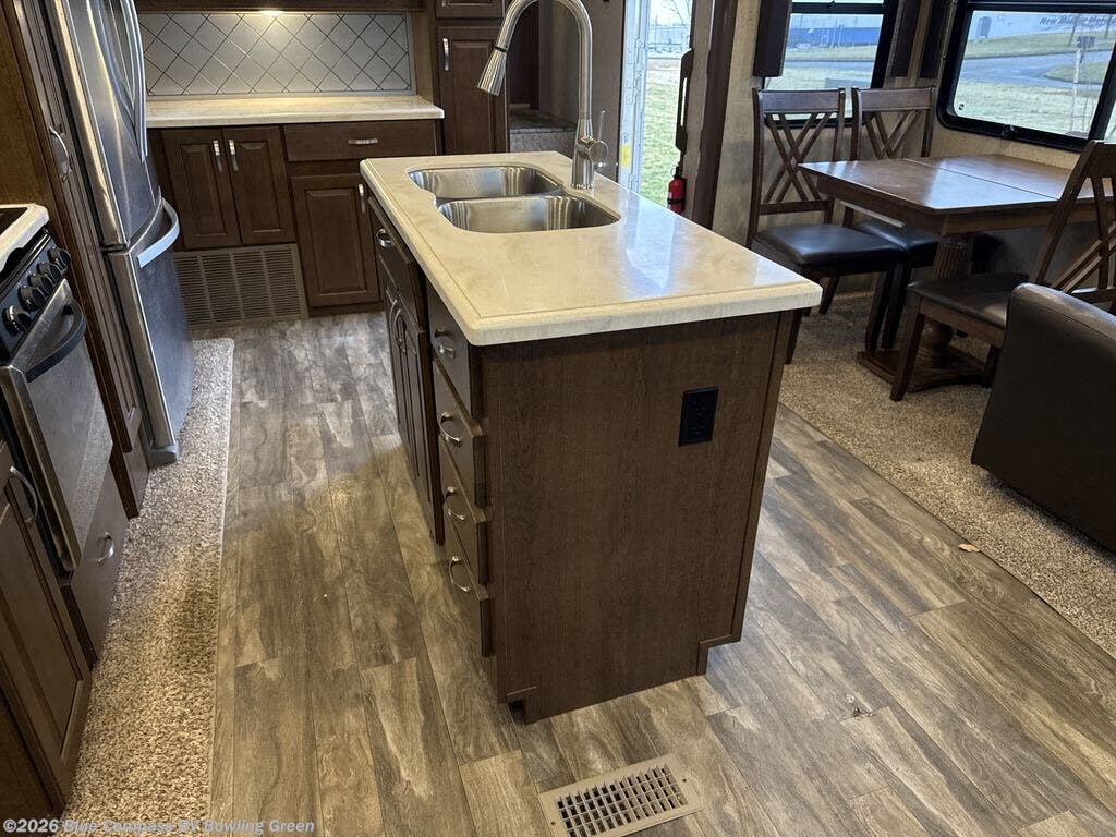Step inside and see how much space there is to enjoy with dual opposing slides in the main living and kitchen area. To the left of the entrance there is a slide with a free-standing dinette and four chairs. Along the rear wall you will find a sofa with end tables on either side, plus more storage overhead. There is another slide with a TV, fireplace, and the kitchen appliances that includes a three burner range, microwave, pantry, and refrigerator. Along the front wall of the kitchen area you will find extra counter space and a closet. The island also offers added counter space, which you are sure to enjoy for meal prep, as well as a double kitchen sink.